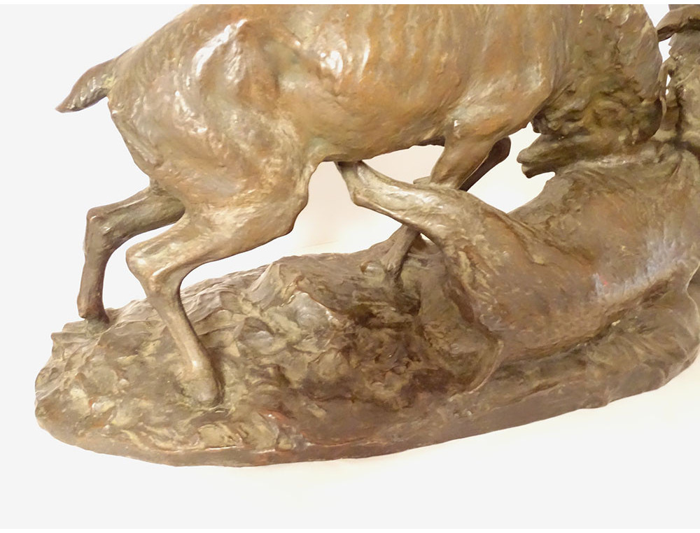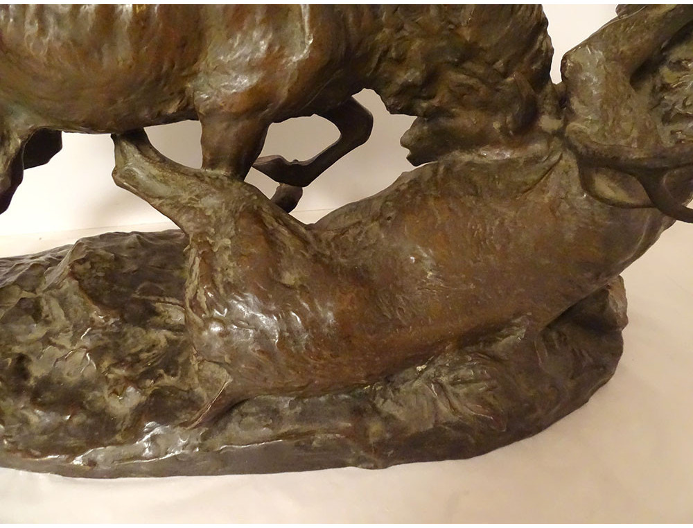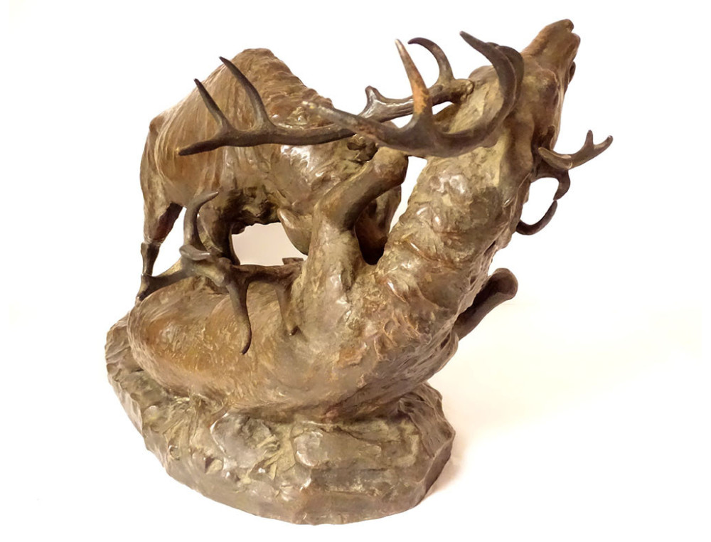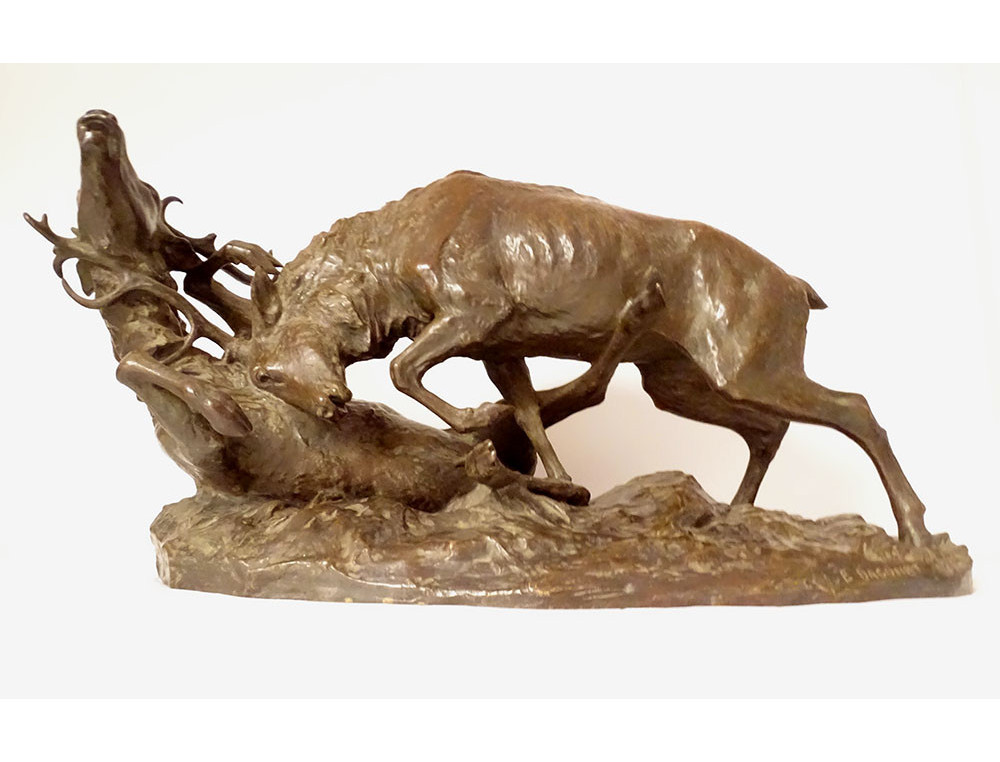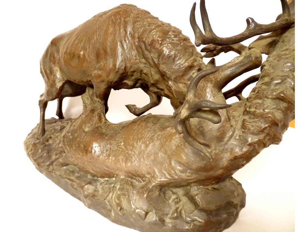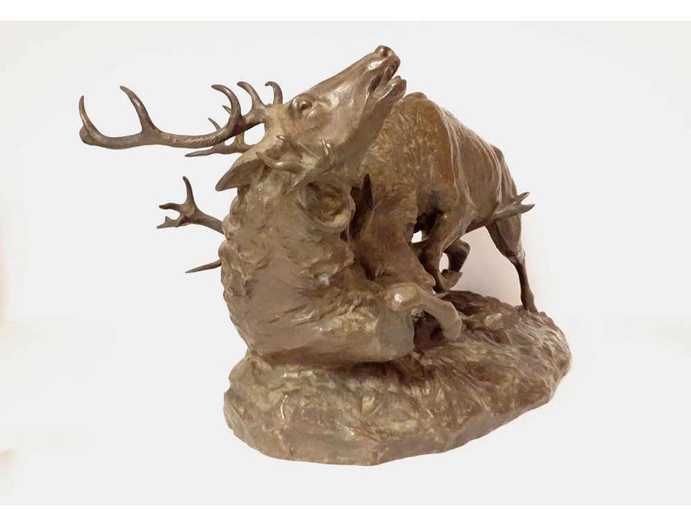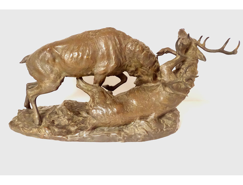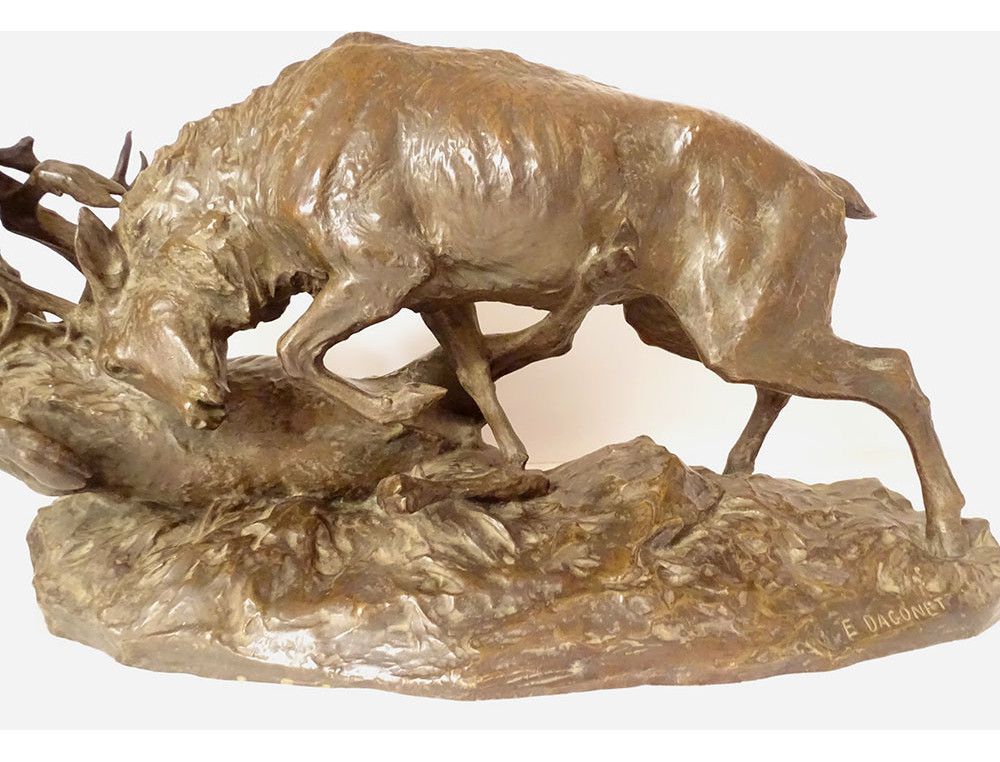 Large bronze sculpture by Ernest Dagonet, depicting deer fighting, 19th century animal sculptor