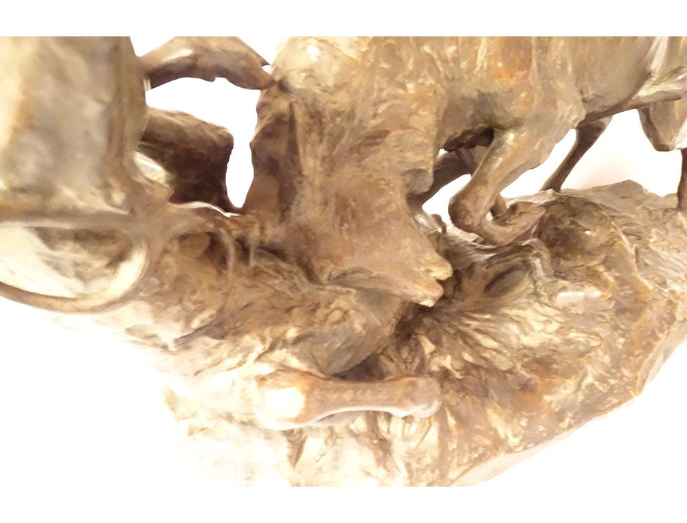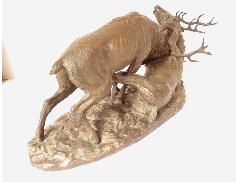Large bronze sculpture with brown-green patina depicting a deer fight: with two rutting deer facing each other head-on in a violent duel, signed Dagonet*, from the late 19th-early 20th centuries.