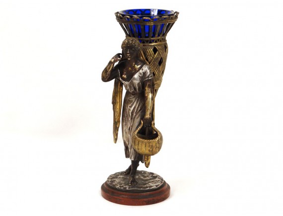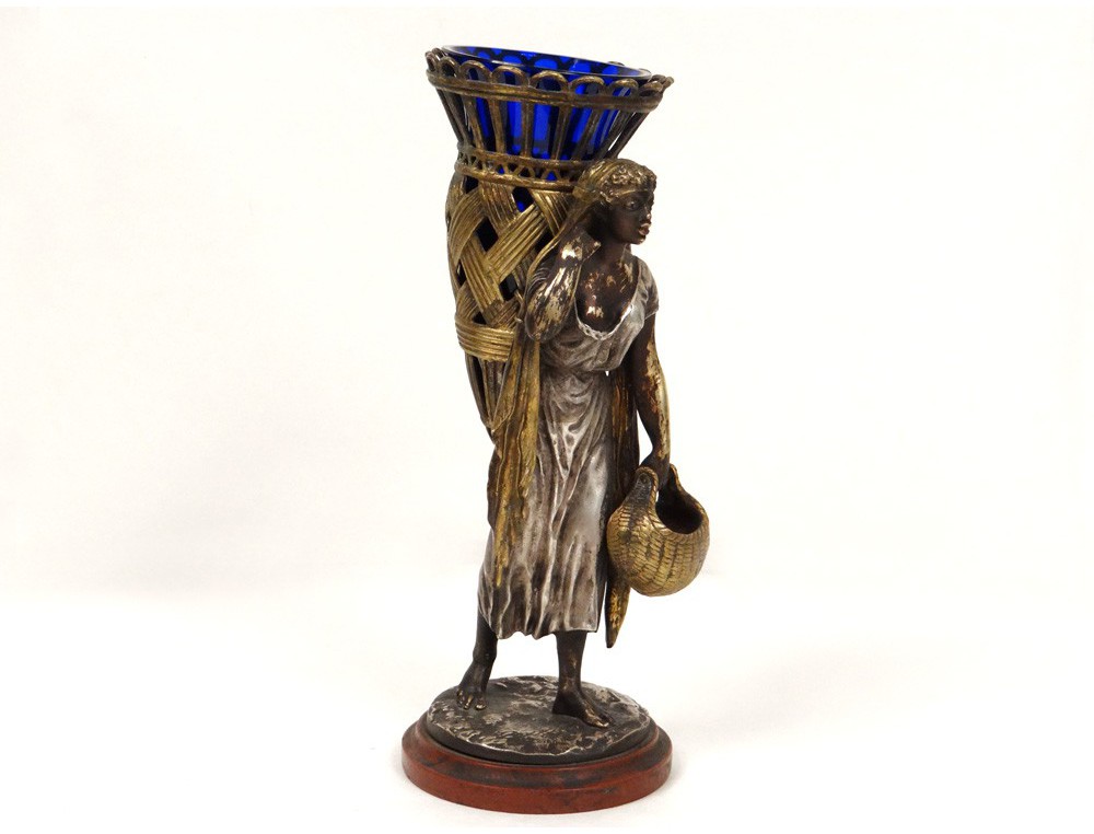 Gorgeous silver bronze sculpture orientalist, gold and black patina finely chiseled, representing a black woman carrying two wicker baskets, one on the shoulders, the other hand, signed L.Kley * the basket forming a vase in his back (with a blue glass) marble base, the nineteenth century era.