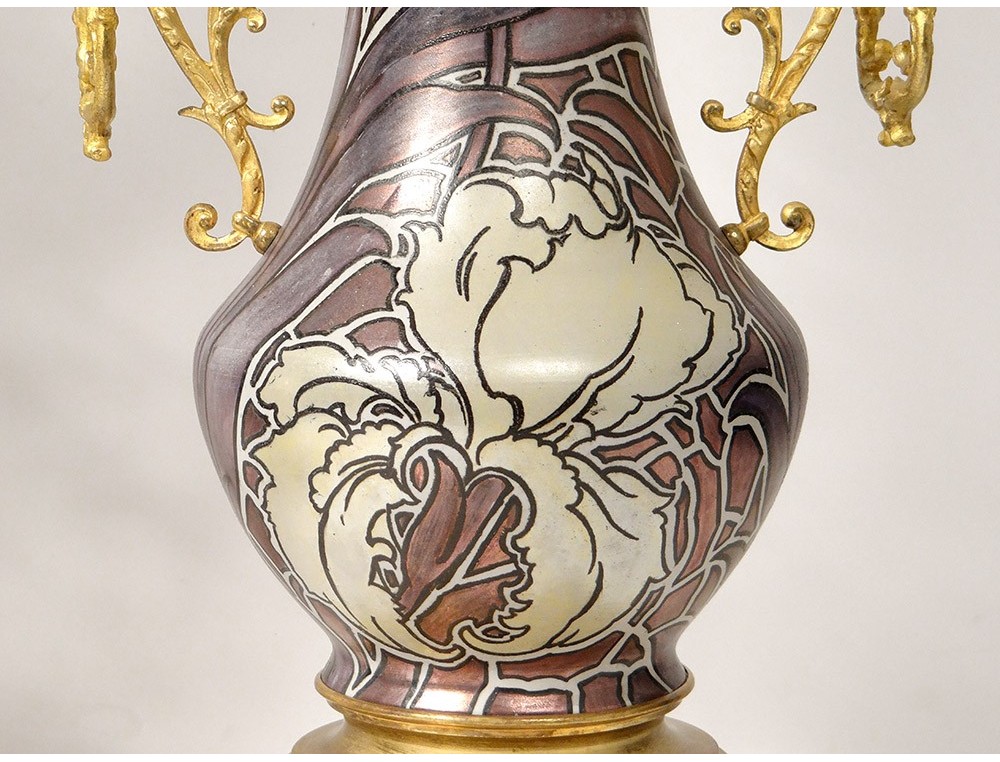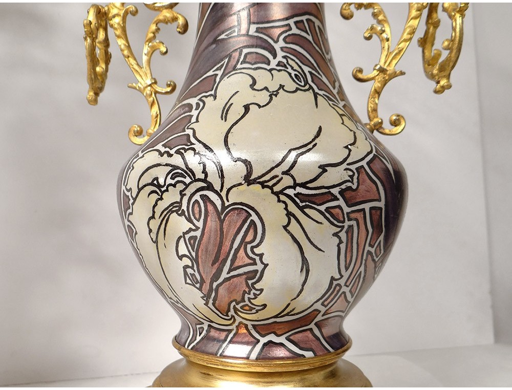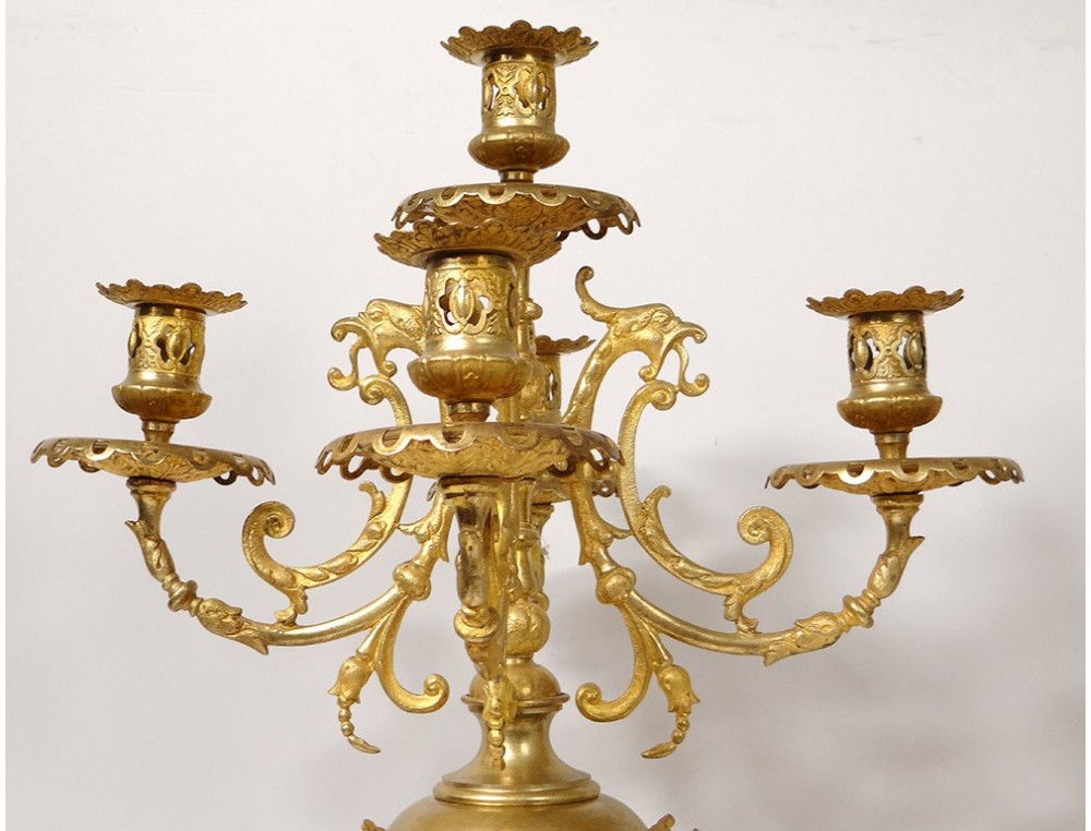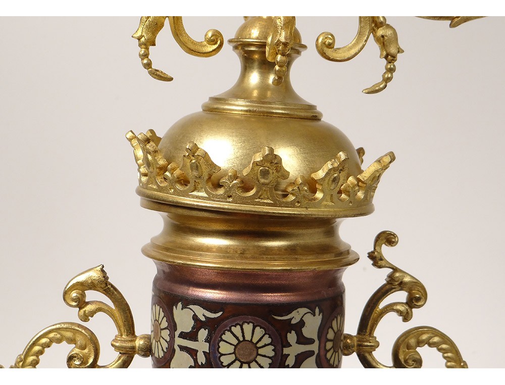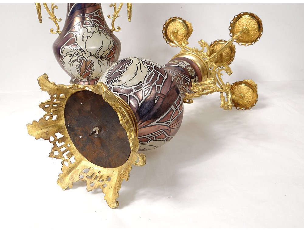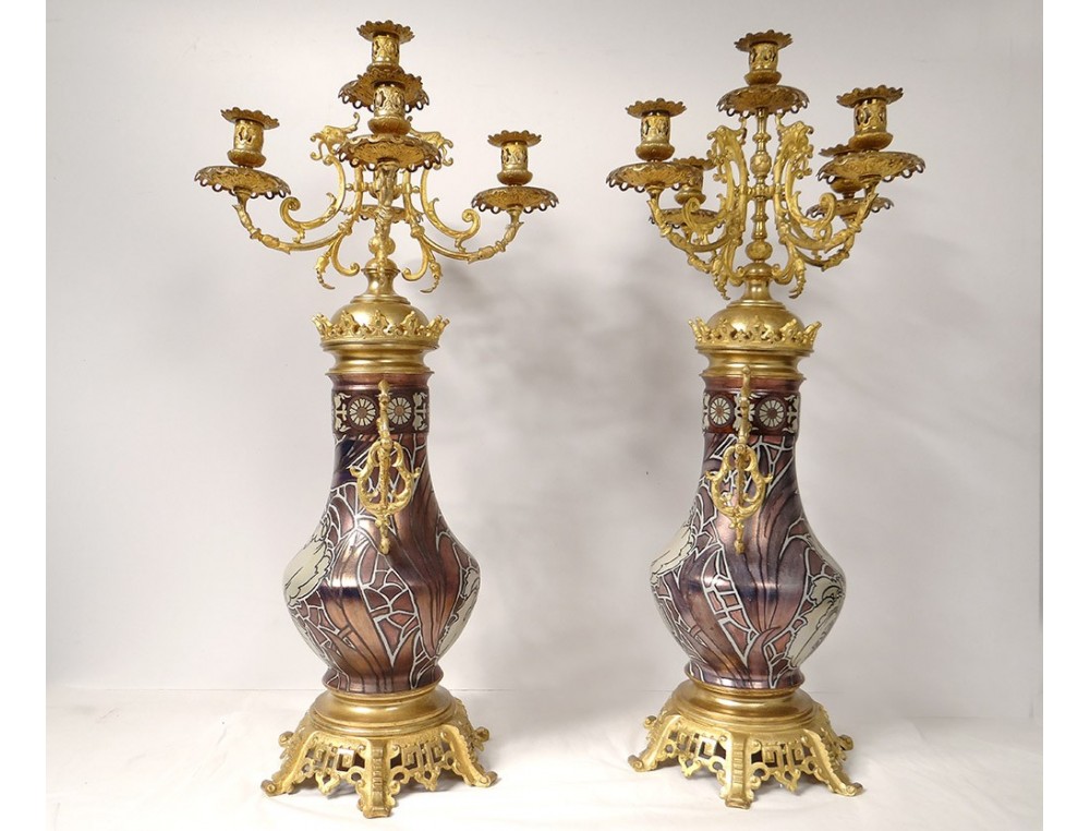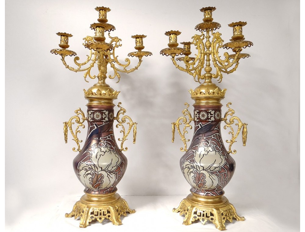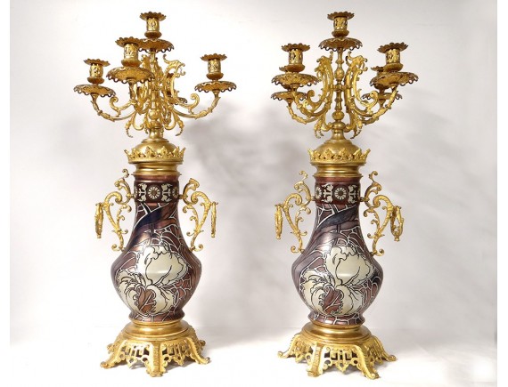 Pair of large candelabra 5 fires, finely chiseled gilt bronze and openwork decorated with arabesques and phoenix heads, body shaped vase baluster polycrome porcelain decorated with stylized flowers, with leafy handles, period around 1880 Art Nouveau late nineteenth century.