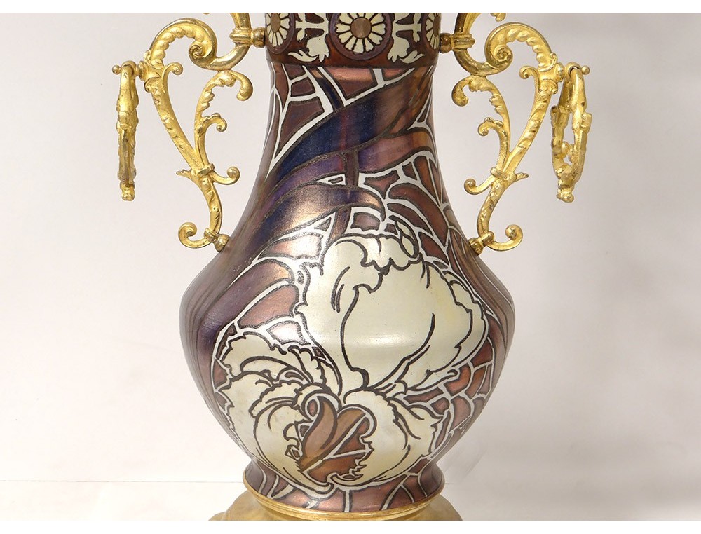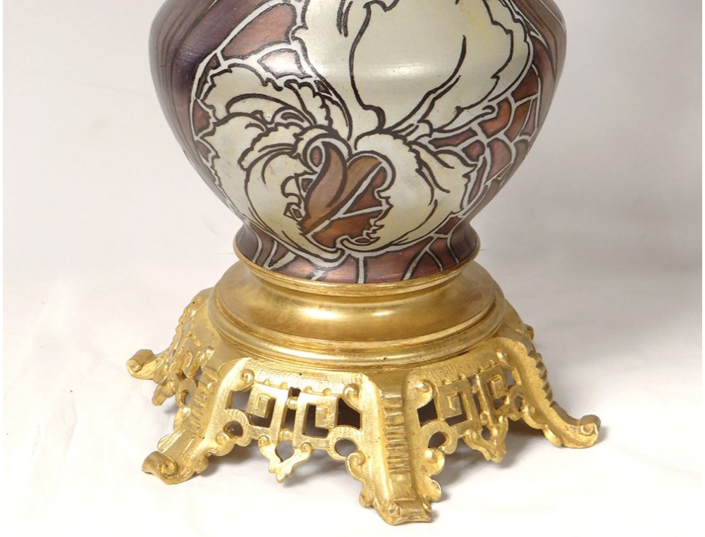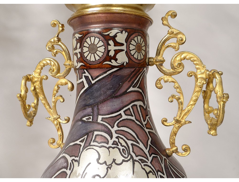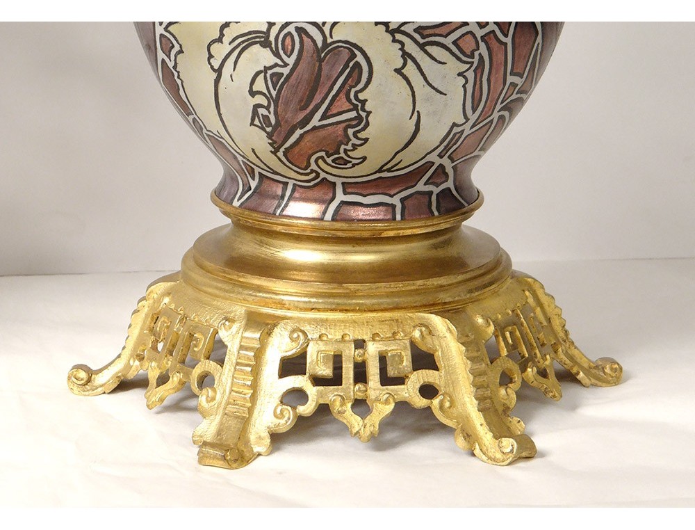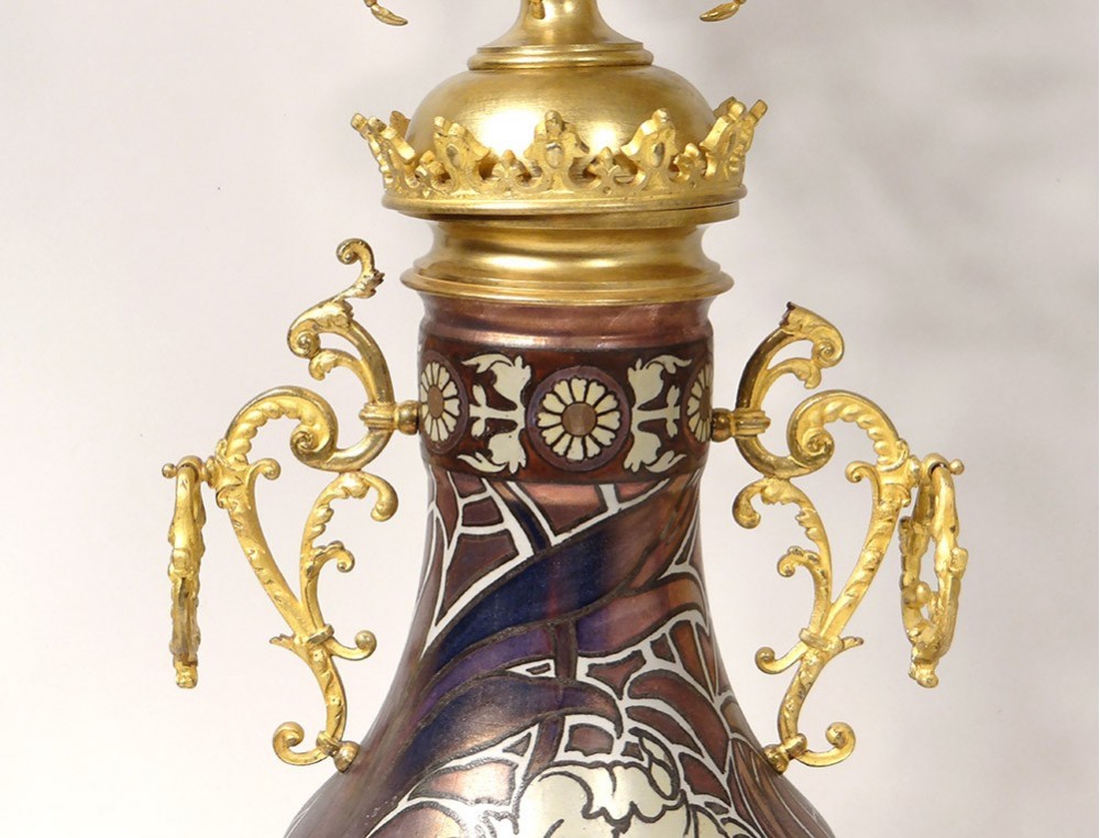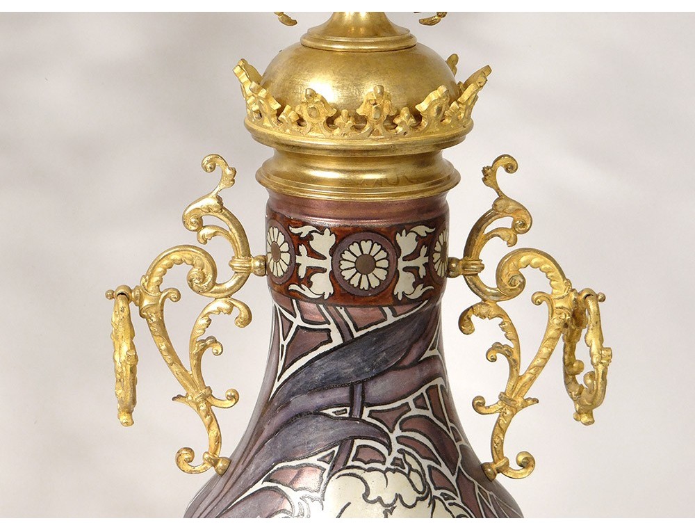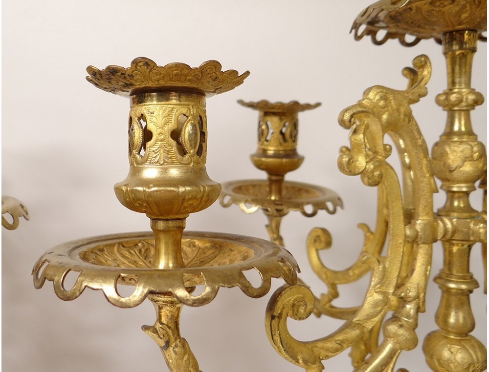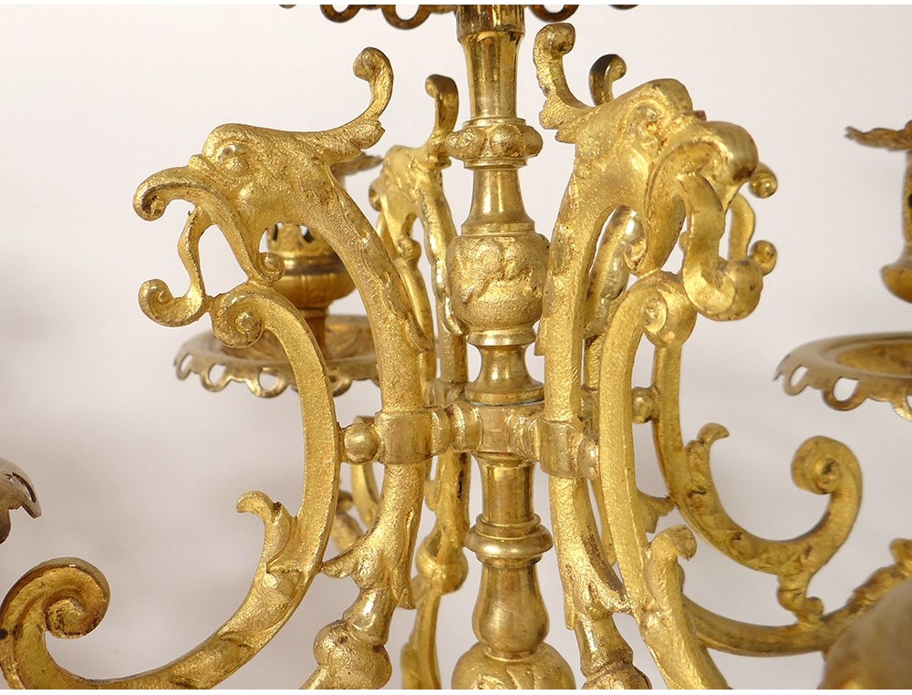Pair of large candelabra 5 fires, finely chiseled gilt bronze and openwork decorated with arabesques and phoenix heads, body shaped vase baluster polycrome porcelain decorated with stylized flowers, with leafy handles, period around 1880 Art Nouveau late nineteenth century.