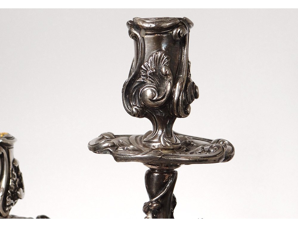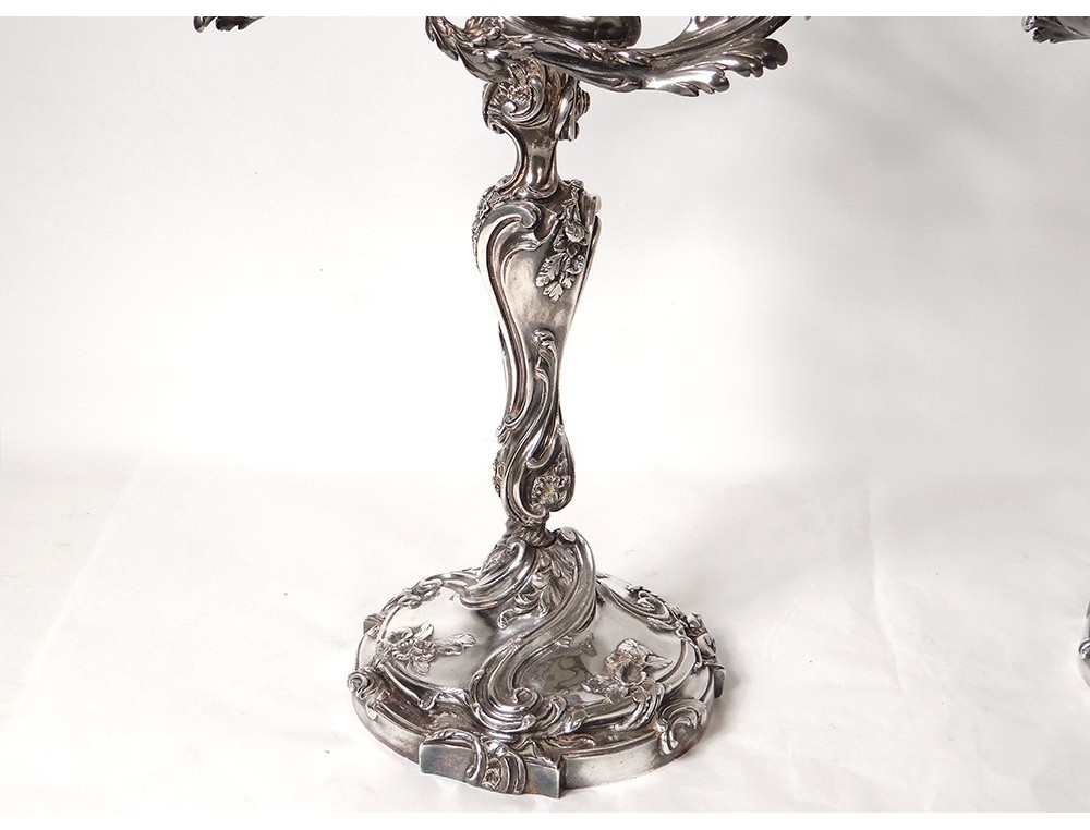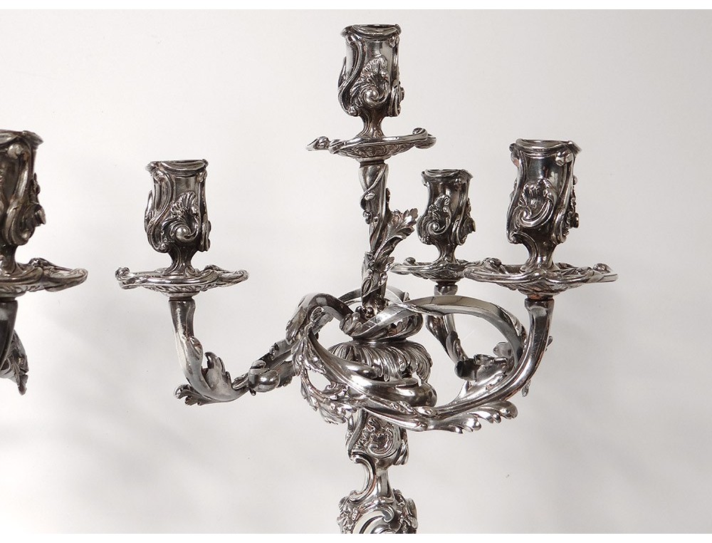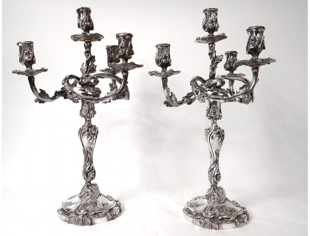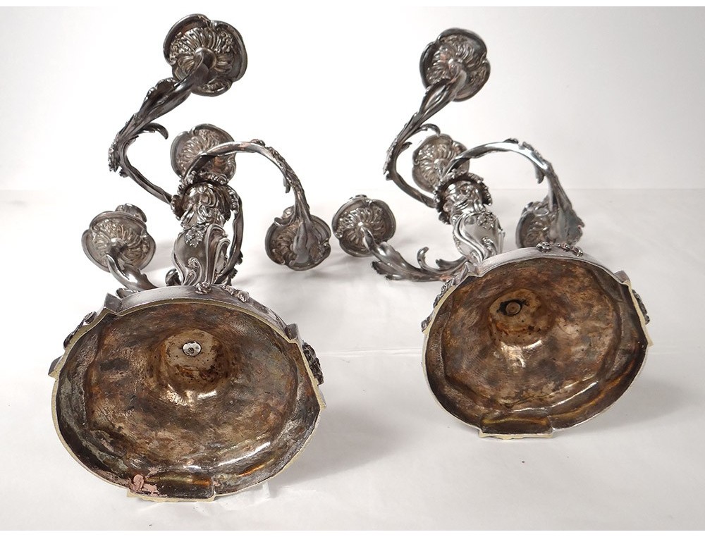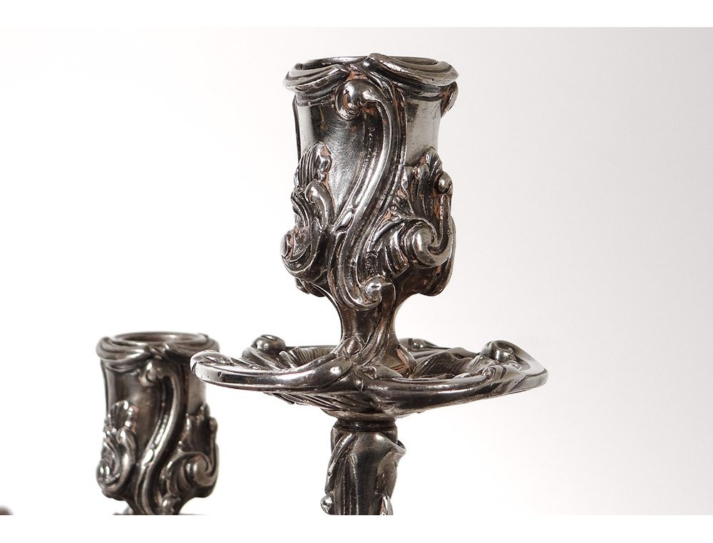 Pair of large candelabra candlesticks with 4 lights Louis XV style, silver-plated bronze, rich rococo and lively decoration of small flowers, foliage and stylized shells, vintage late nineteenth and early twentieth centuries.