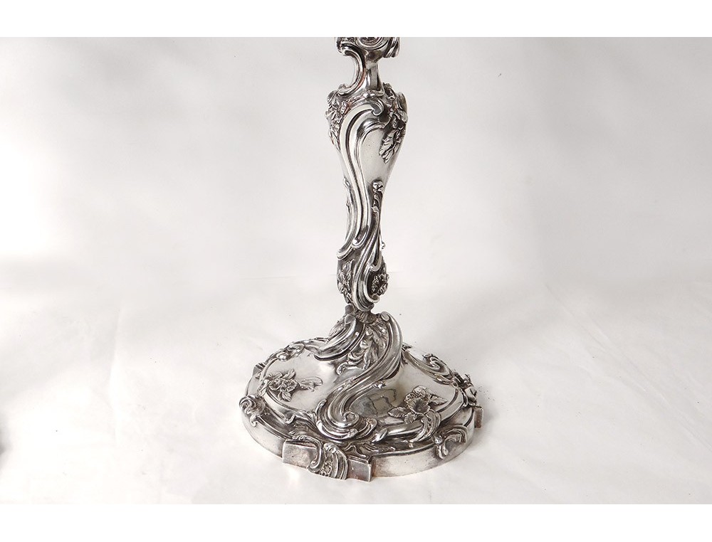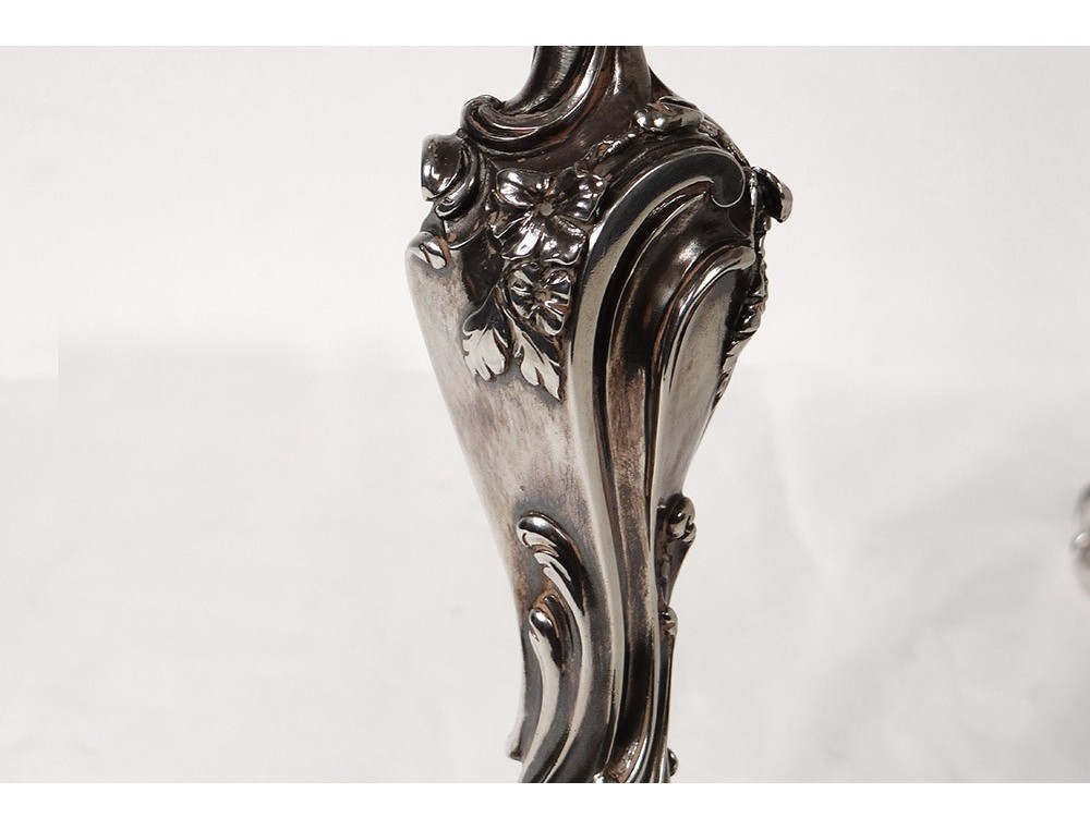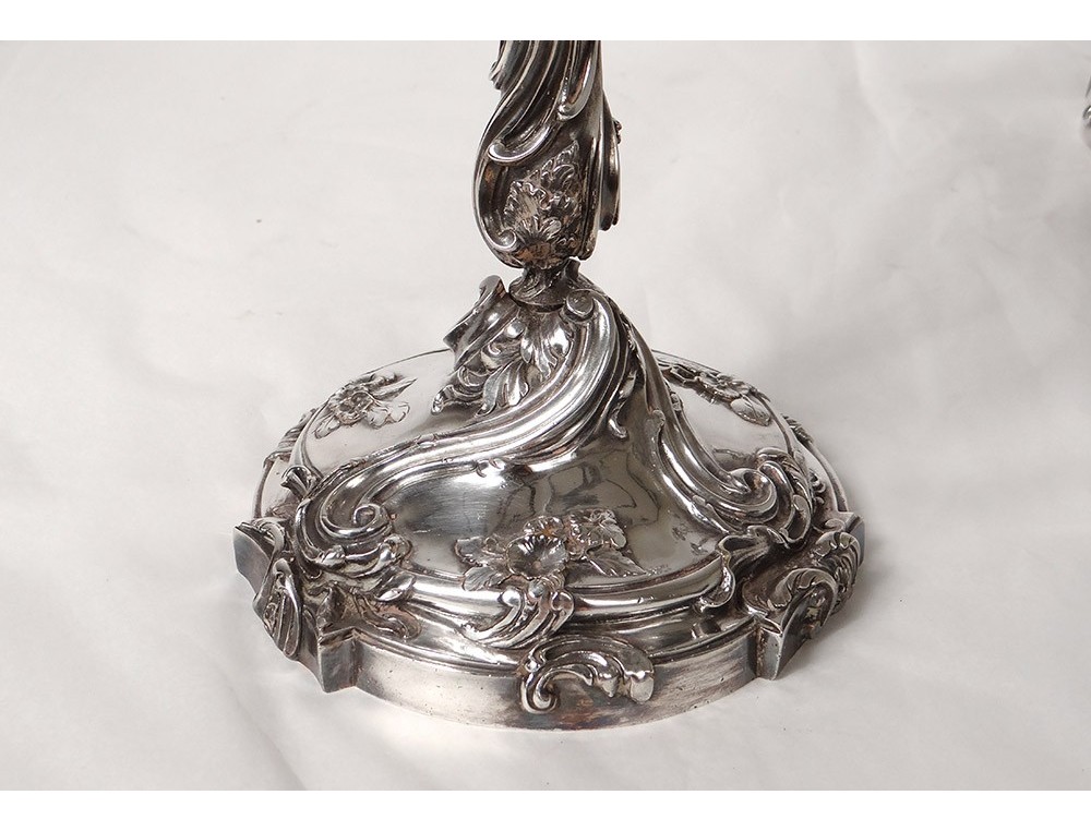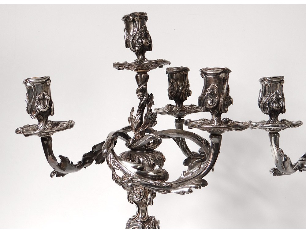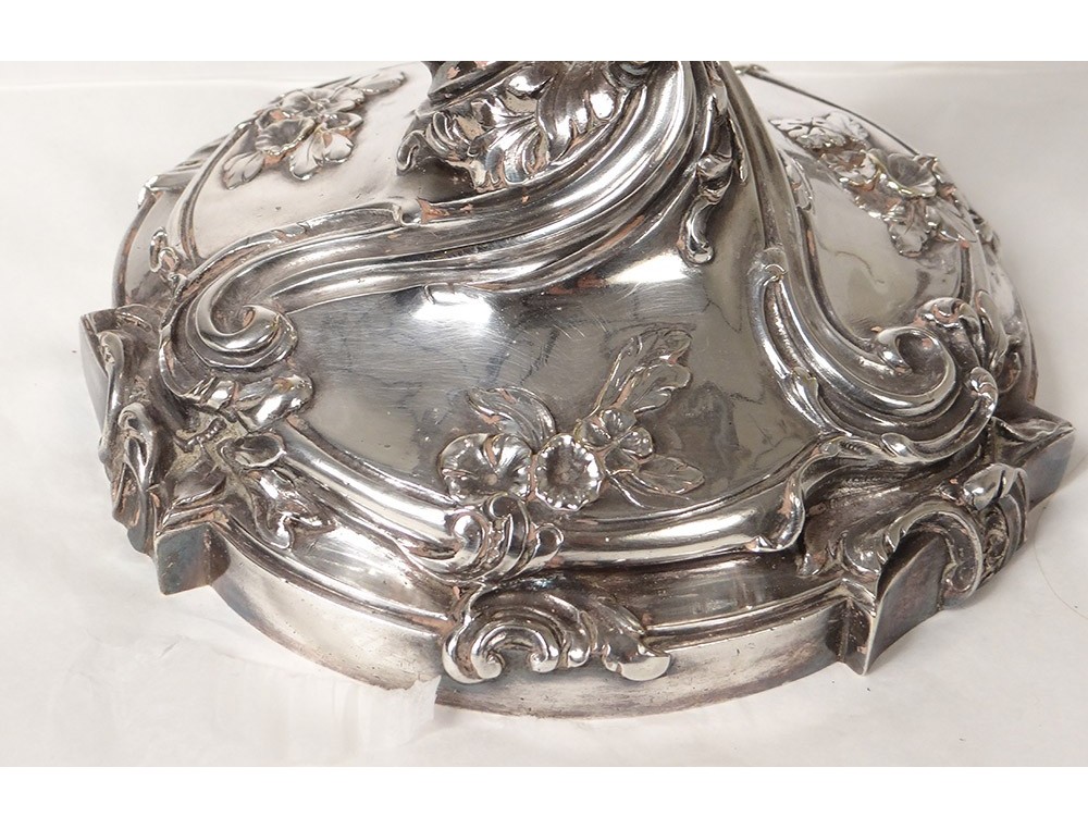 Pair of large candelabra candlesticks with 4 lights Louis XV style, silver-plated bronze, rich rococo and lively decoration of small flowers, foliage and stylized shells, vintage late nineteenth and early twentieth centuries.