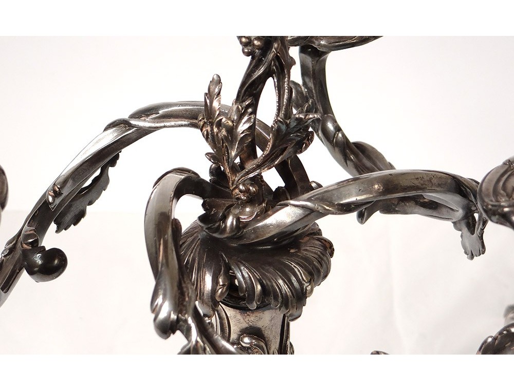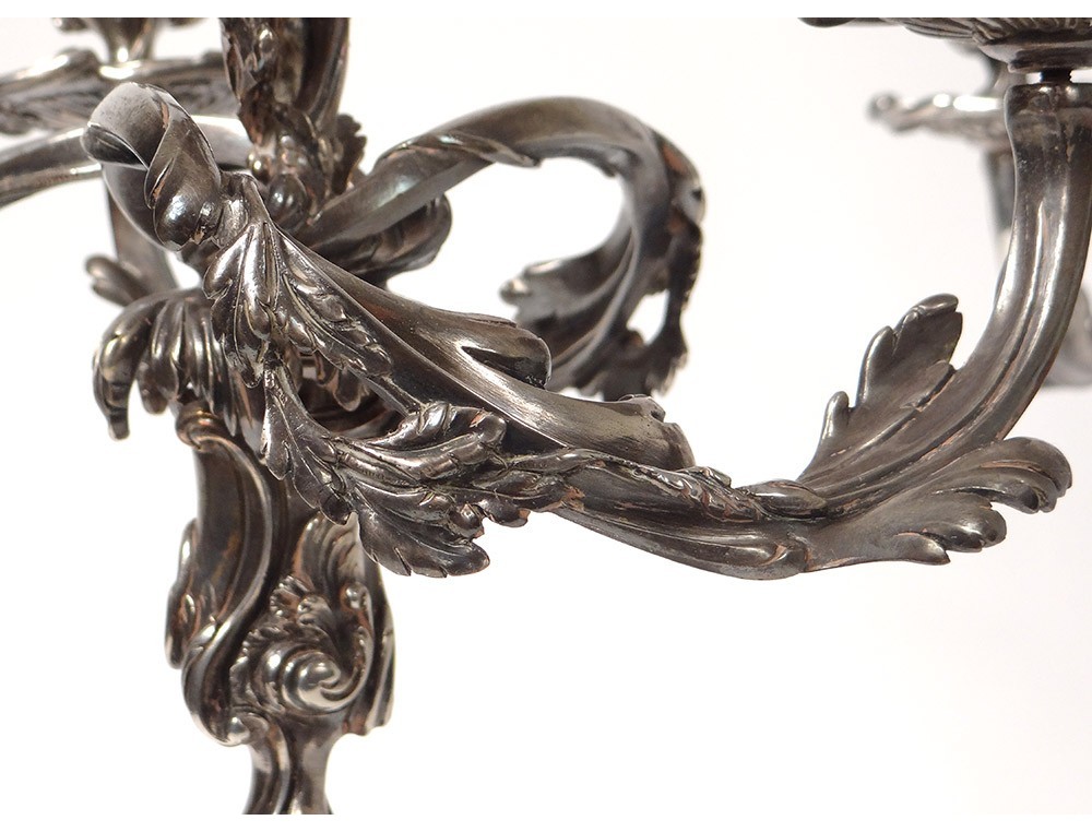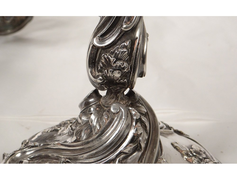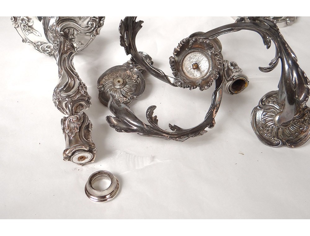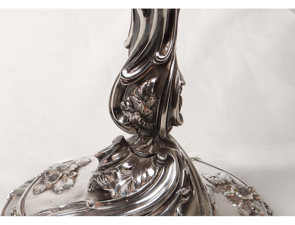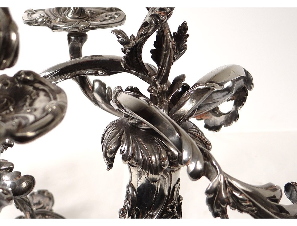 Pair of large candelabra candlesticks with 4 lights Louis XV style, silver-plated bronze, rich rococo and lively decoration of small flowers, foliage and stylized shells, vintage late nineteenth and early twentieth centuries.