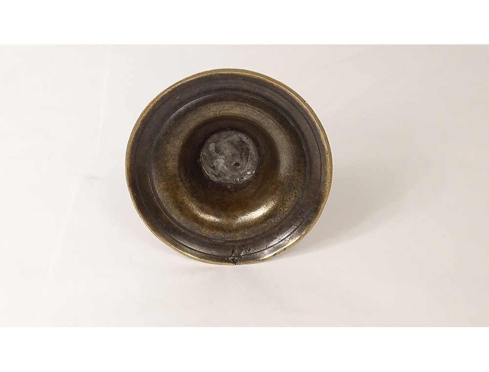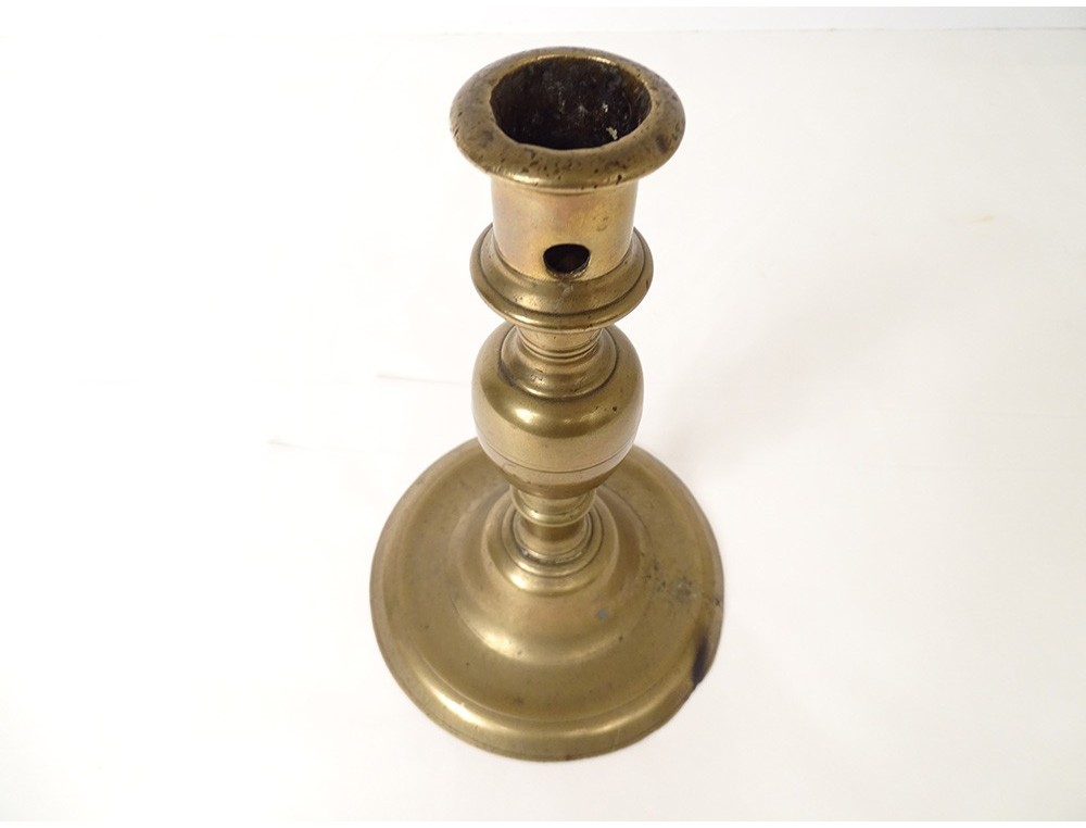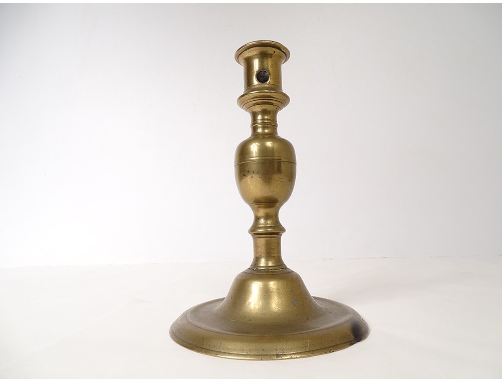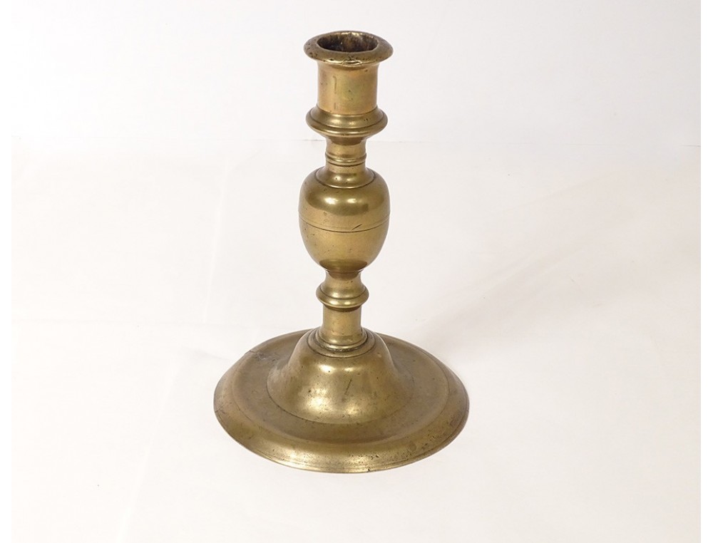 Haute Epoque brass candlestick *, faucet mounted on a baluster barrel with a large central coil and a large round and molded base, from late 16th-early 17th century.