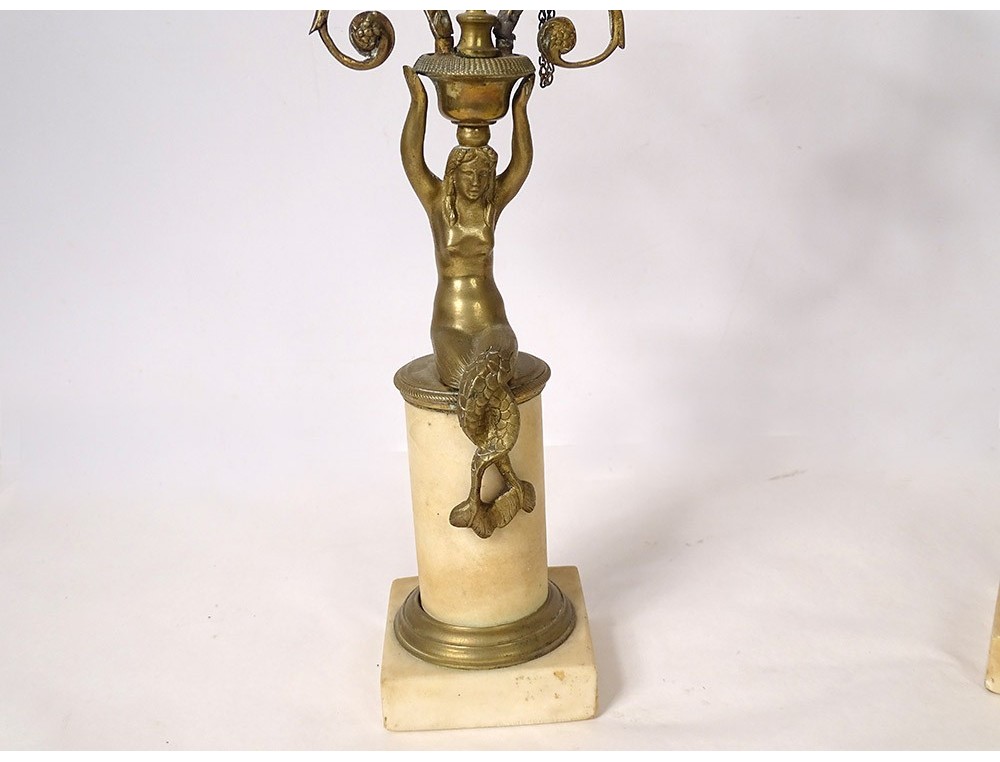 Pair of candelabra 2 lights gilded bronze women mermaids eagle white marble nineteenth