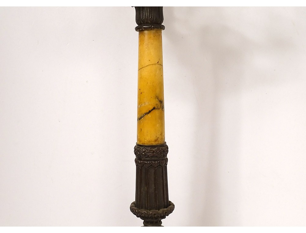 Large three-light candelabra in finely chiseled patinated bronze decorated with arabesques and scrolls of foliage, sienna marble shaft, Napoleon III XIXth century.