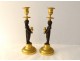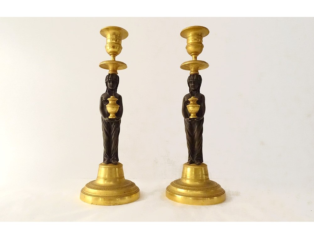 Pair of bronze candlesticks with two patinas (brown and gold) representing two canephor vestals in caryatids, holding in their hands a covered urn, mounted on a round base chiseled with a frieze of palmettes, from the 19th century.