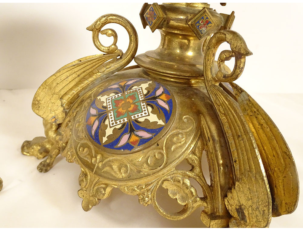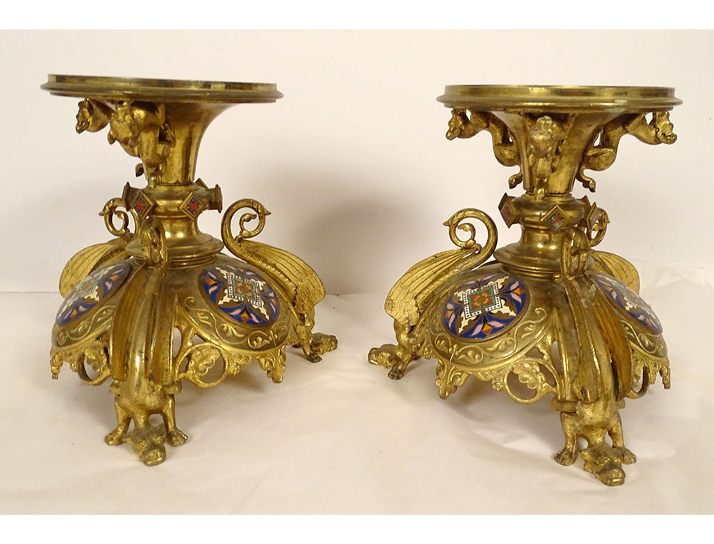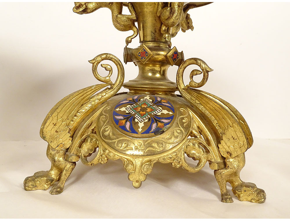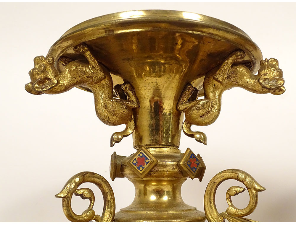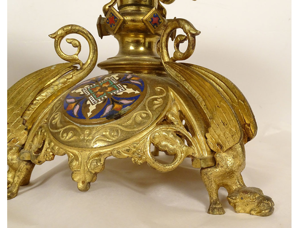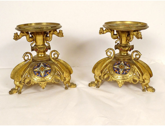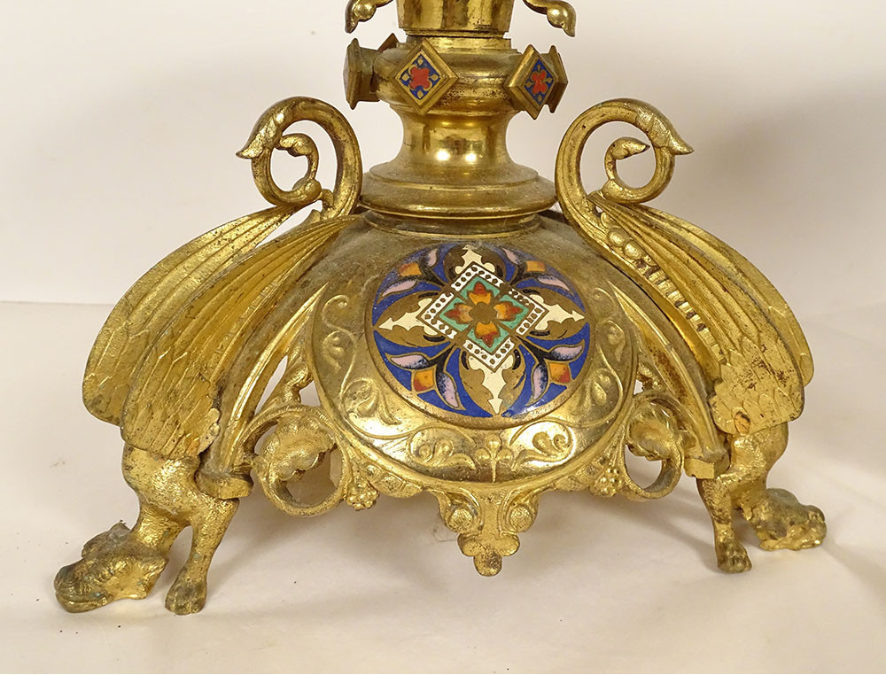 Pair of church candlesticks or pikes in the neo-Gothic style, in finely chiseled gilt bronze enhanced with enamel, decorated with dragons or chimeras forming the tripod base as well as supporting the cup, medallions with floral decoration forming a stylized cross, from the 19th century.