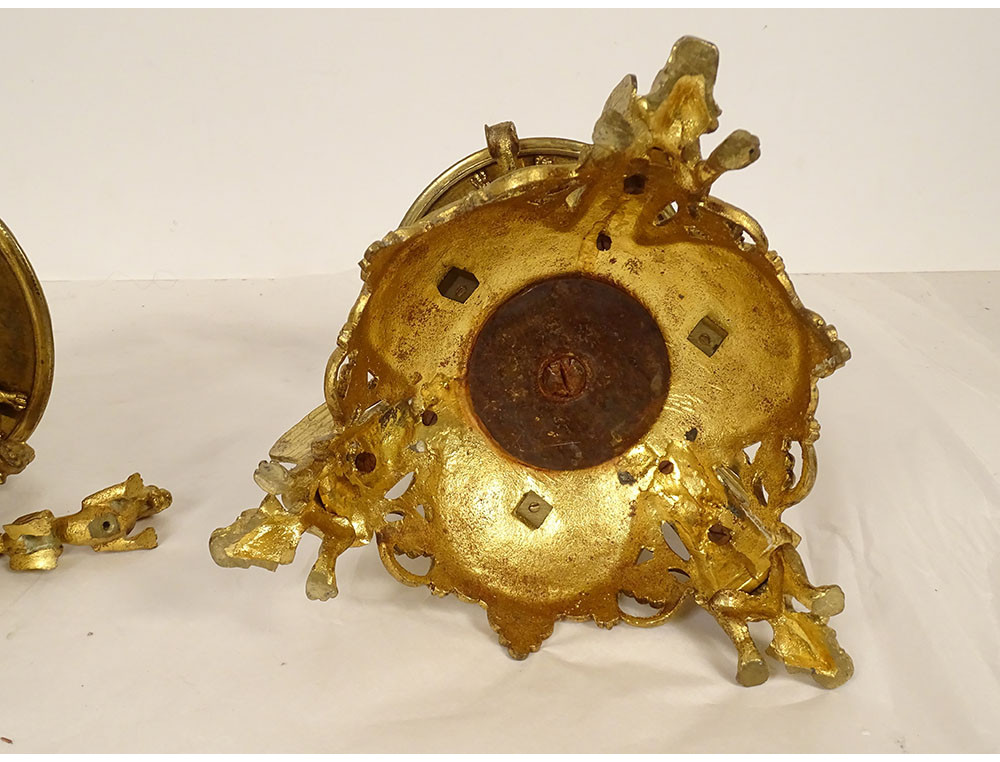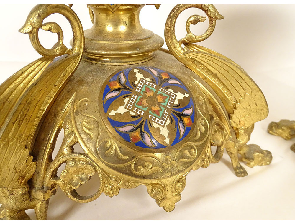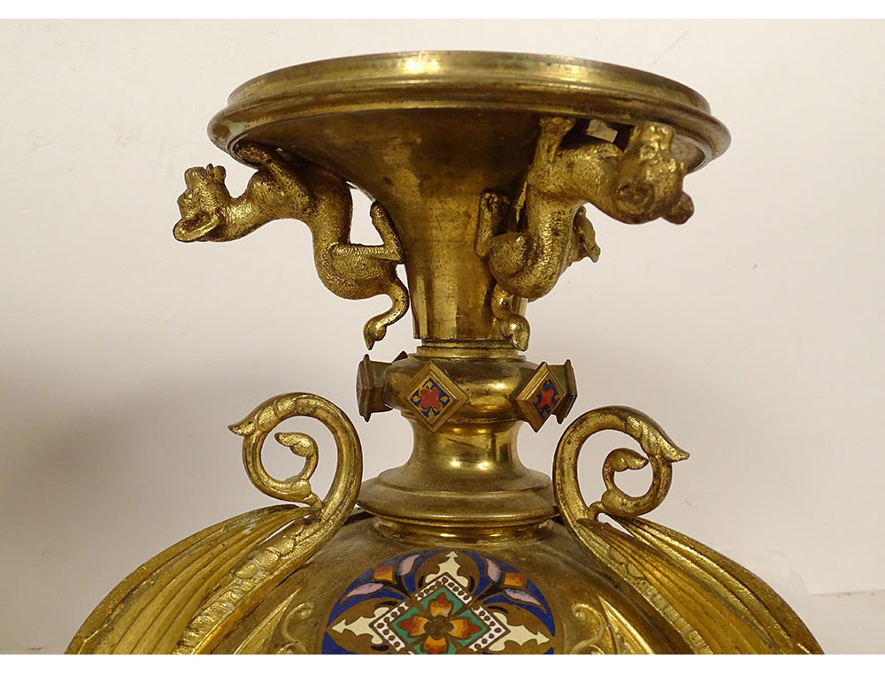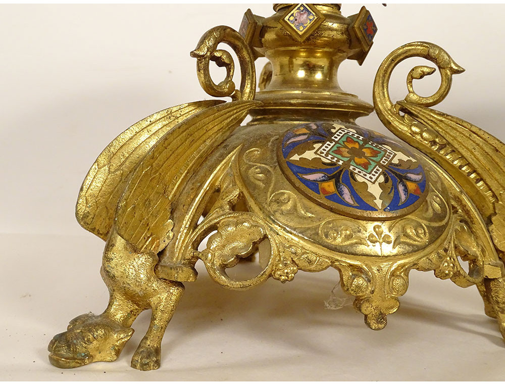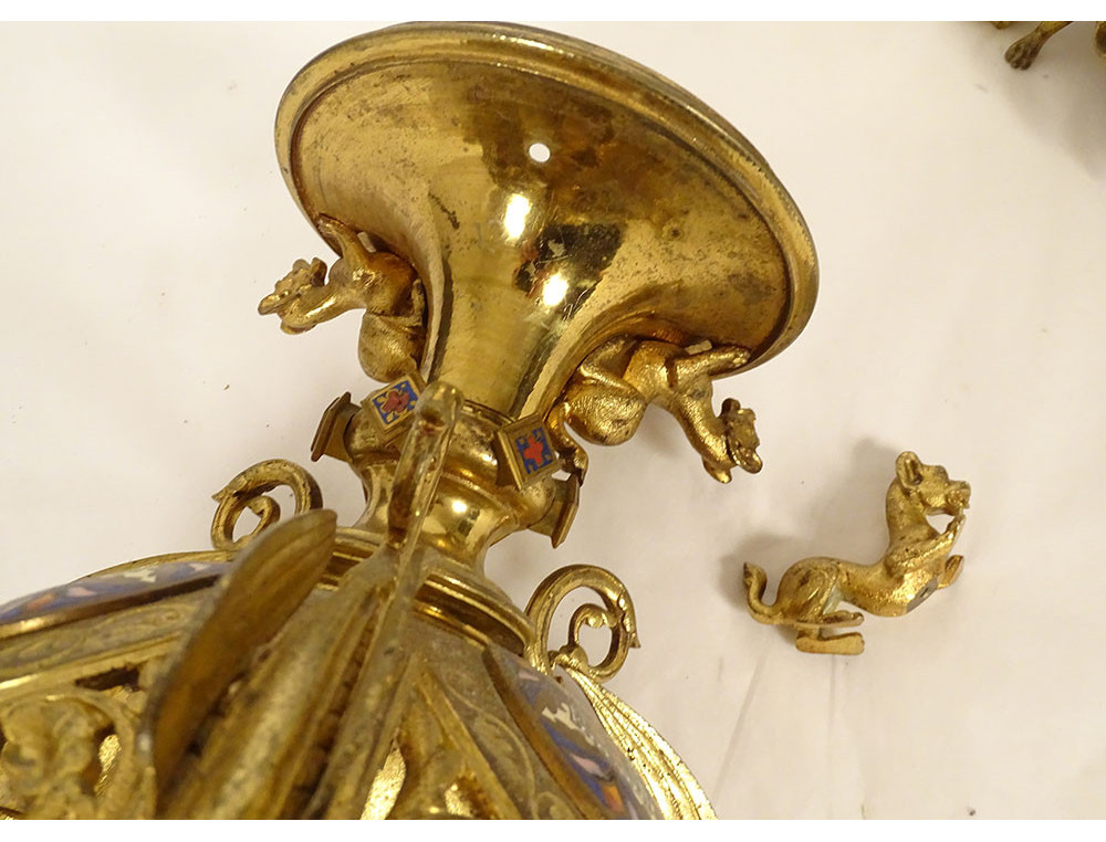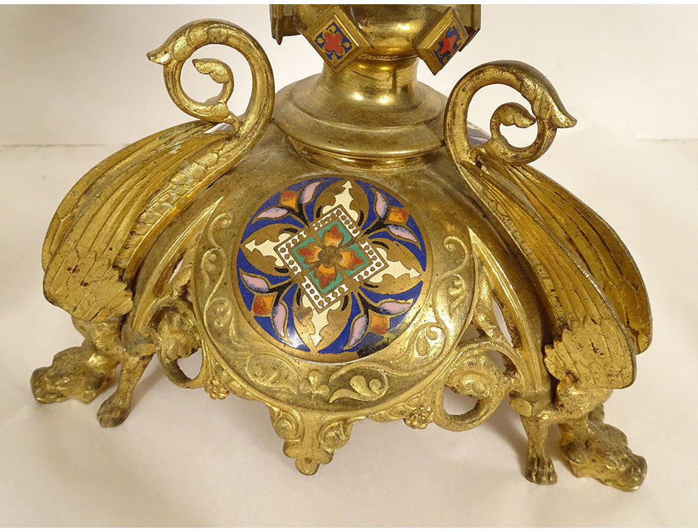 Pair of church candlesticks or pikes in the neo-Gothic style, in finely chiseled gilt bronze enhanced with enamel, decorated with dragons or chimeras forming the tripod base as well as supporting the cup, medallions with floral decoration forming a stylized cross, from the 19th century.