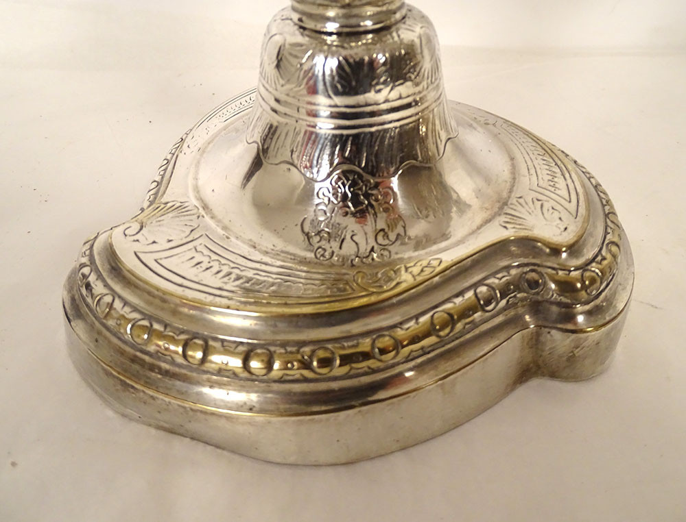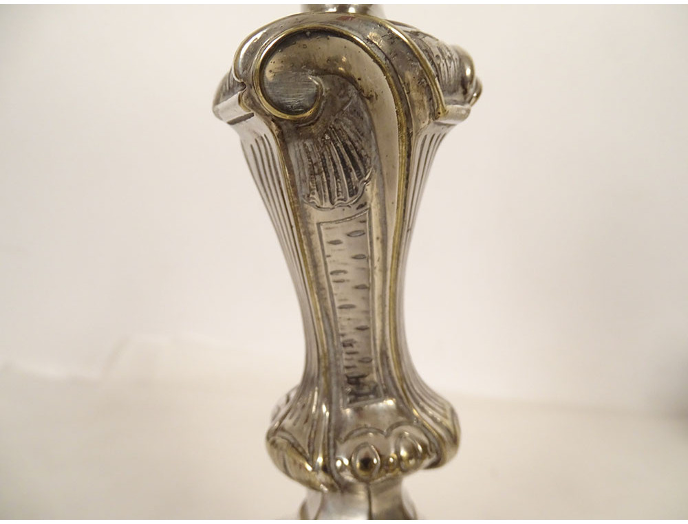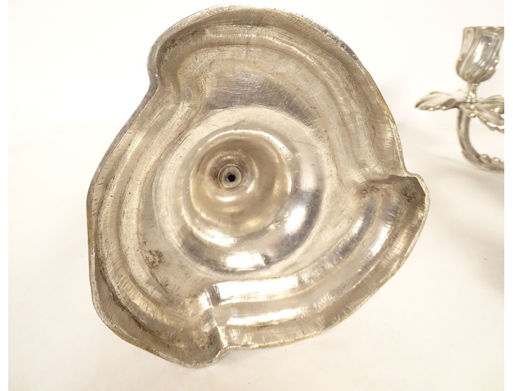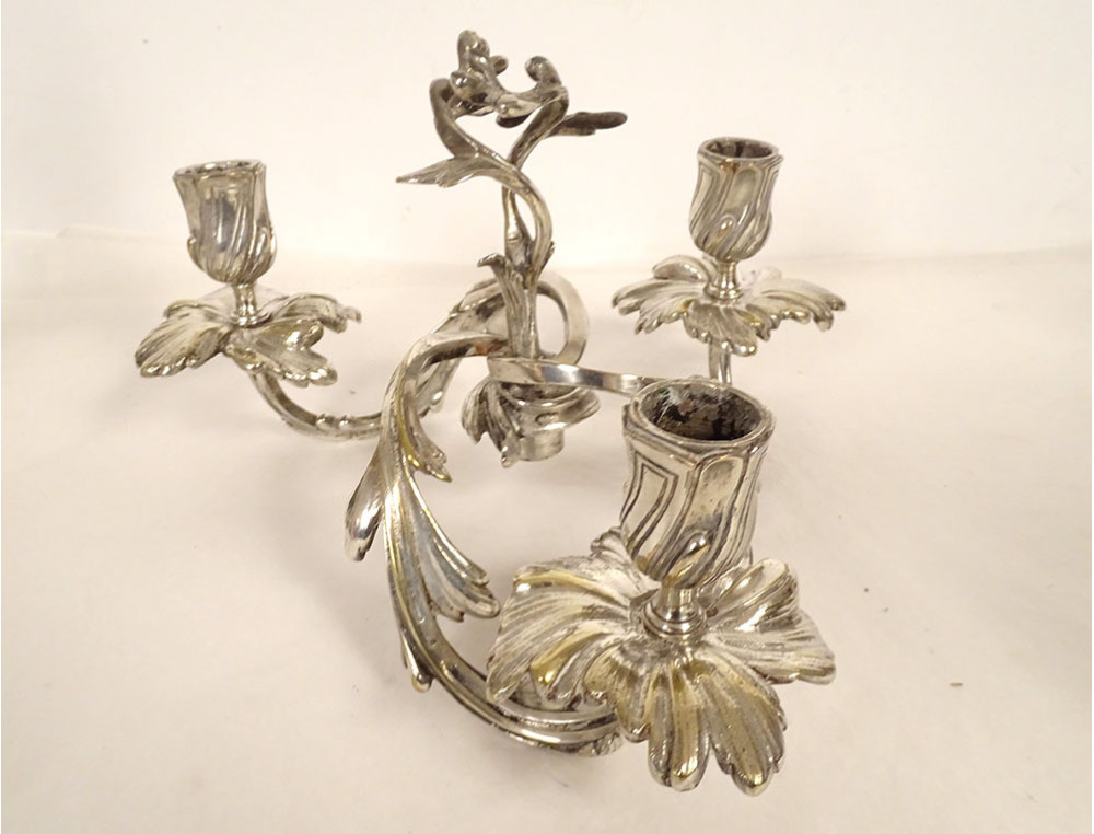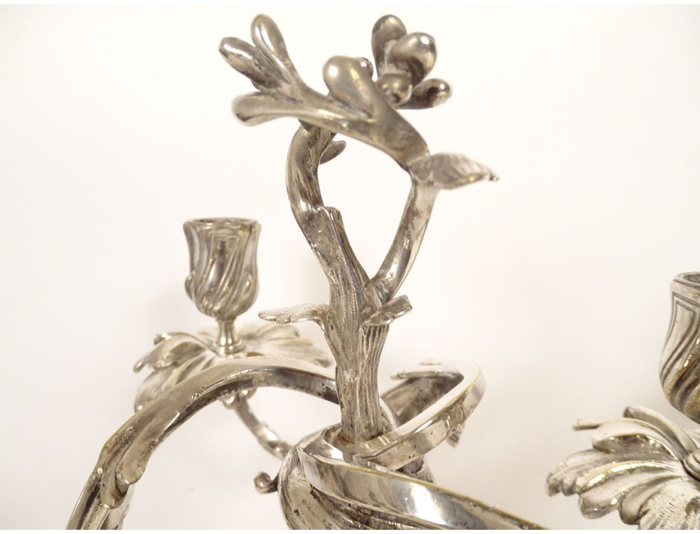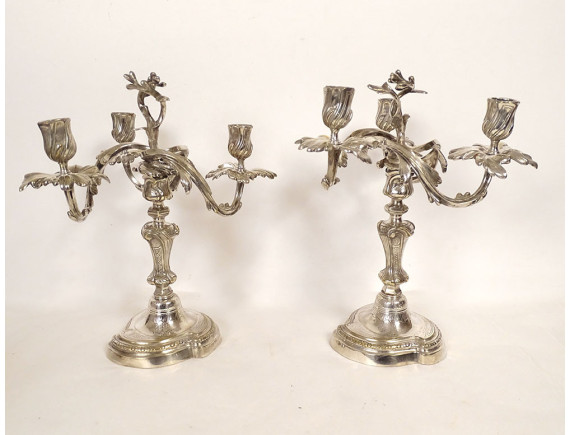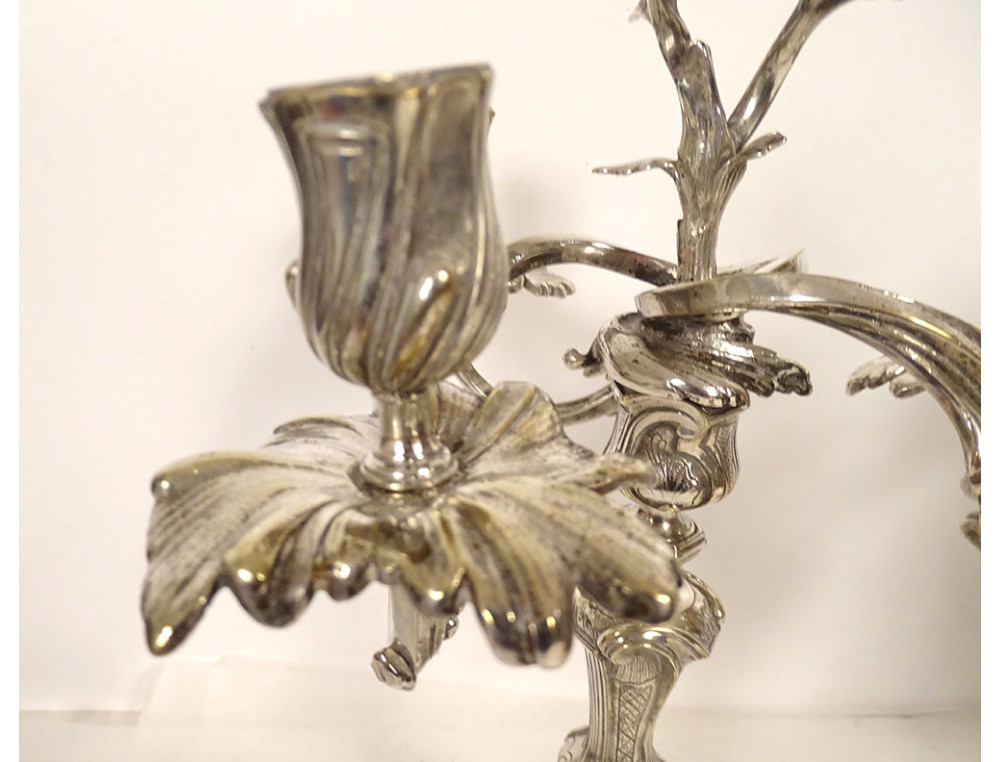Pair of Louis XV style three-light candelabra in silvered bronze and rocaille style, 19th century