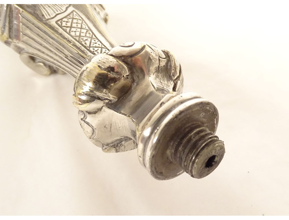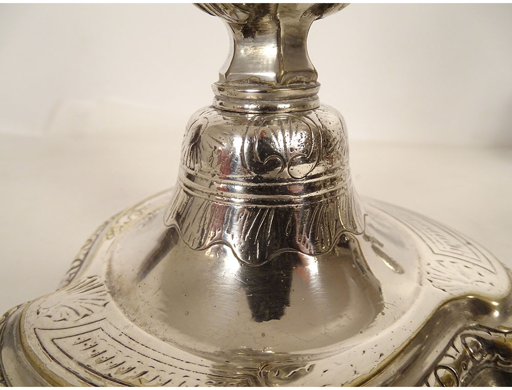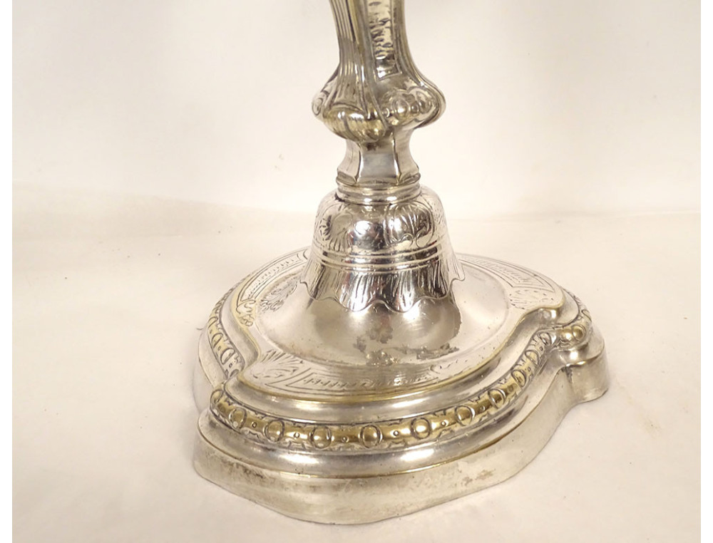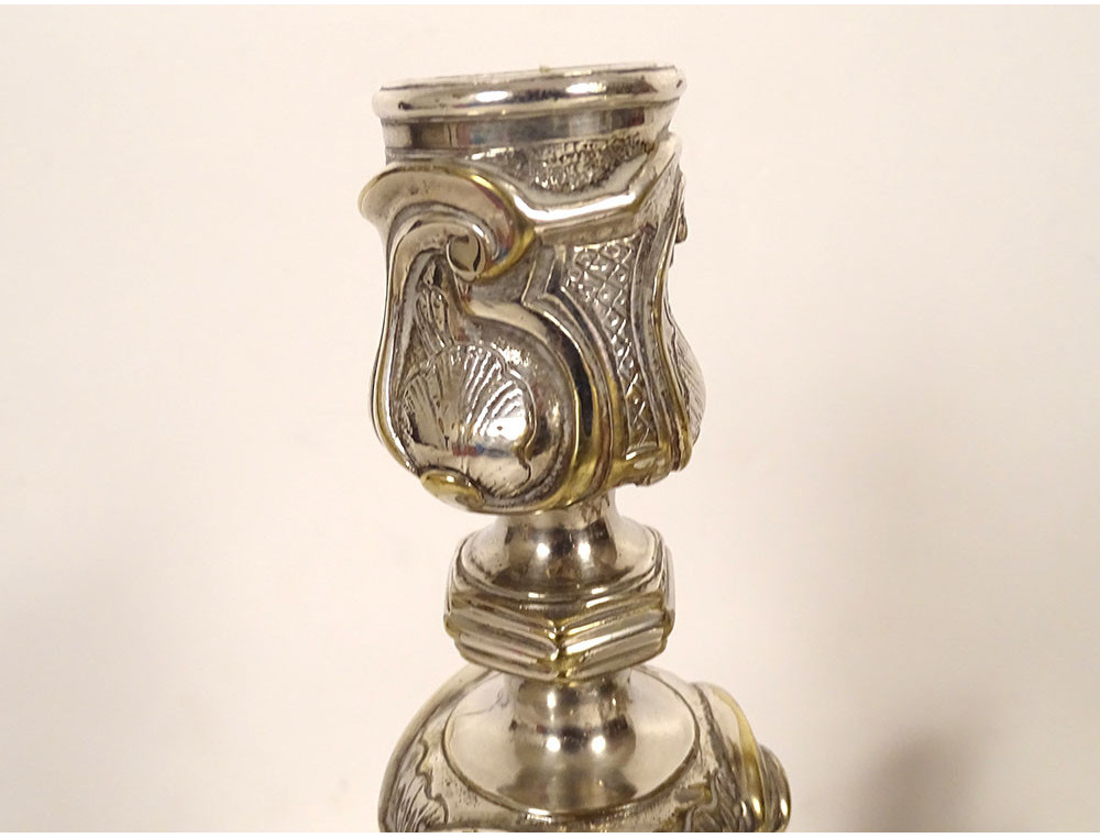 Pair of Louis XV three-light candelabra, in finely chased silvered bronze, decorated in the rocaille style with small flowers, trellises and stylized shells, chased with a coat of arms on the base, the latter undulating and molded with contours, girandoles in the shape of foliage, from the 19th century.
