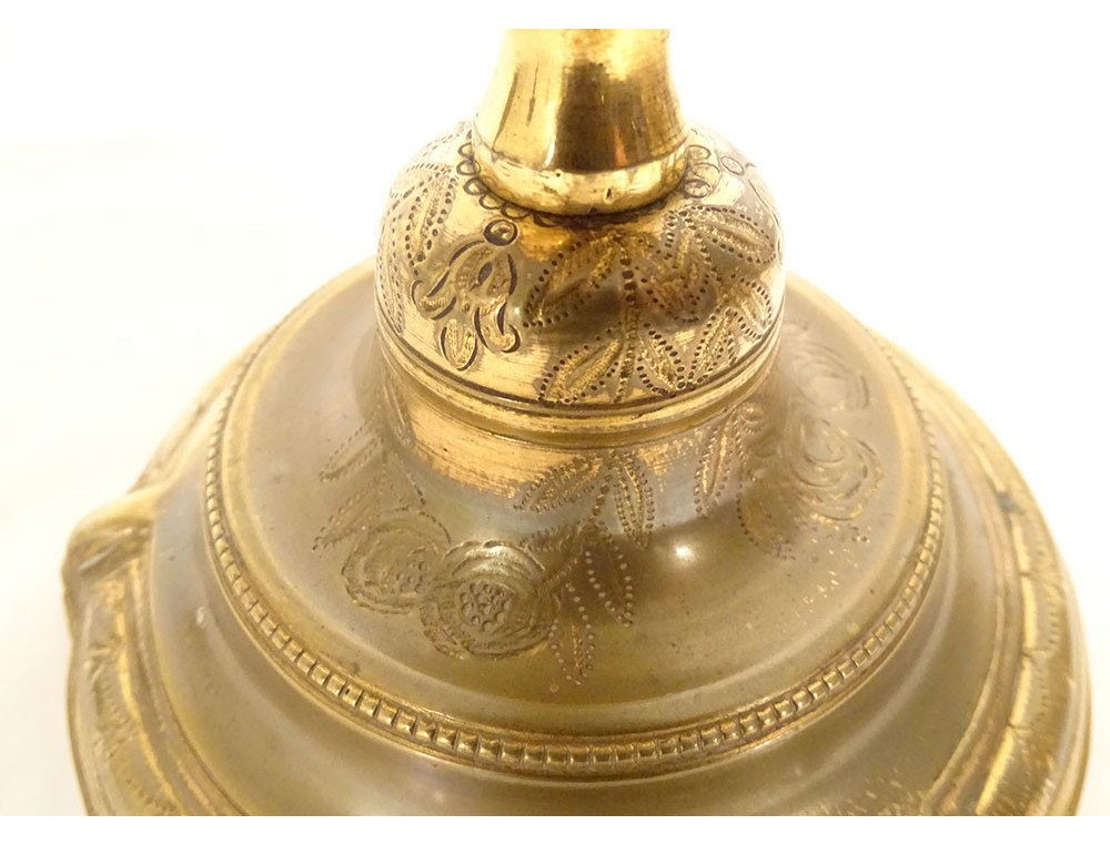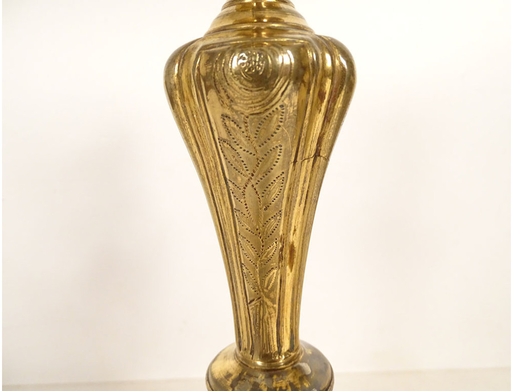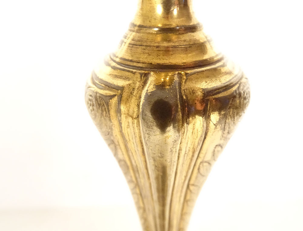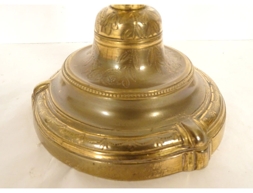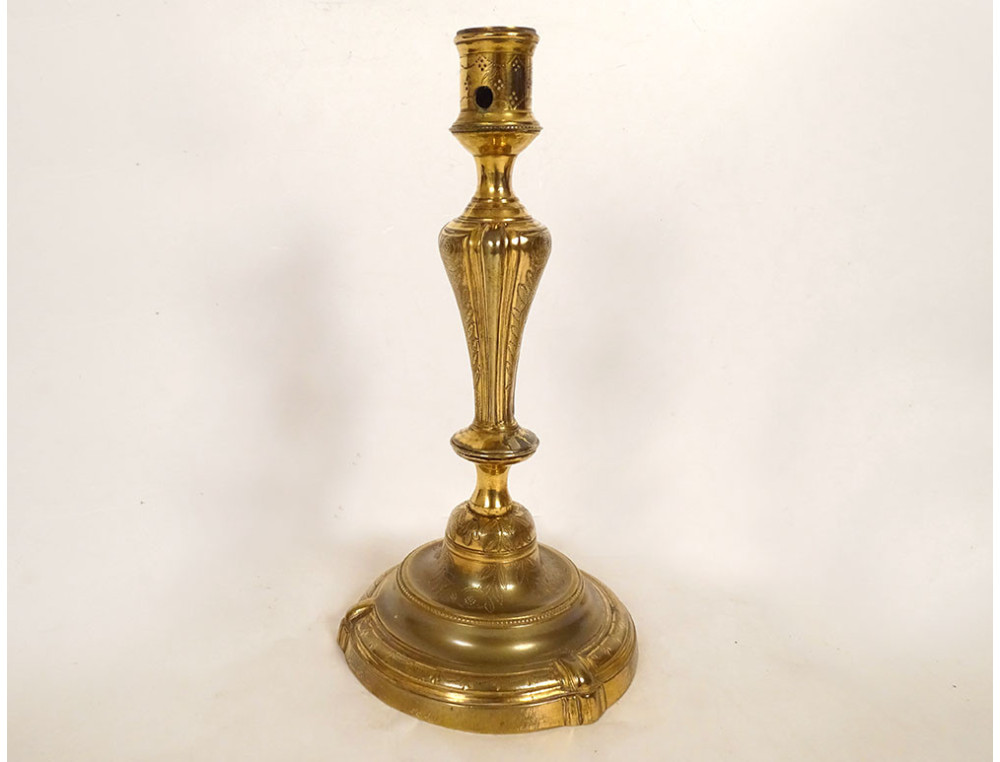 A finely chiseled gilt bronze torch-candle holder, straight socket on a baluster shaft decorated with foliage, mounted on a round base with contours and moldings chiseled with garlands of flowers, from the Regency period, 18th century.