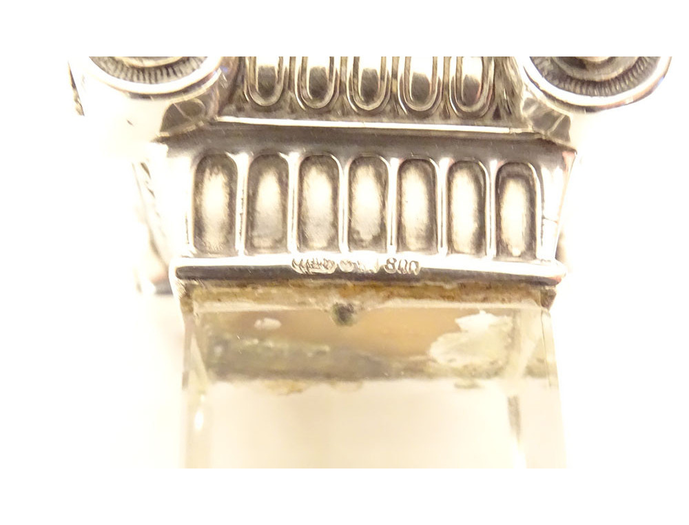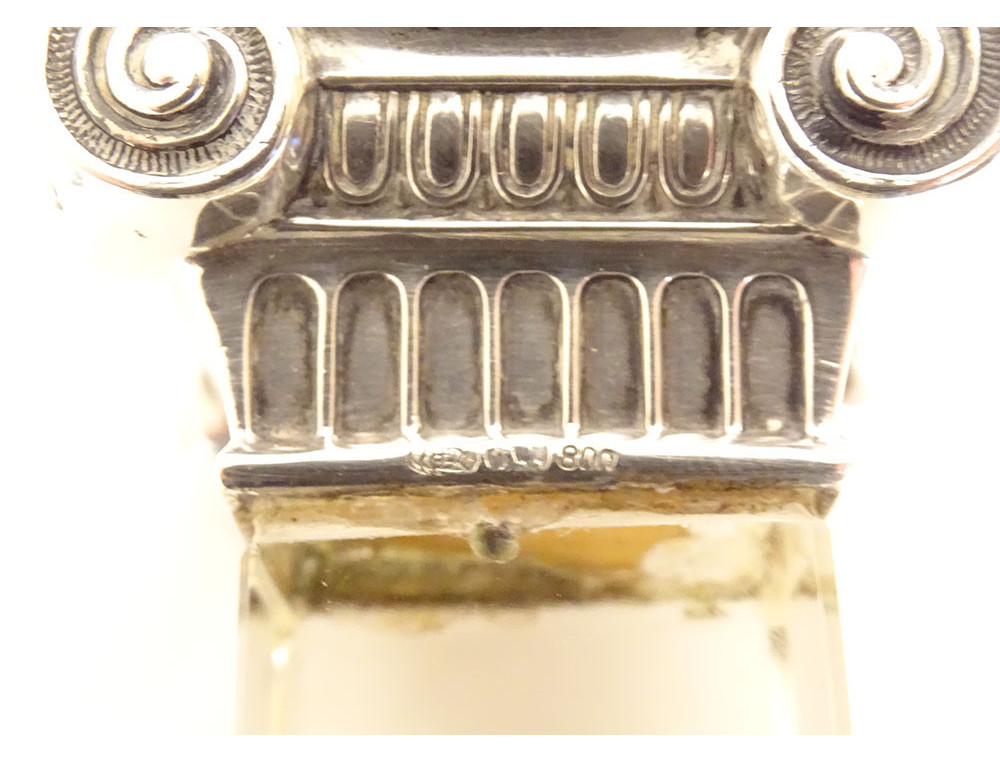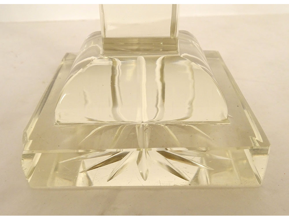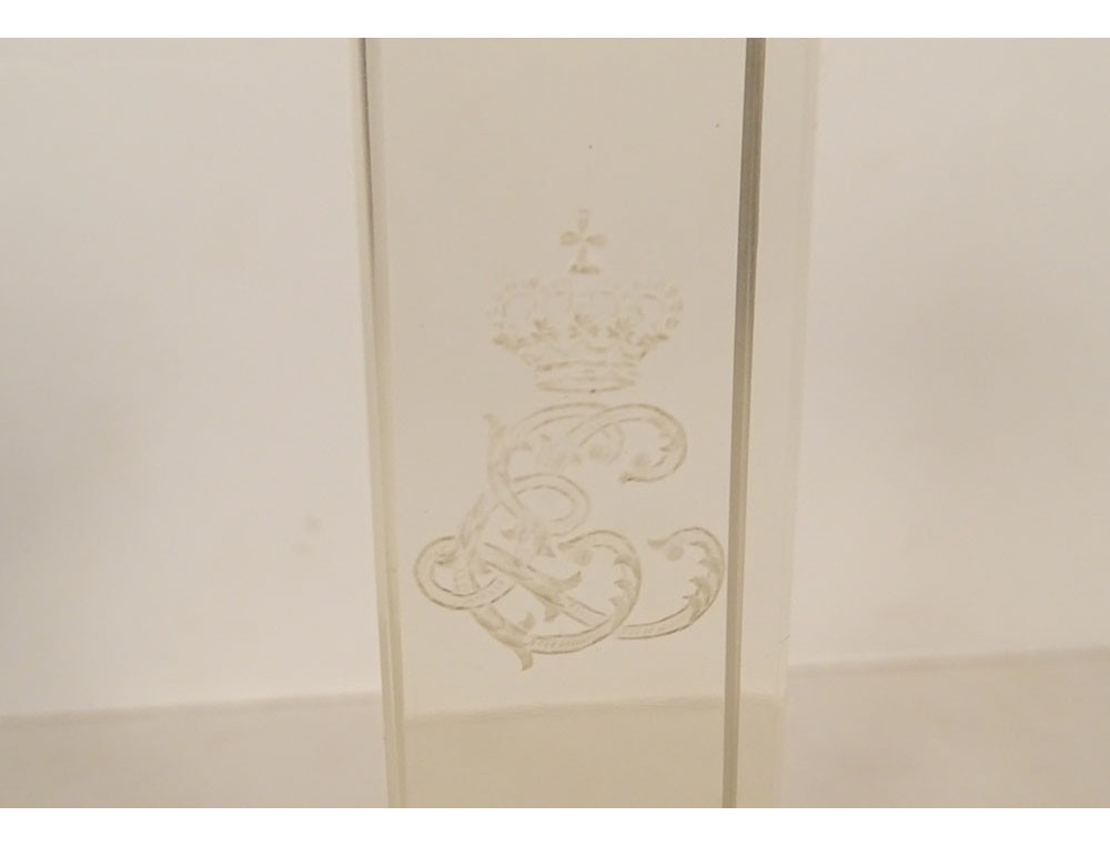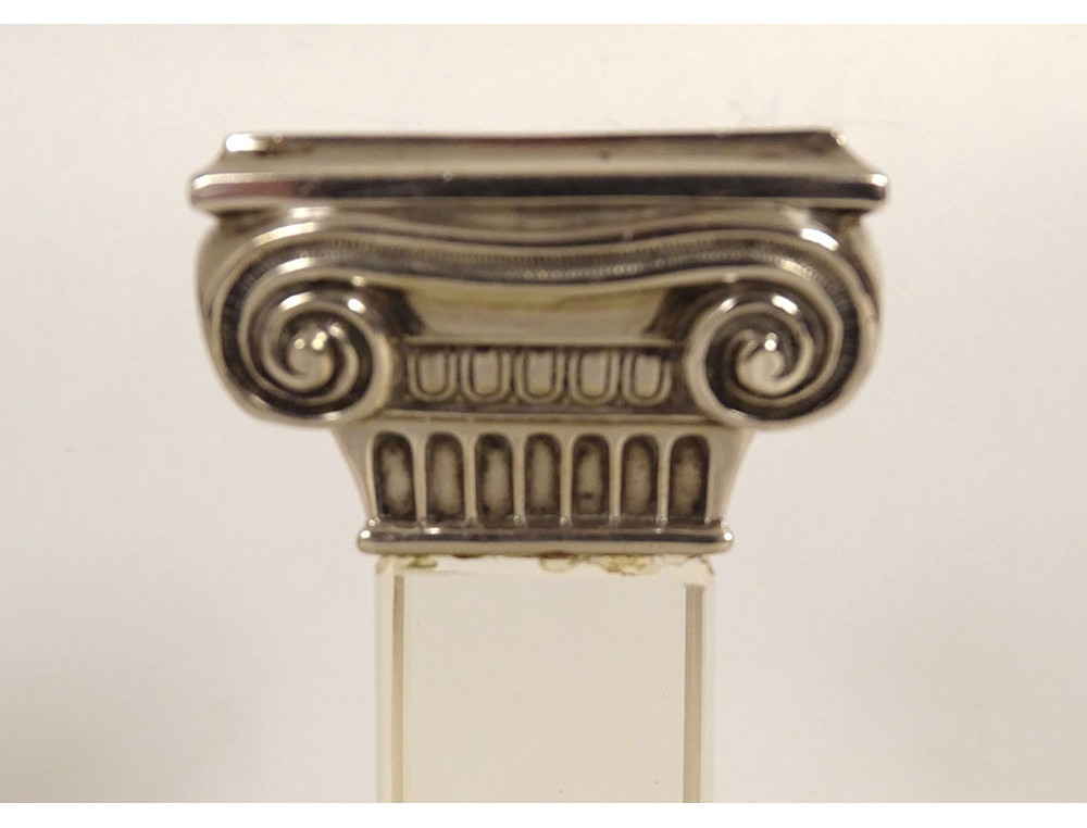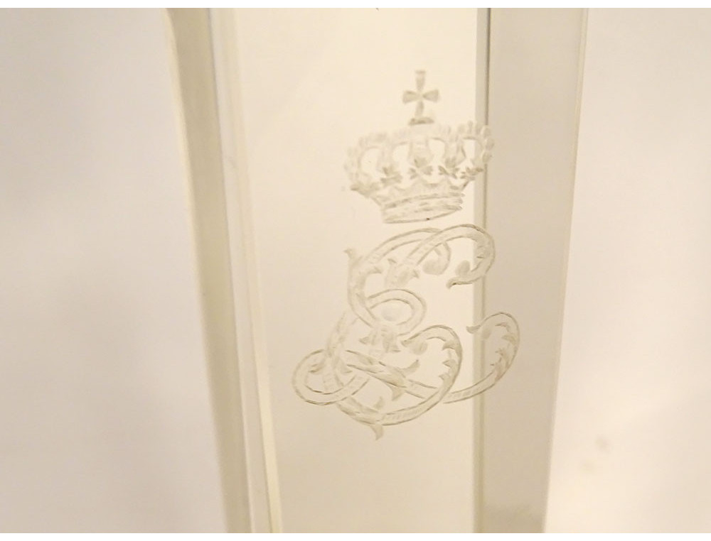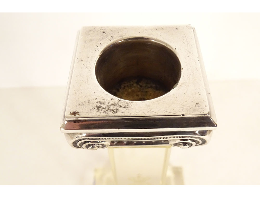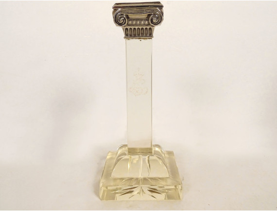 Column-shaped candlestick with an ionic capital, made of cut crystal and solid German silver (moon/crown hallmarks 800), engraved with a crowned monogram on the stem, from the 19th century.