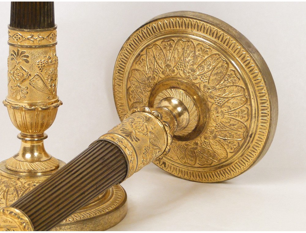 Superb pair of bronze candlesticks two patinas (gold and brown), finely chopped decorated with heads of cherubs bearing fruit cups, as well as grapes, palmettes and friezes ovals, and then Prime Empire early nineteenth century.