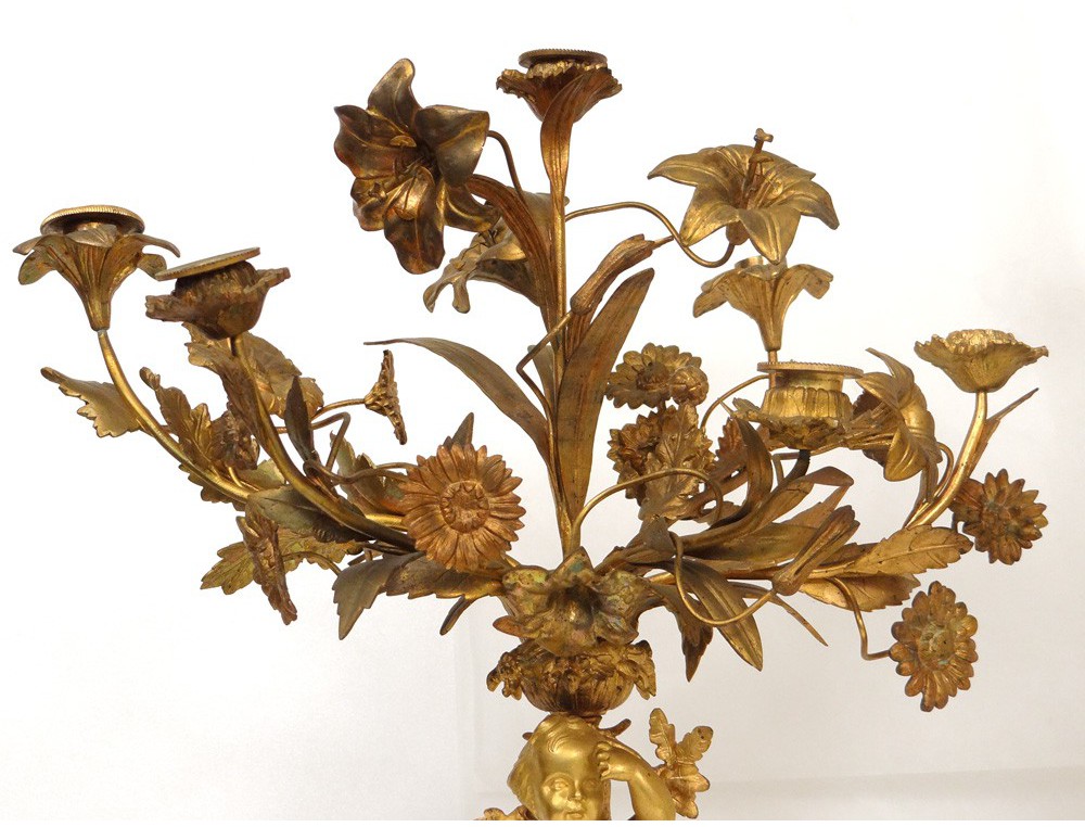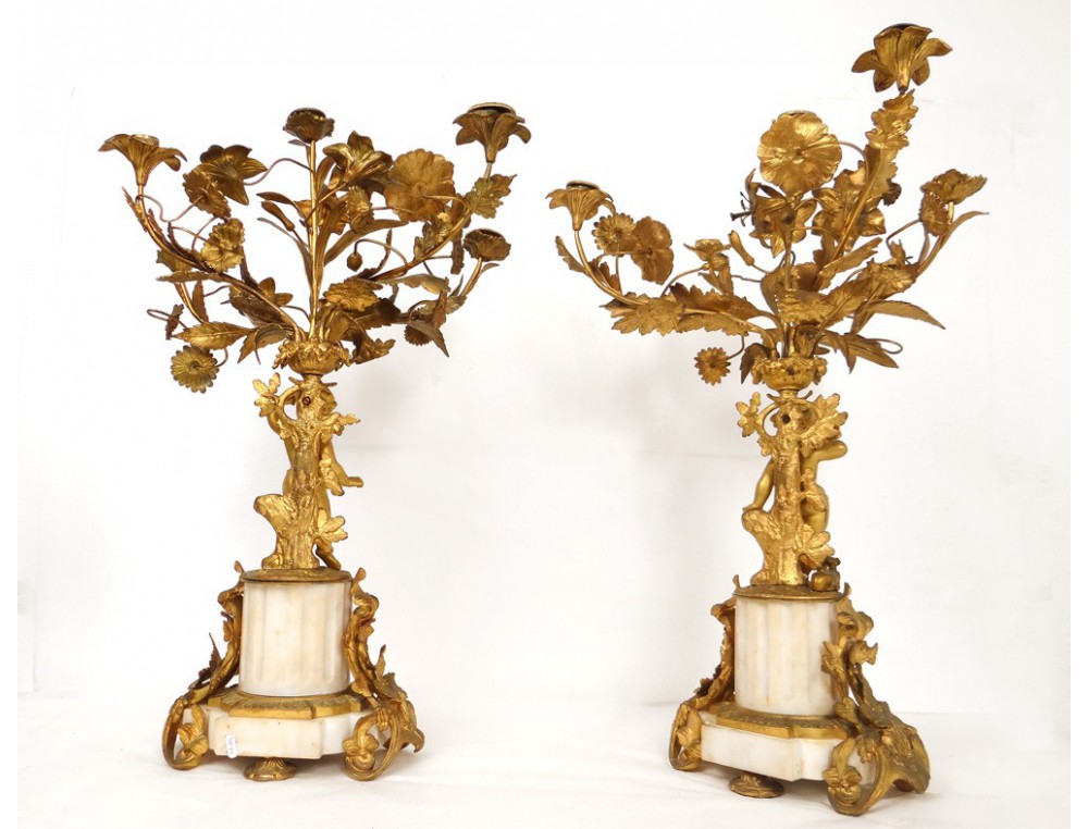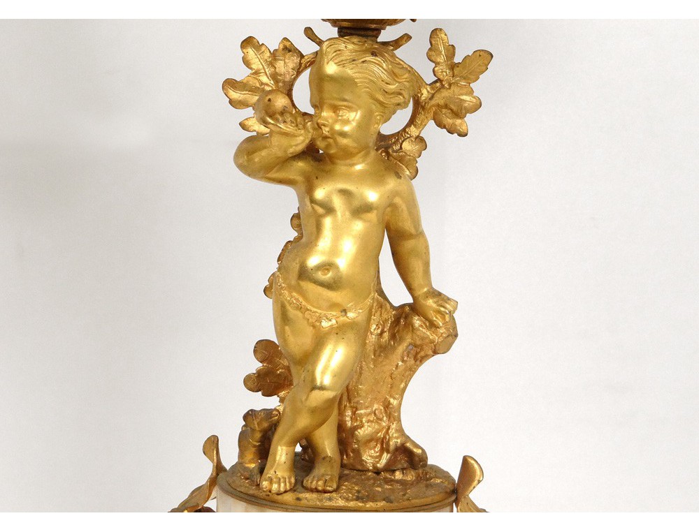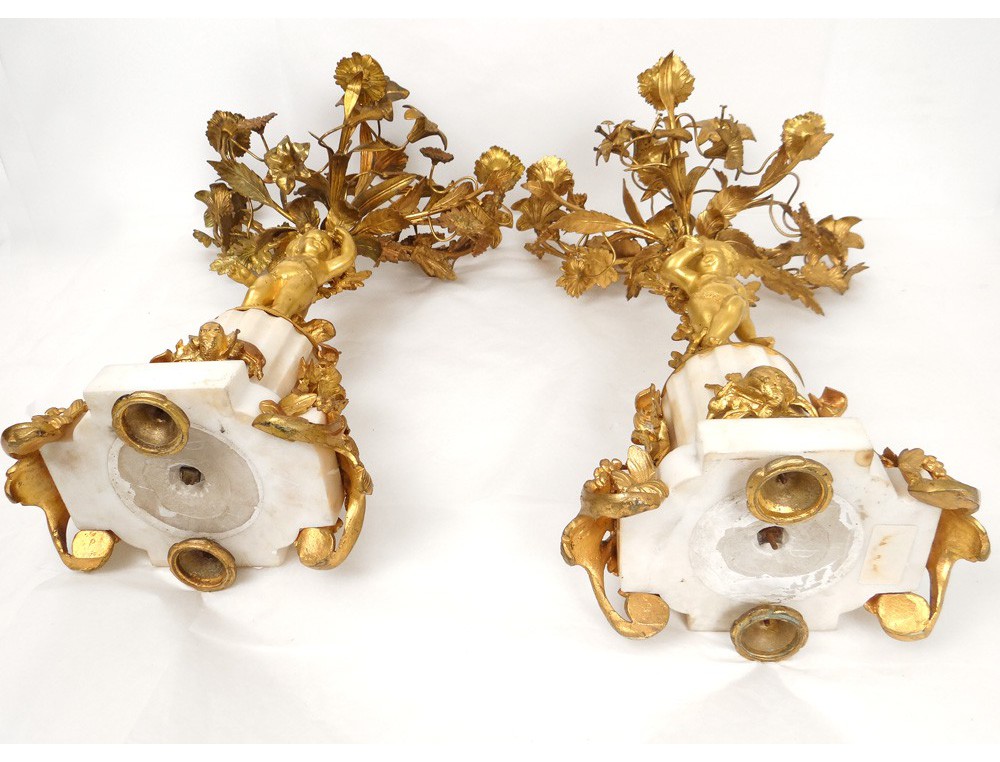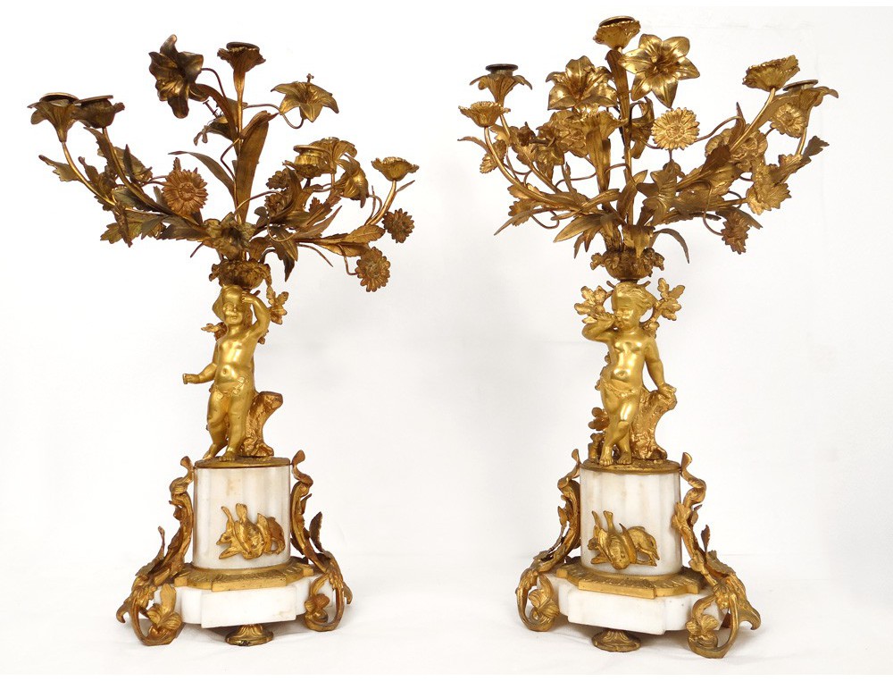 Superb and great pair of candelabra 6 lights, finely chiseled gilt bronze, decorated with two putti or Amours (one playing the French horn with a dog lying at his feet) and flowers and foliage, marble base white decorated with hunting trophies (hare and partridge) and ivy leaves, Napoleon III nineteenth century.