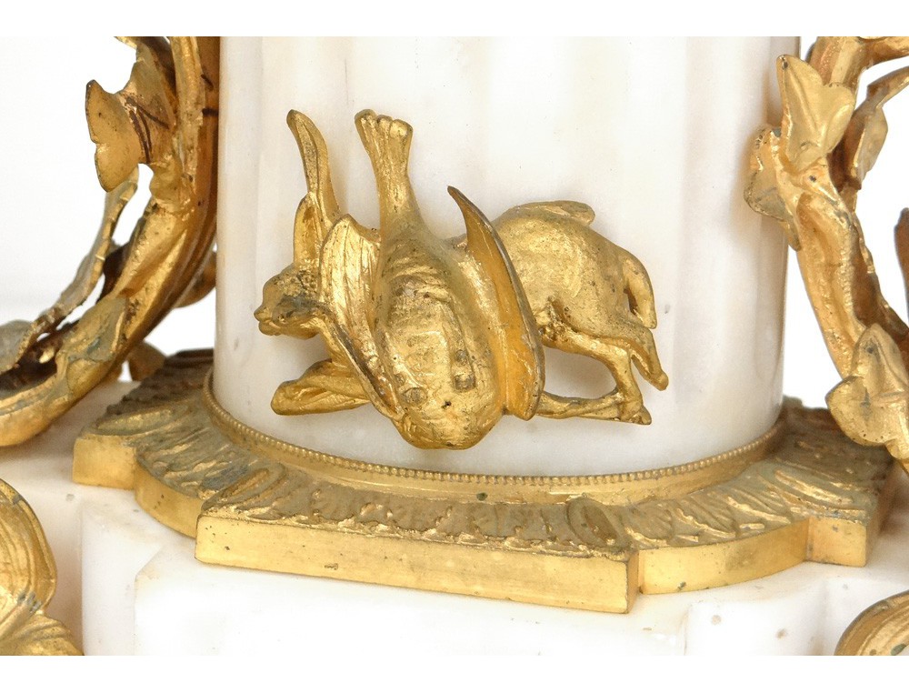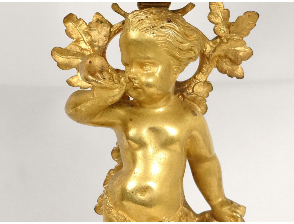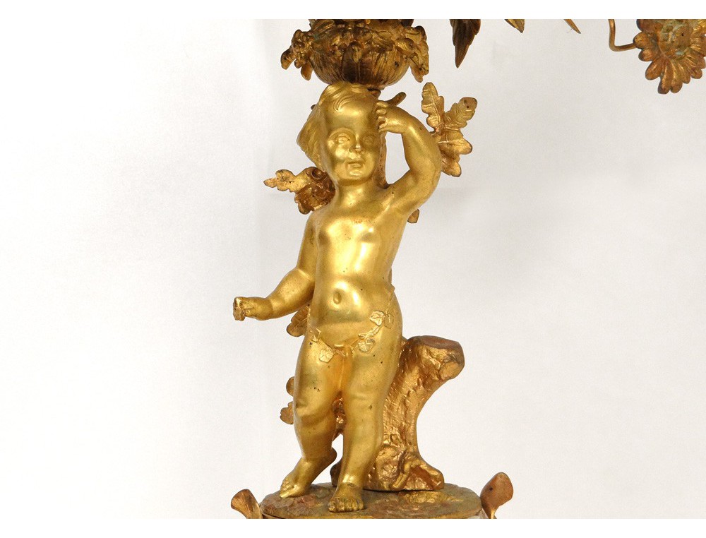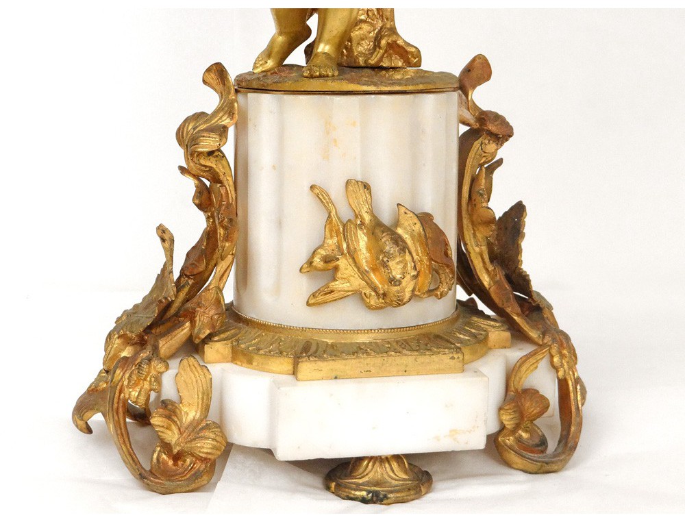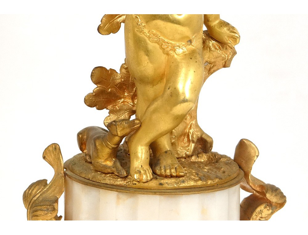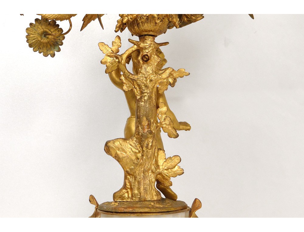 Superb and great pair of candelabra 6 lights, finely chiseled gilt bronze, decorated with two putti or Amours (one playing the French horn with a dog lying at his feet) and flowers and foliage, marble base white decorated with hunting trophies (hare and partridge) and ivy leaves, Napoleon III nineteenth century.