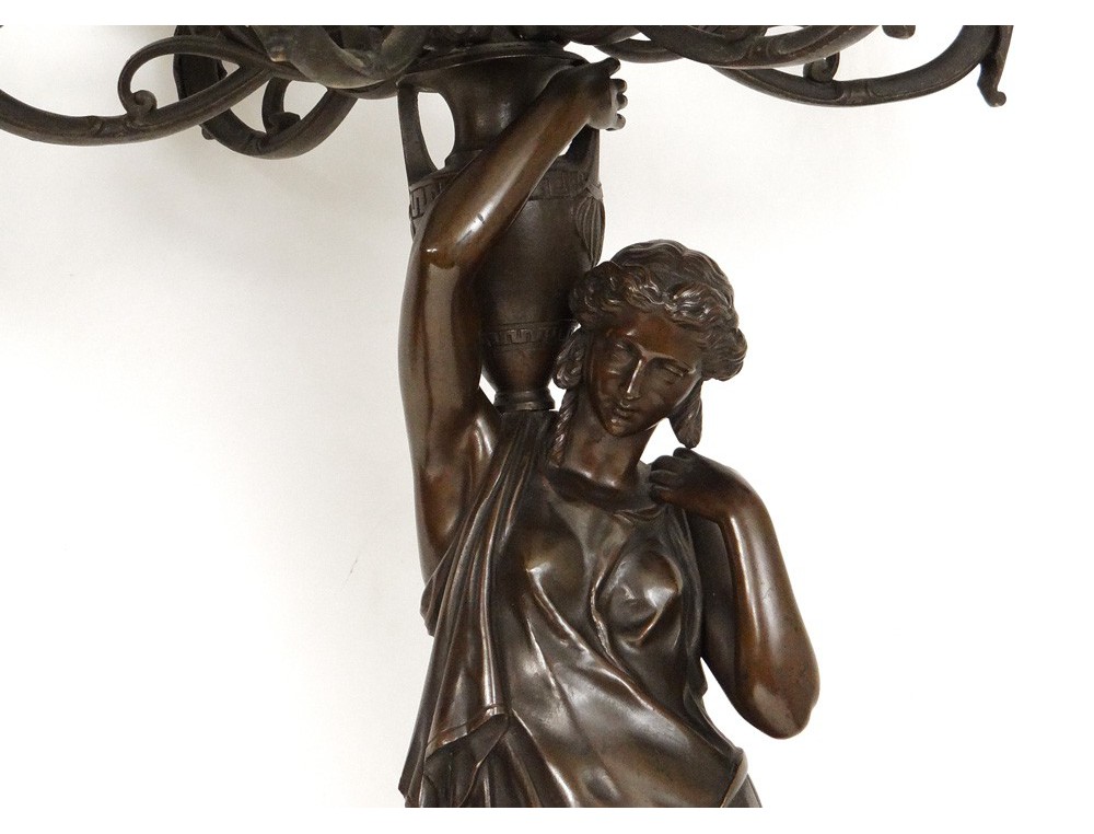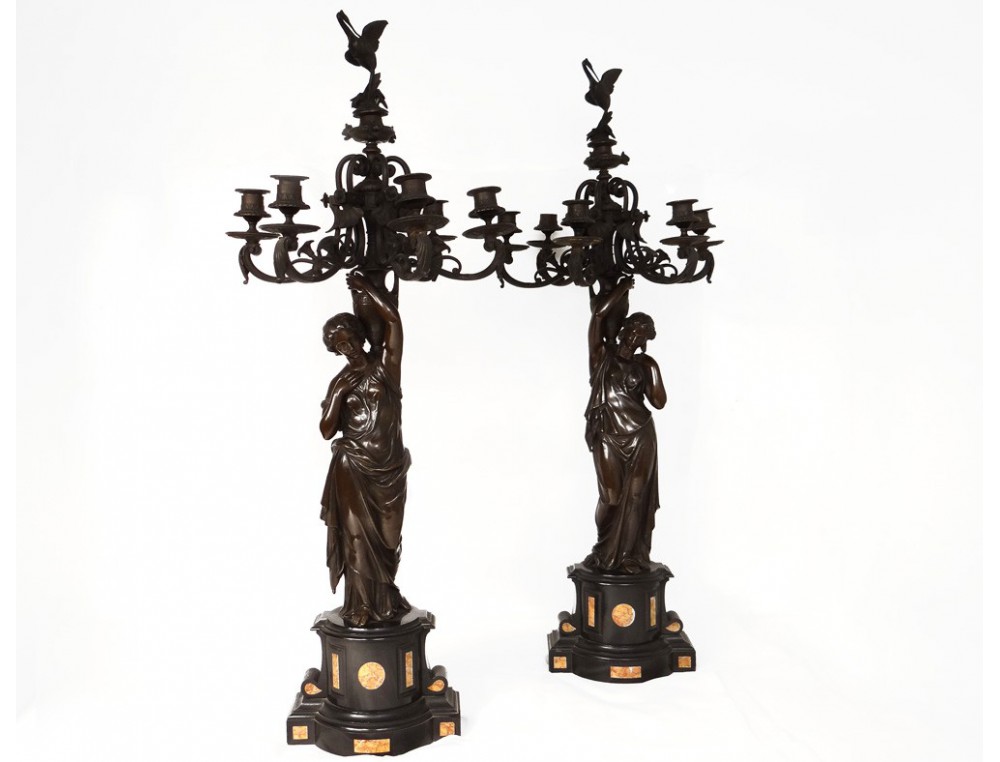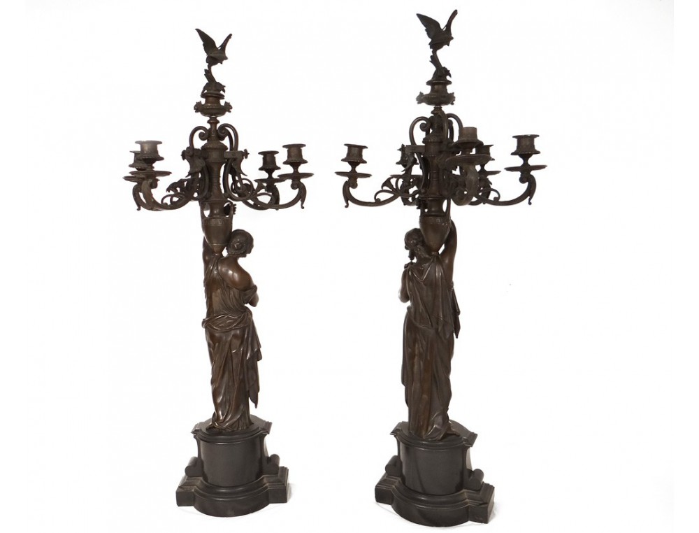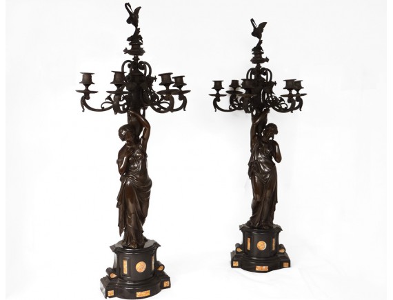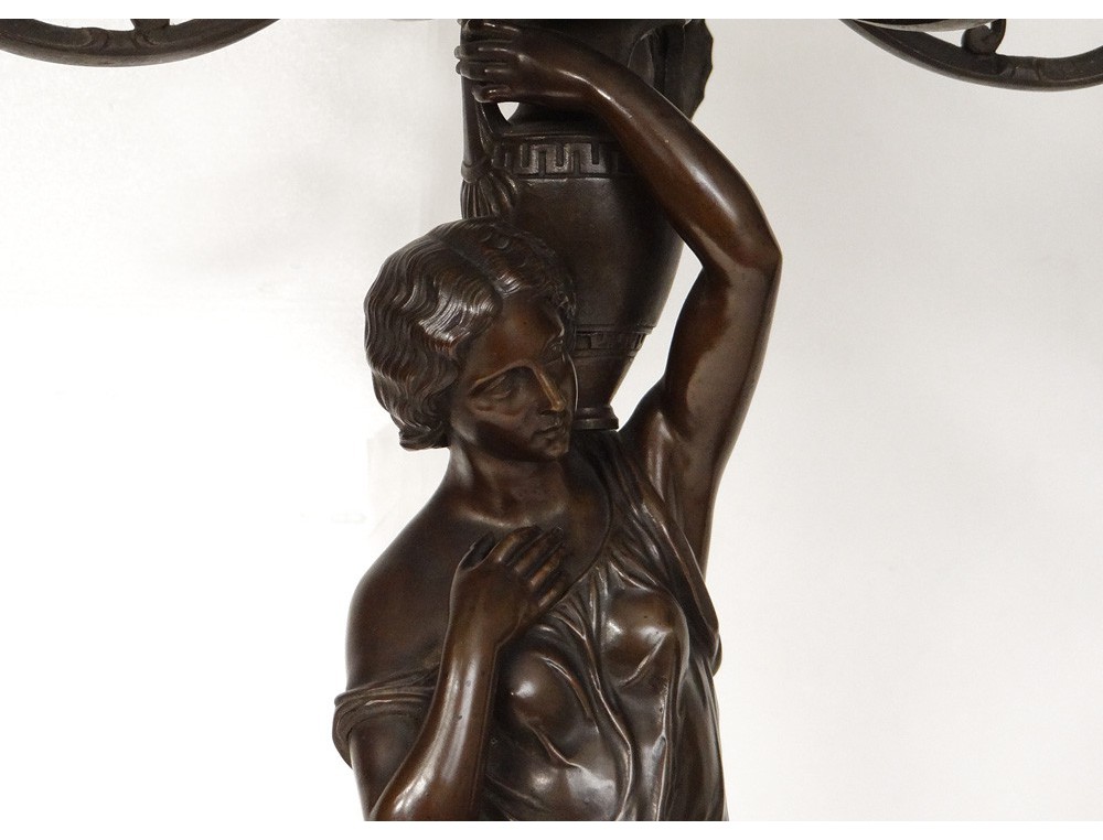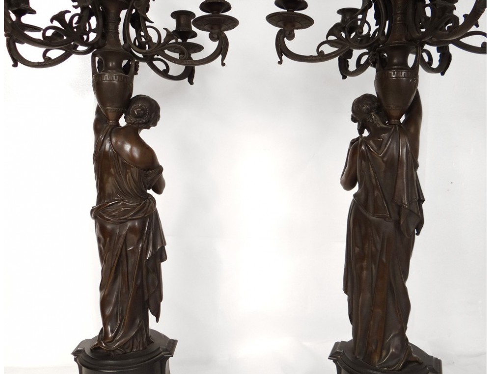 Great pair of candlesticks candelabra forming five fires in brown patina bronze, representing two caryatiades or women draped in antique holding an amphora shoulder, topped herons and roaring lion heads, perhaps the work of sculptor Carrier-Belleuse, inlaid marble pedestals, Napoleon III nineteenth century.