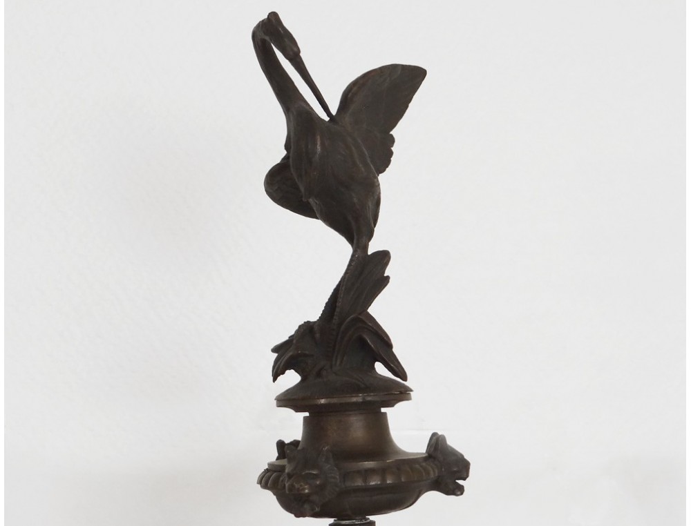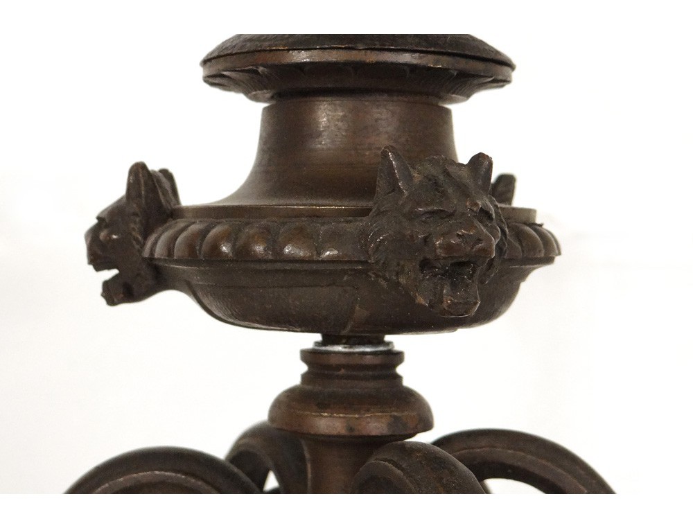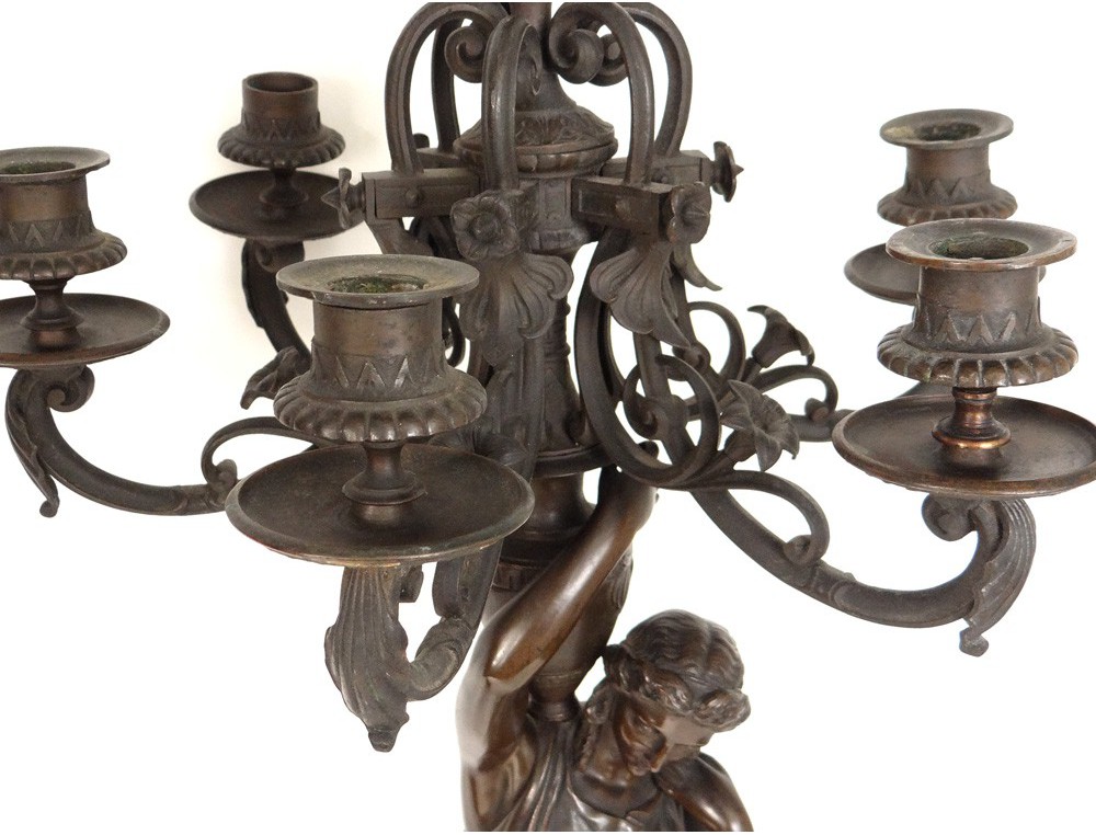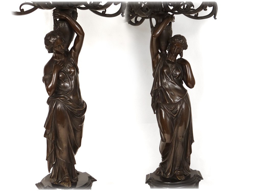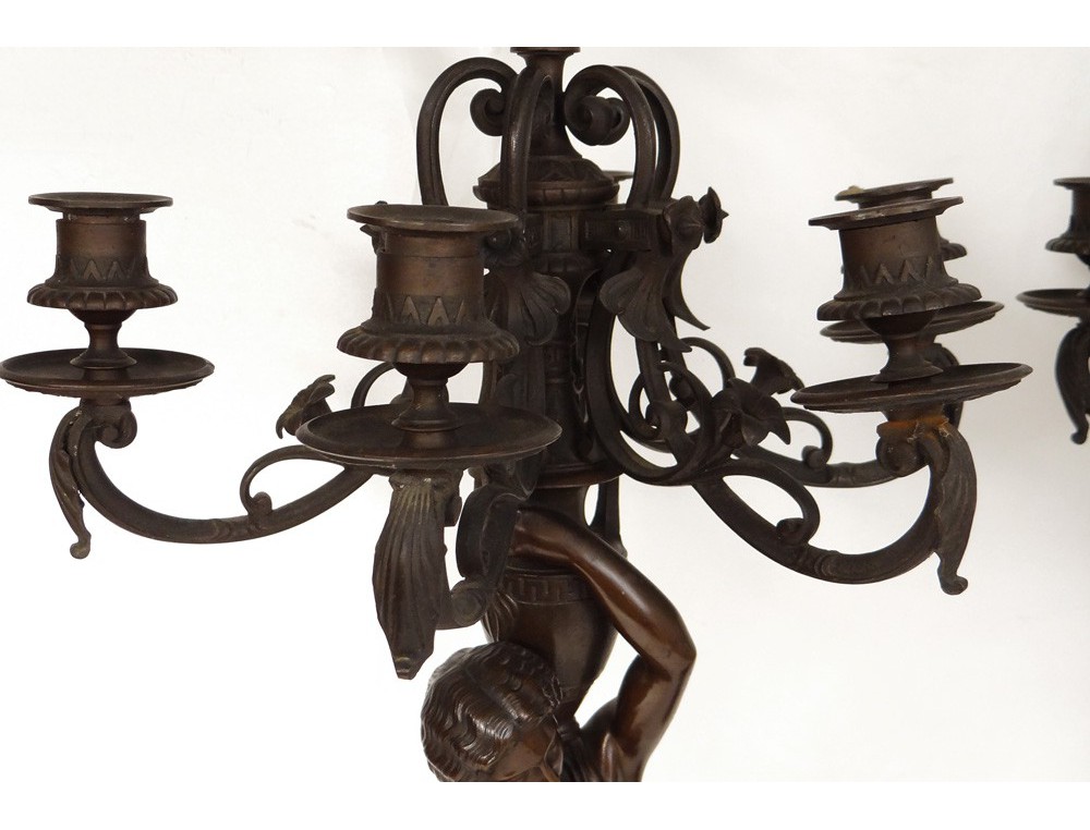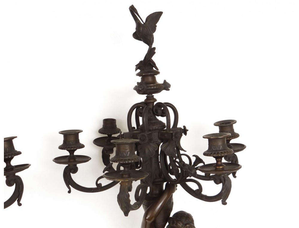 Great pair of candlesticks candelabra forming five fires in brown patina bronze, representing two caryatiades or women draped in antique holding an amphora shoulder, topped herons and roaring lion heads, perhaps the work of sculptor Carrier-Belleuse, inlaid marble pedestals, Napoleon III nineteenth century.