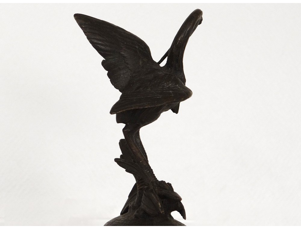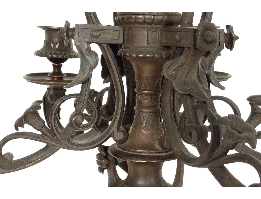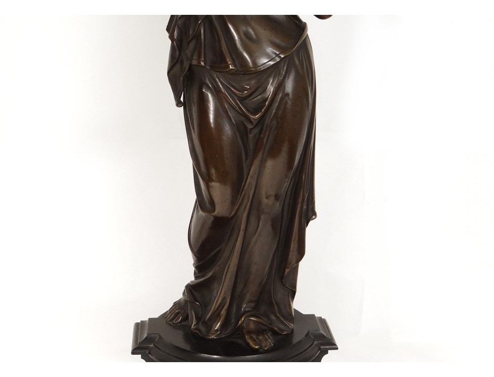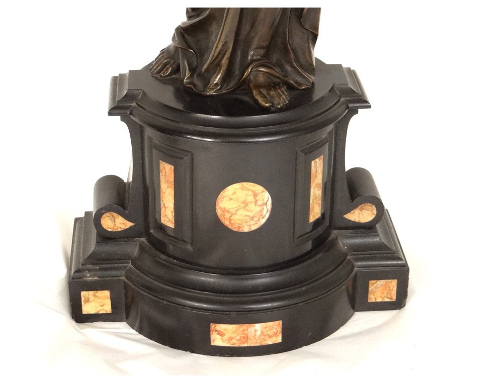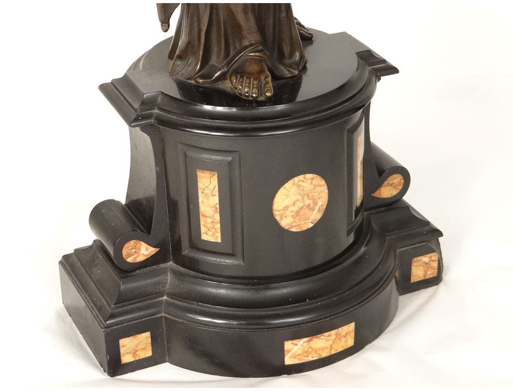 Great pair of candlesticks candelabra forming five fires in brown patina bronze, representing two caryatiades or women draped in antique holding an amphora shoulder, topped herons and roaring lion heads, perhaps the work of sculptor Carrier-Belleuse, inlaid marble pedestals, Napoleon III nineteenth century.