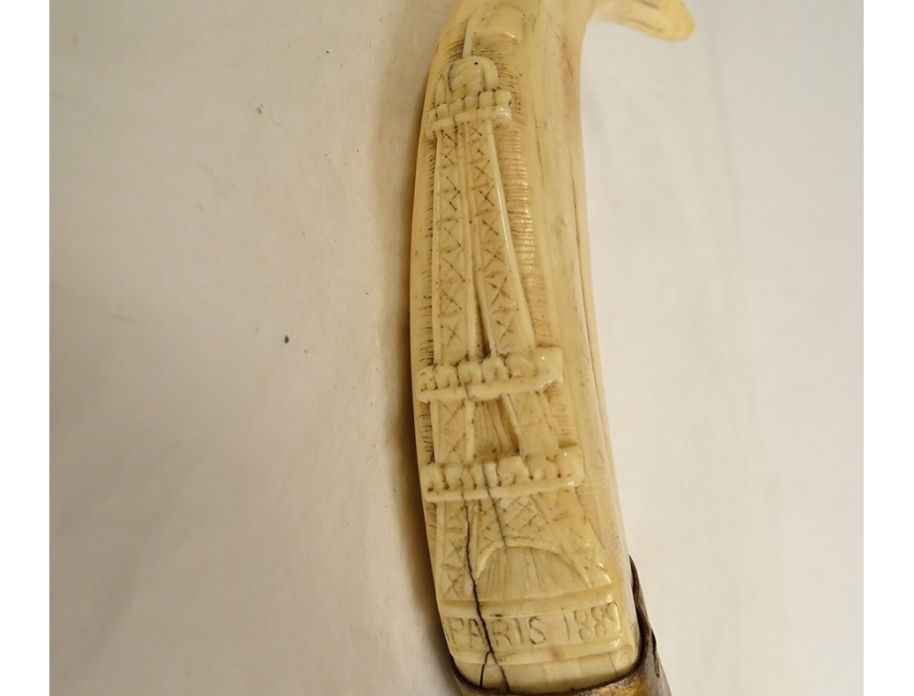Old cane, bamboo barrel, carved warthog tooth knob, decorated with the Eiffel Tower and marked Paris 1889, souvenir of its construction during the Universal Exhibition, from the late 19th century.