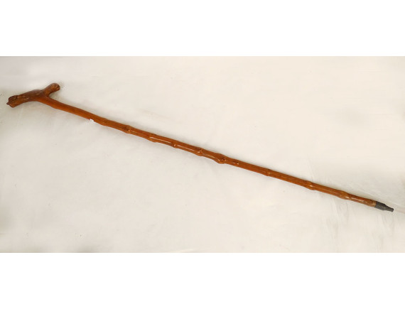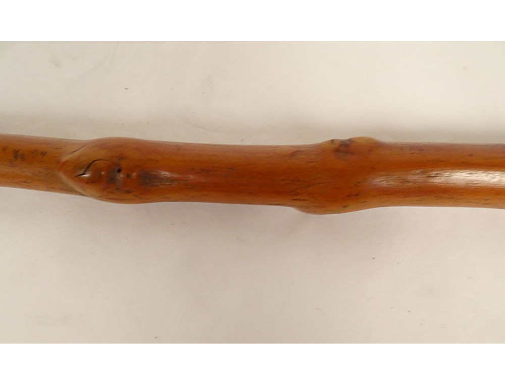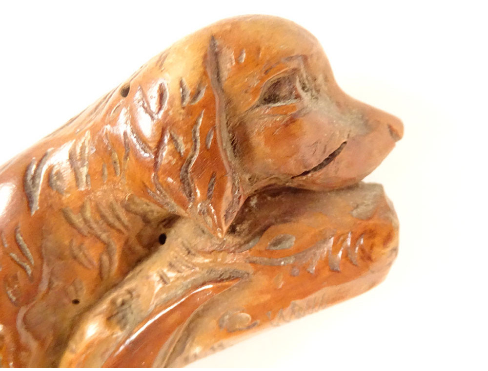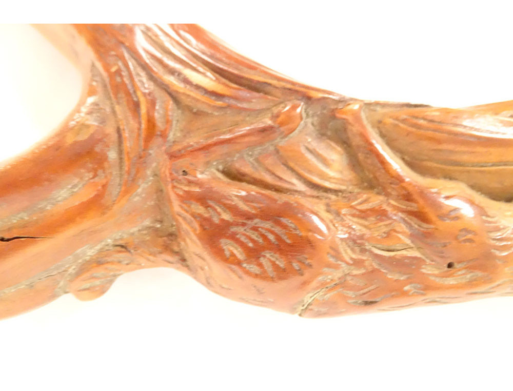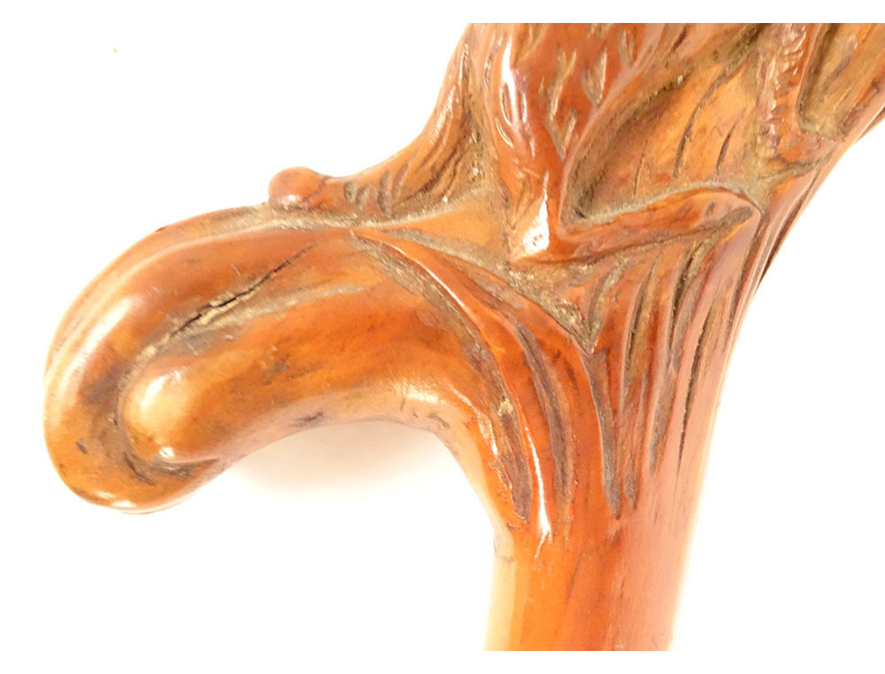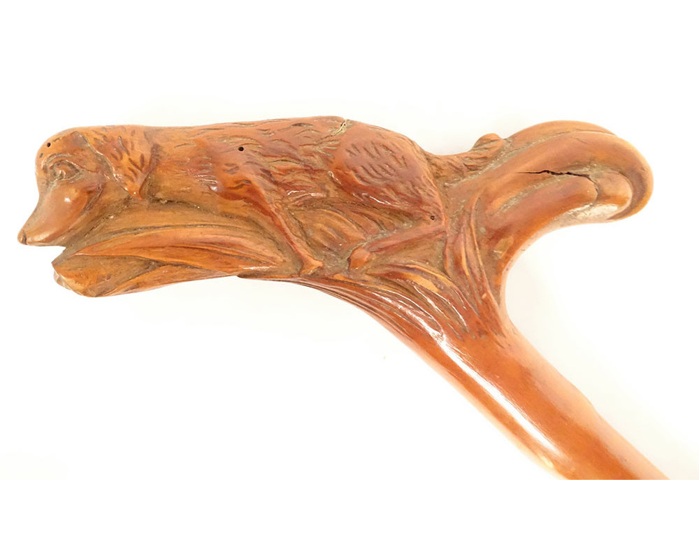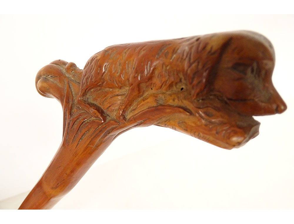 Carved boxwood cane (monoxyl), decorated with a dog lying on the handle, shaft carved in thorny wood style, work of folk art, 19th century period.