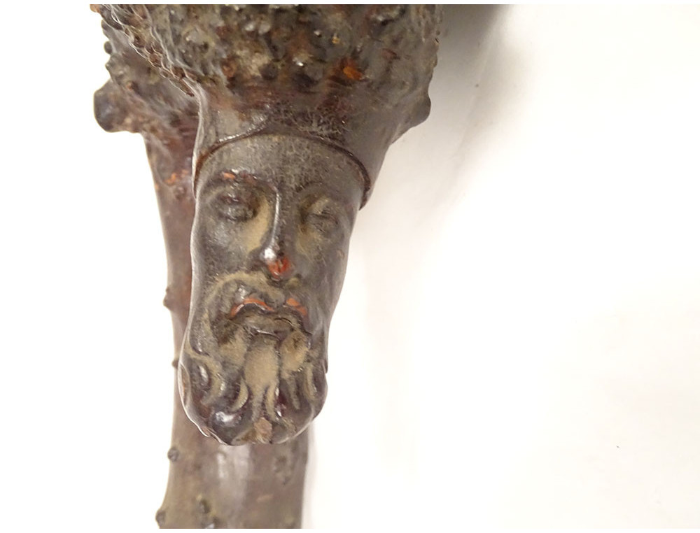 Rare imposing antique walking stick carved from a single block of wood, pommel in the shape of a lion's head with a bearded man's head underneath, twisted and thorny shaft, a work of Folk Art from the 19th century.