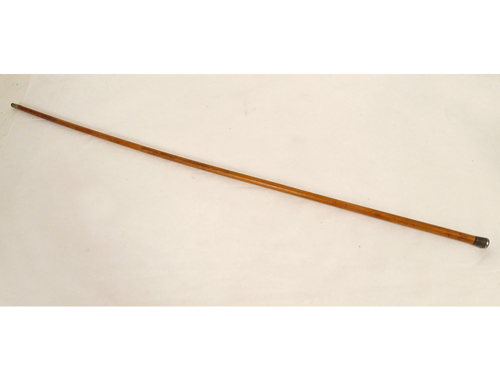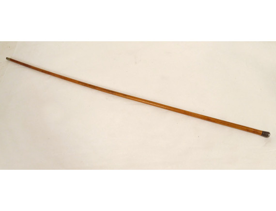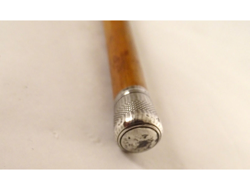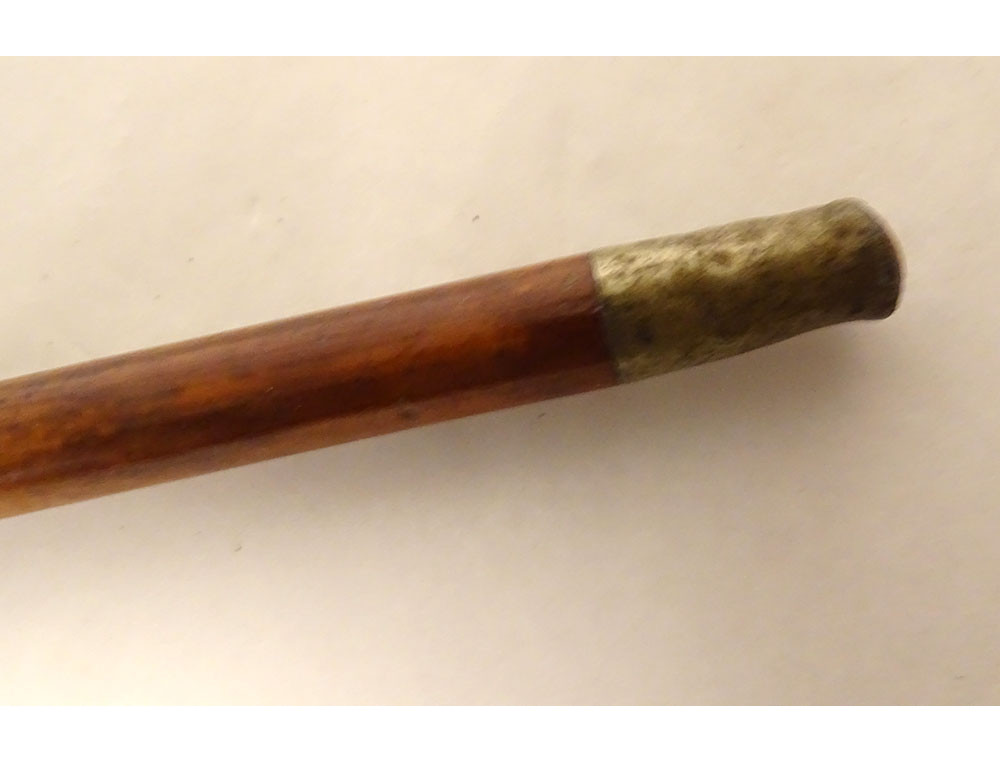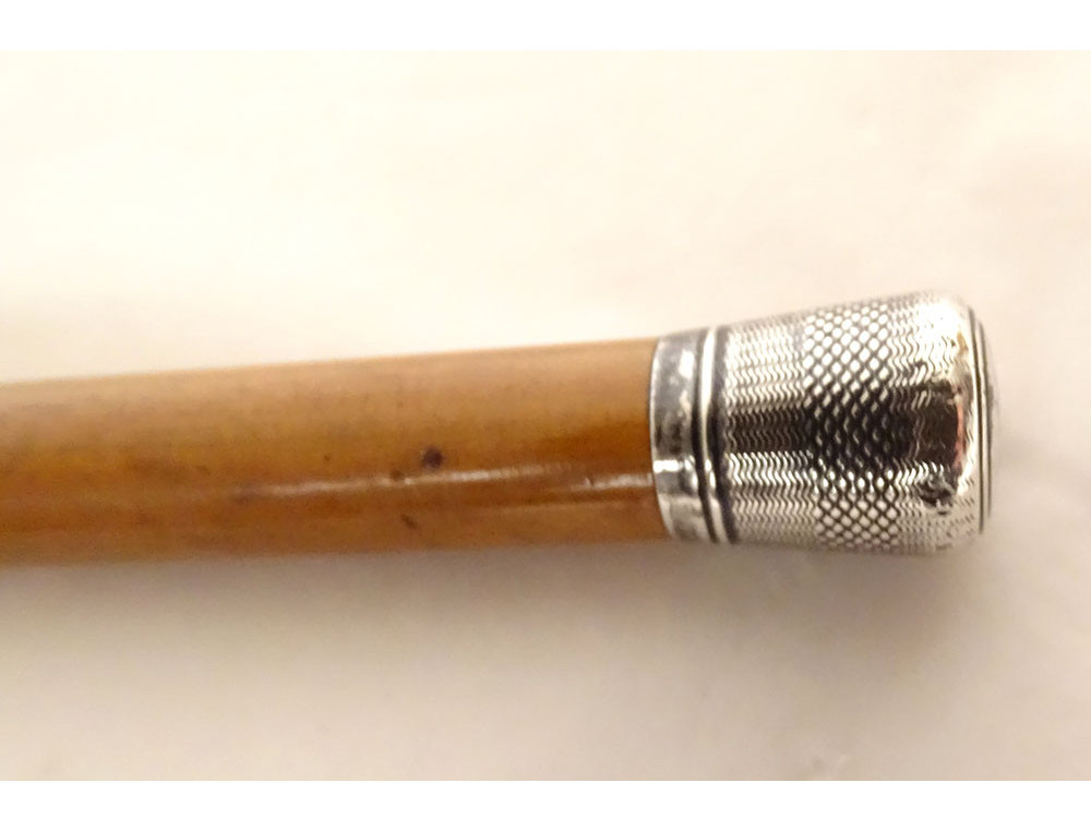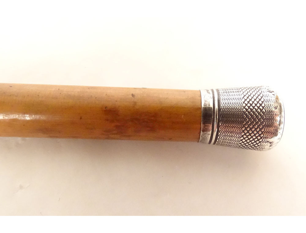 Antique walking stick, pommel most likely made of finely chiseled and guilloché silver, shaft made of malacca cane, from the 19th century.