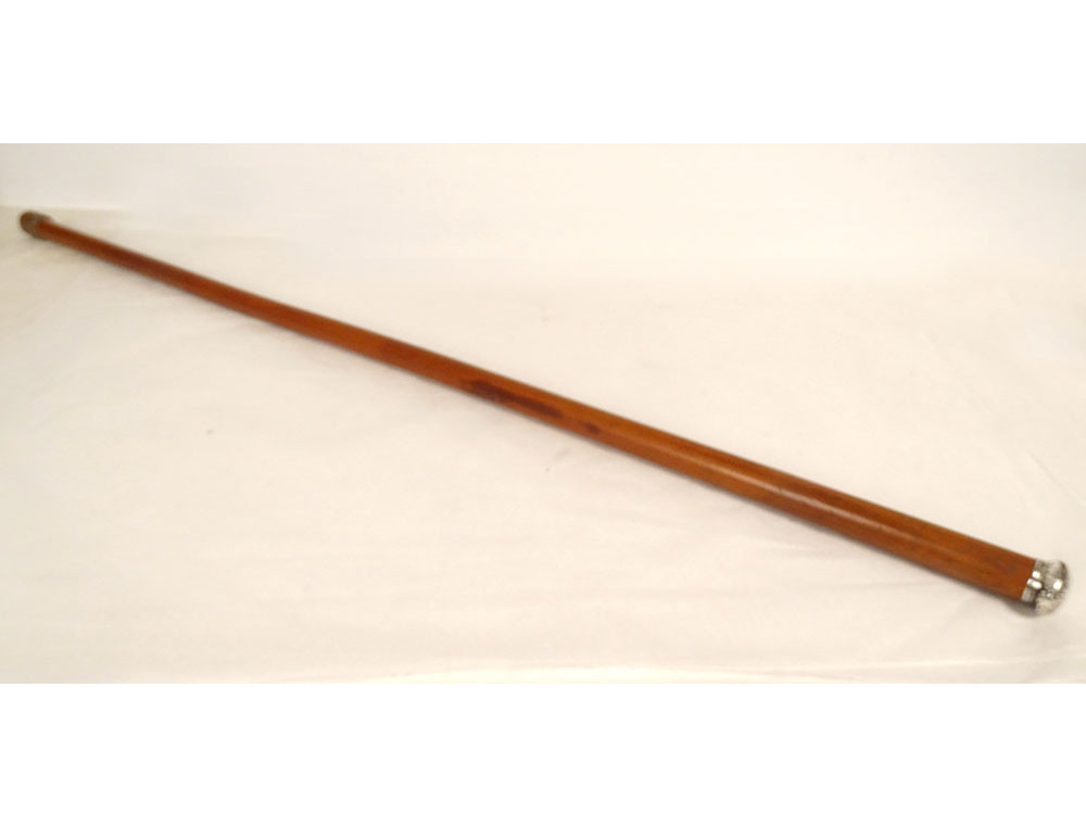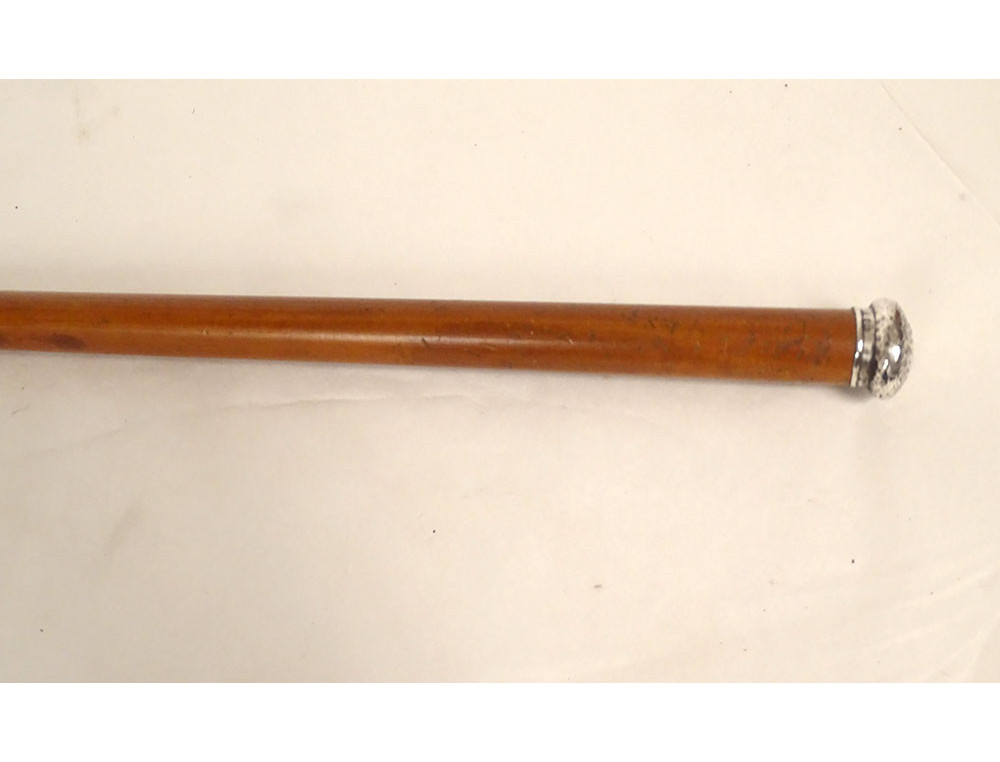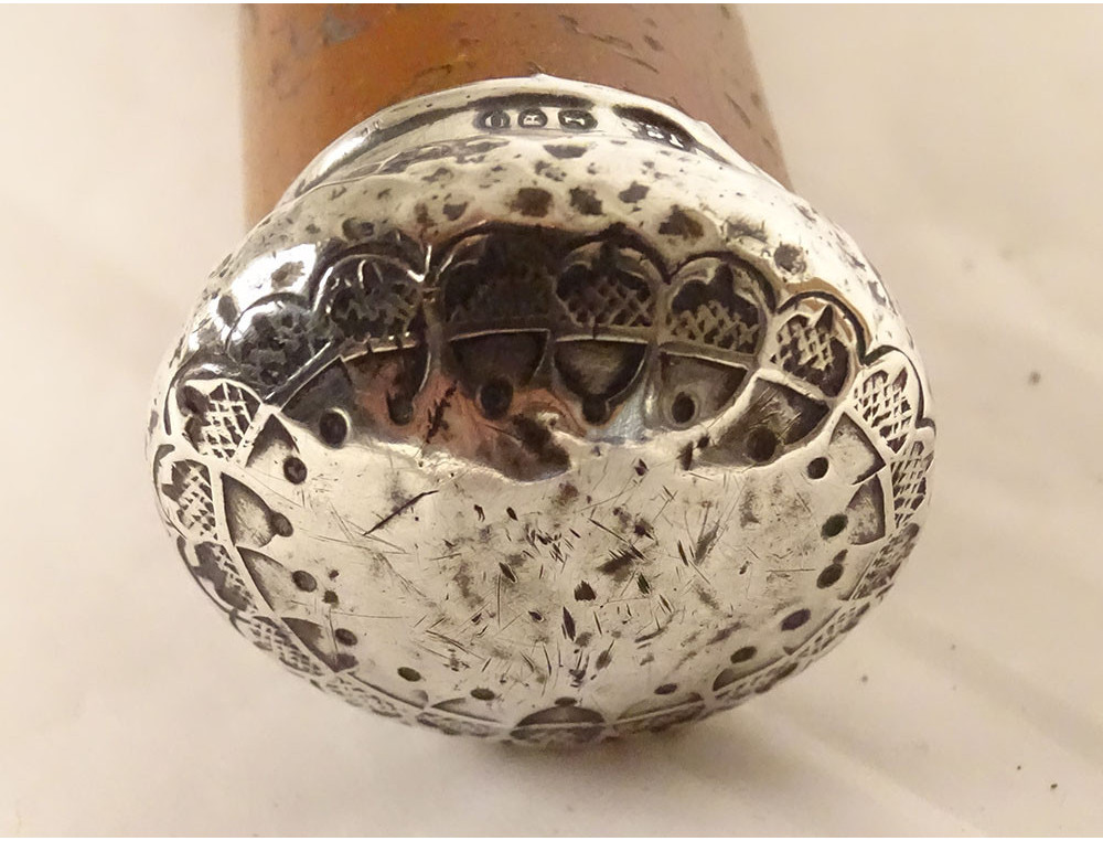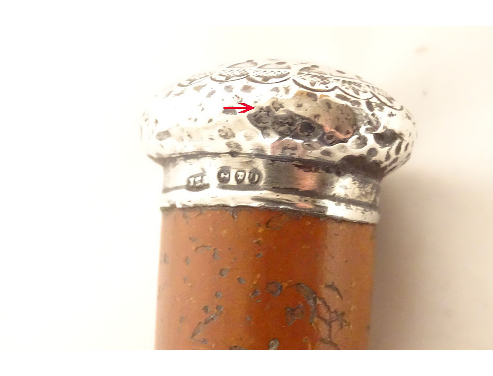 Antique walking stick, pommel most likely made of finely chiseled and guilloché silver, shaft made of malacca cane, from the 19th century.
