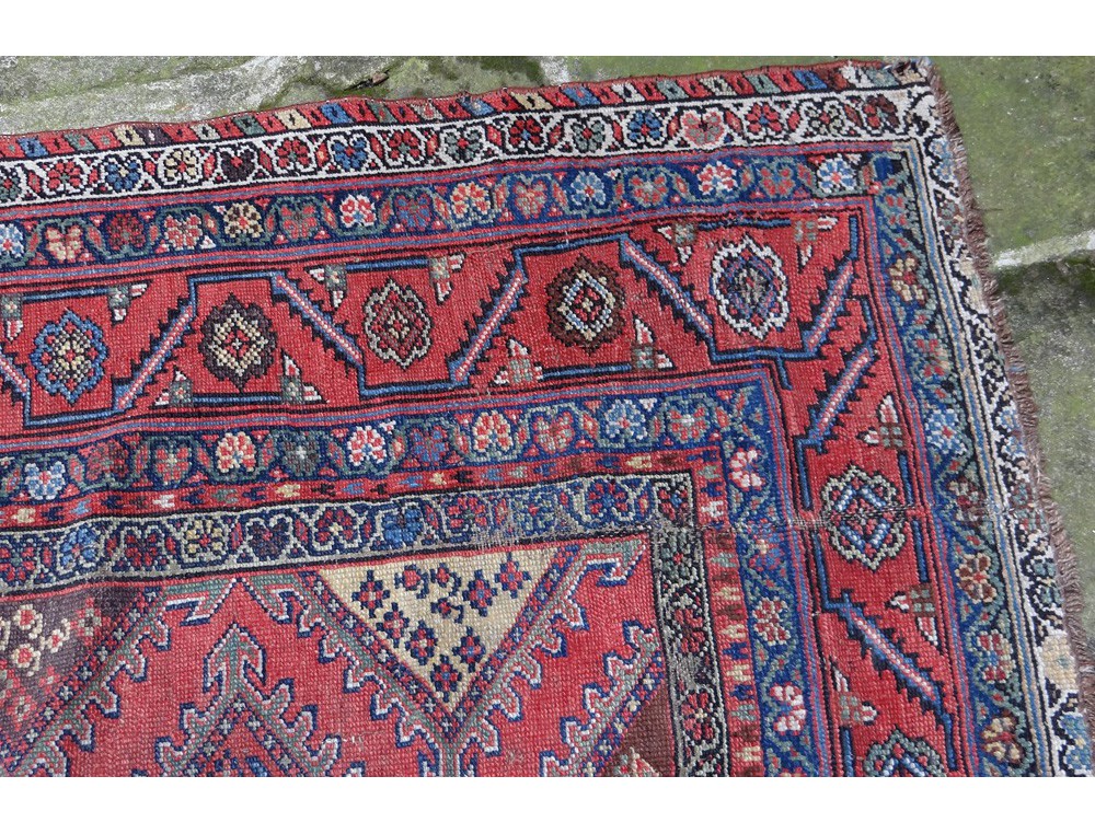 Beautiful old wool rugs hand knotted decorated with geometric motifs and stylized flowers, originally from Iran, Persia, early twentieth century period.