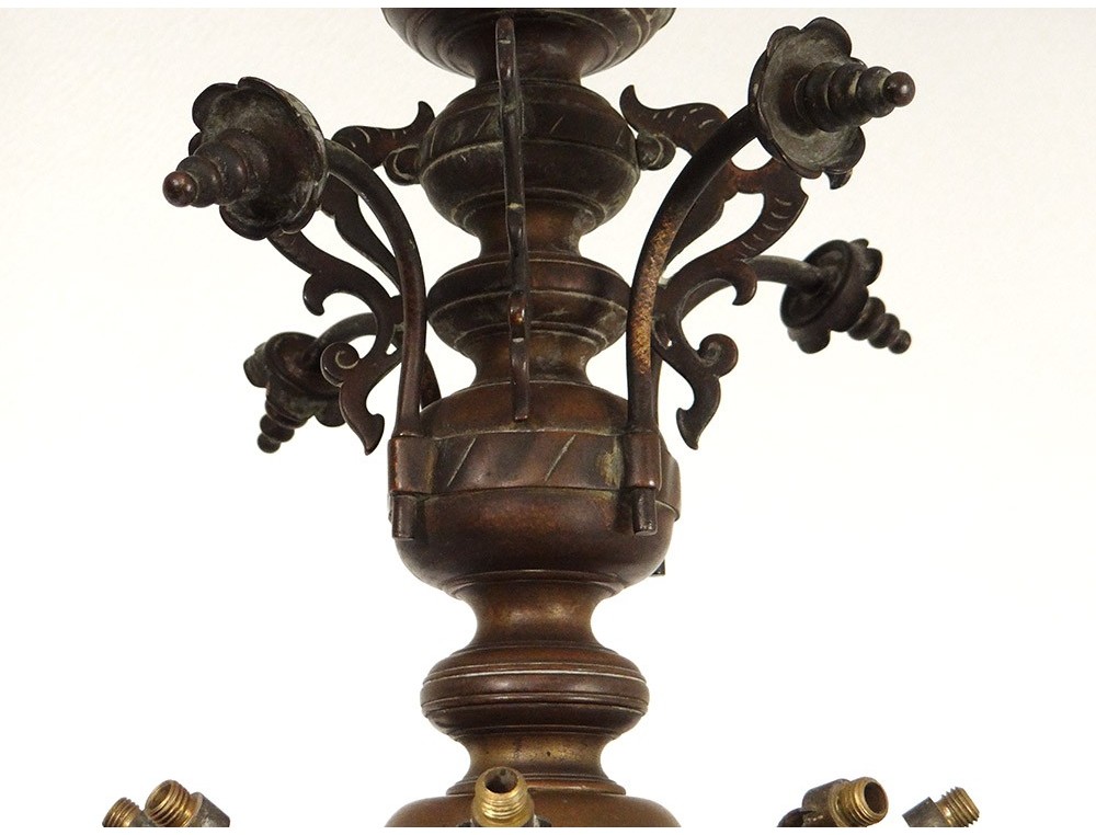 Shabbat lamp called Judenstern in the form of a chandelier with 8 branches placed in a star, in bronze, decorated with birds in the upper part, from the 18th century.