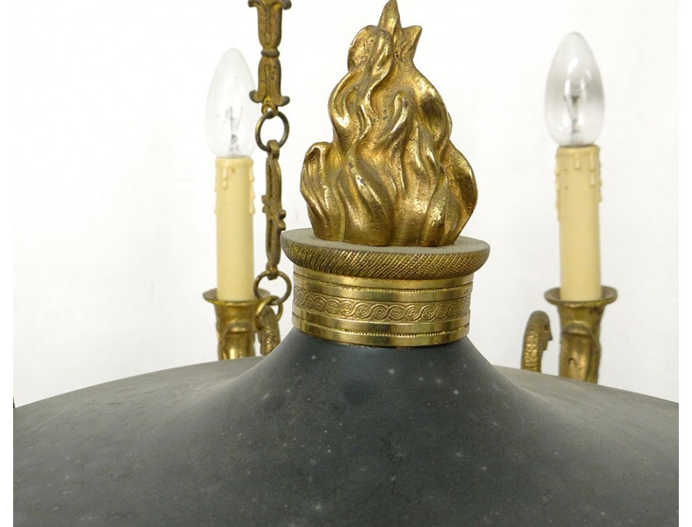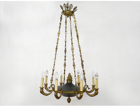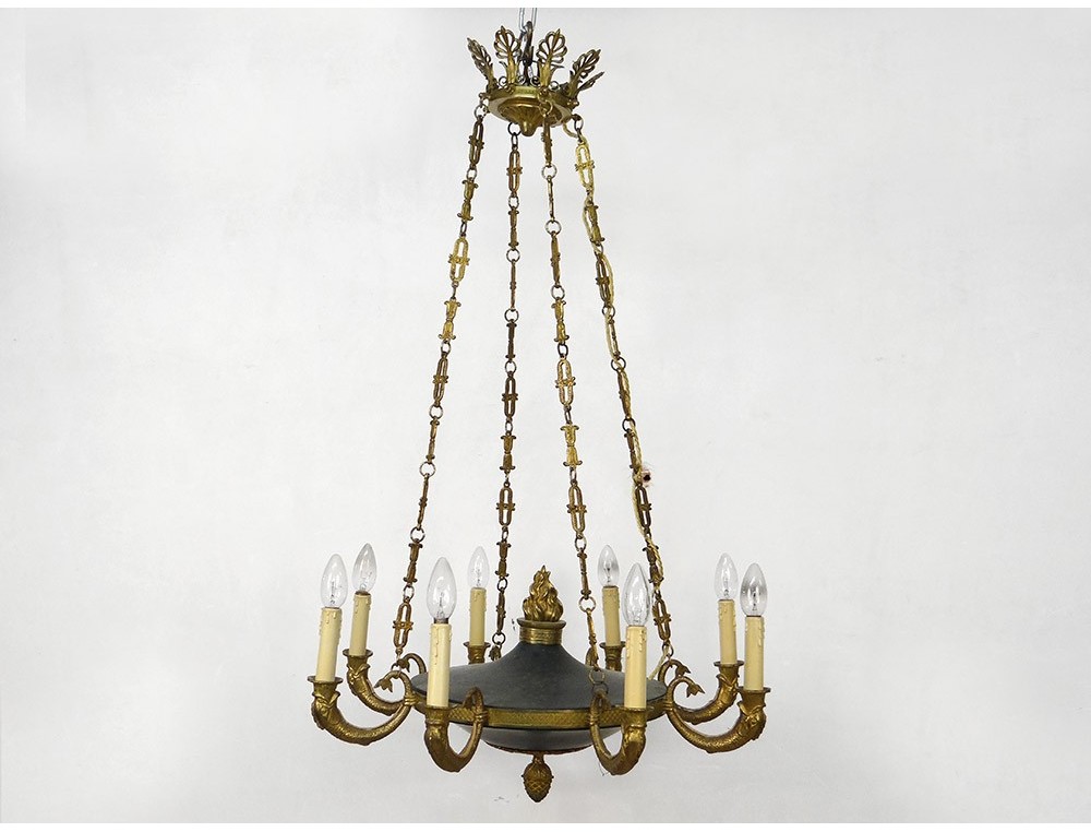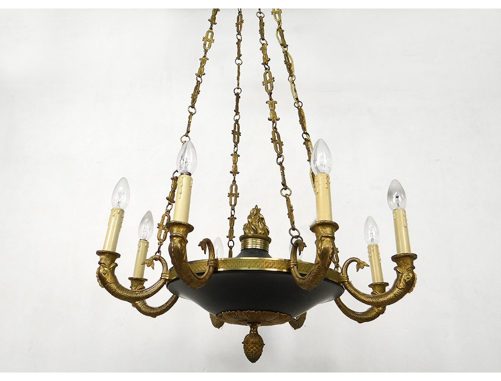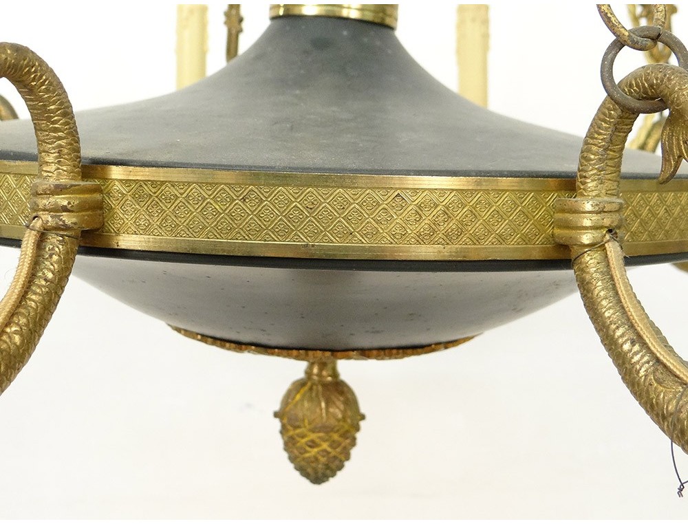 Empire style chandelier with 8 burners, bronze with two patinas (golden and green), dolphin-shaped sconces, flame-on body with stylized friezes, underneath a pine cone and leaves acanthus, chiseled upper part of palmettes, vintage early twentieth century.