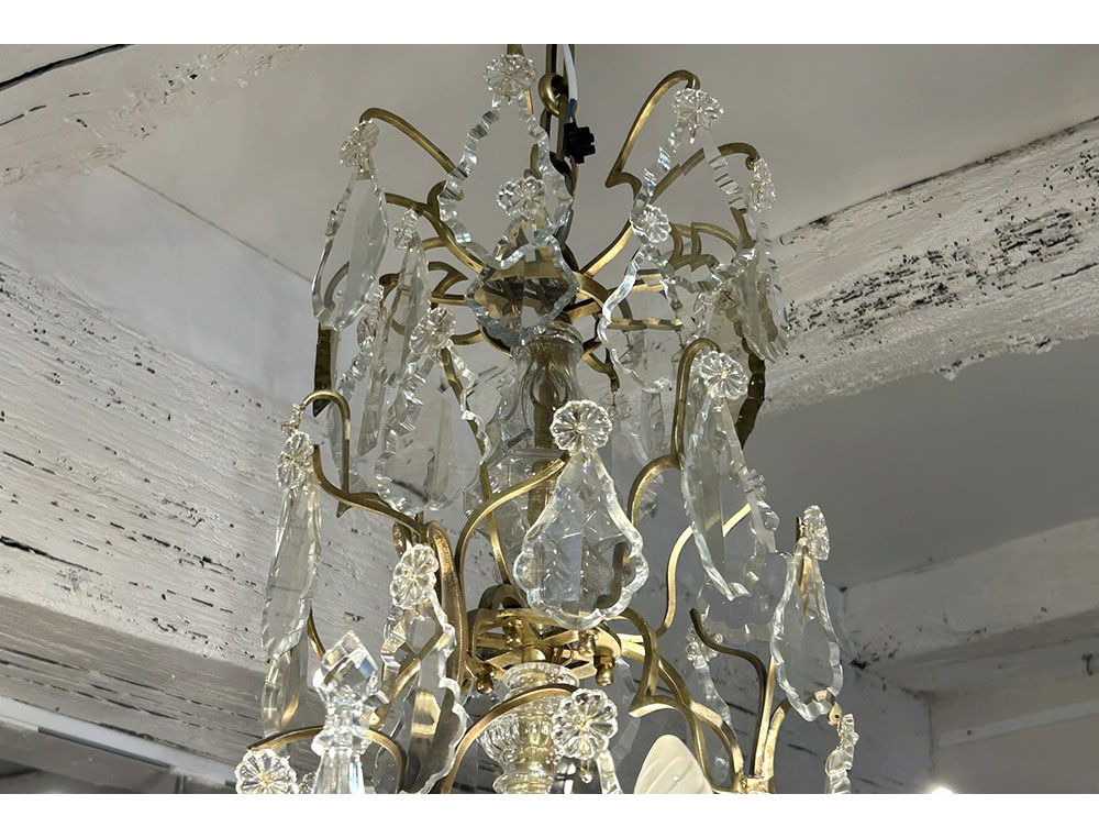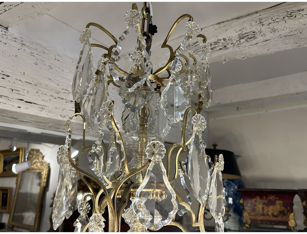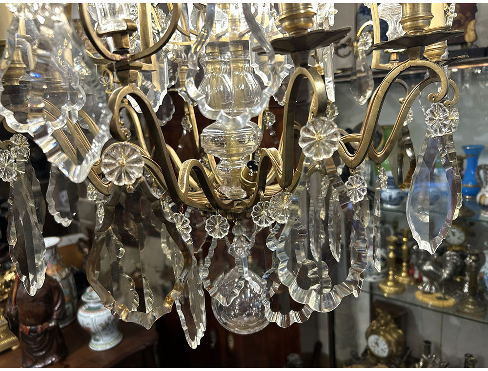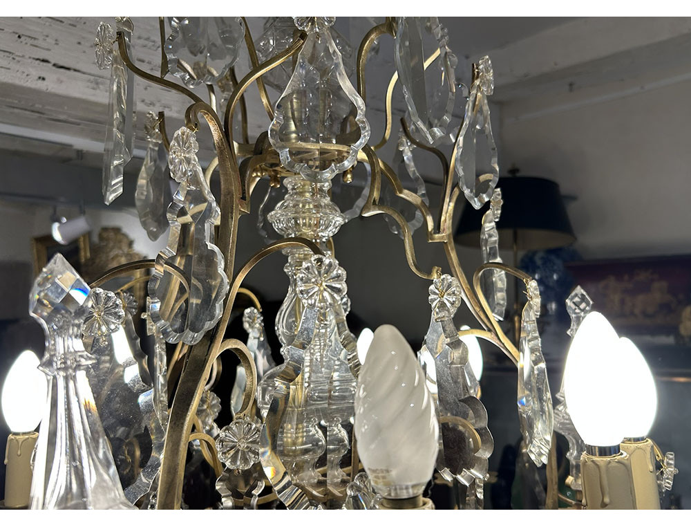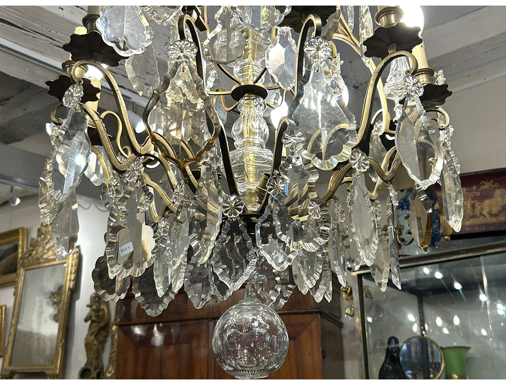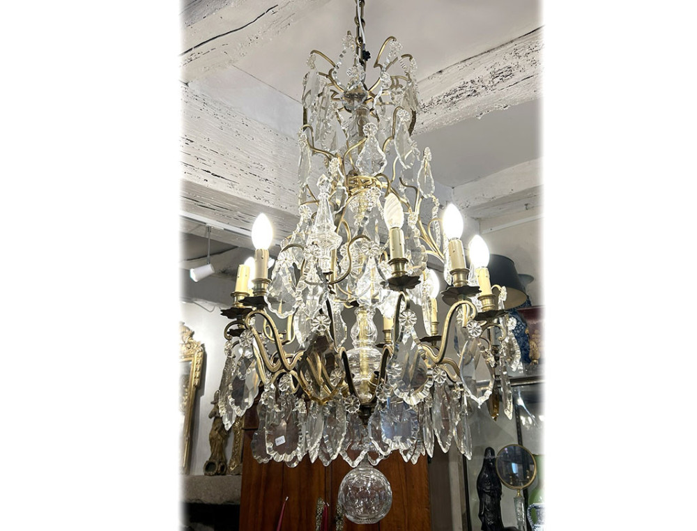 12-light chandelier (9 in a crown and 3 in the center), in cut crystal decorated with drops (some smoky colour), pendants, knives, small flowers and a beautiful ball, bronze mount (golden patina), late 19th century.