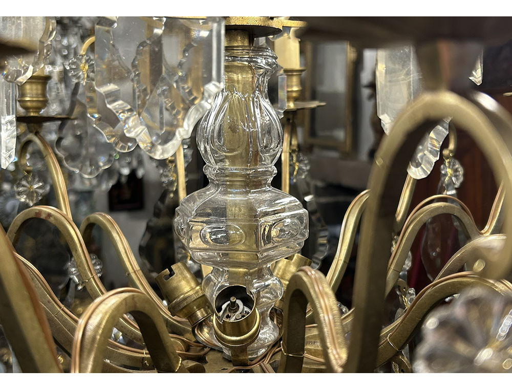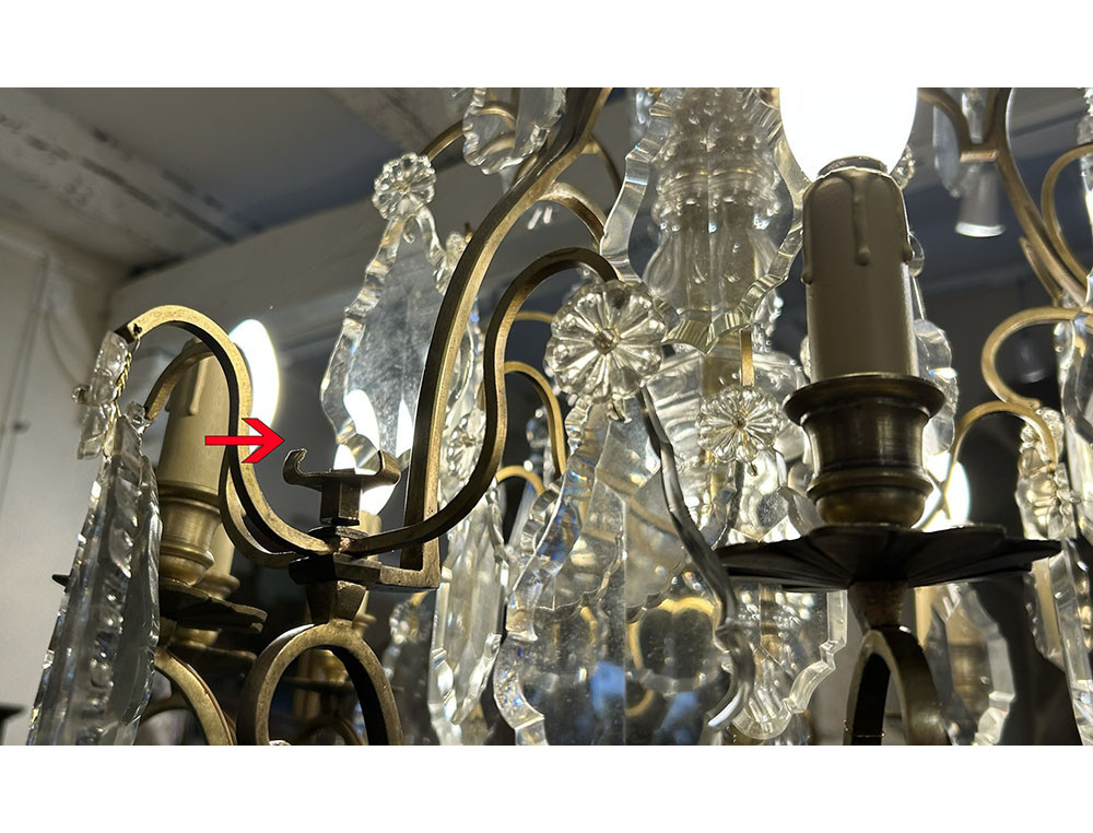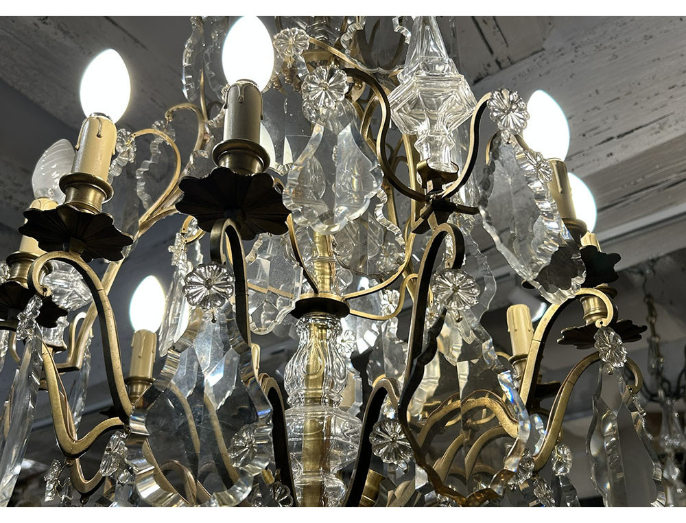 12-light bronze chandelier with cut crystal pendants and knife-shaped crystal drops, 19th century