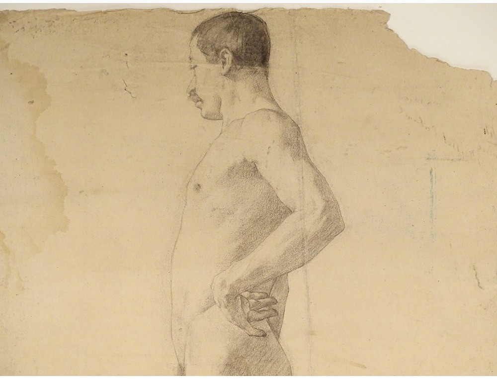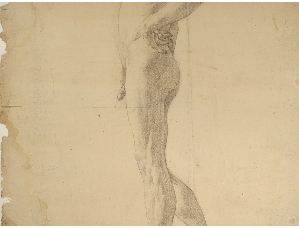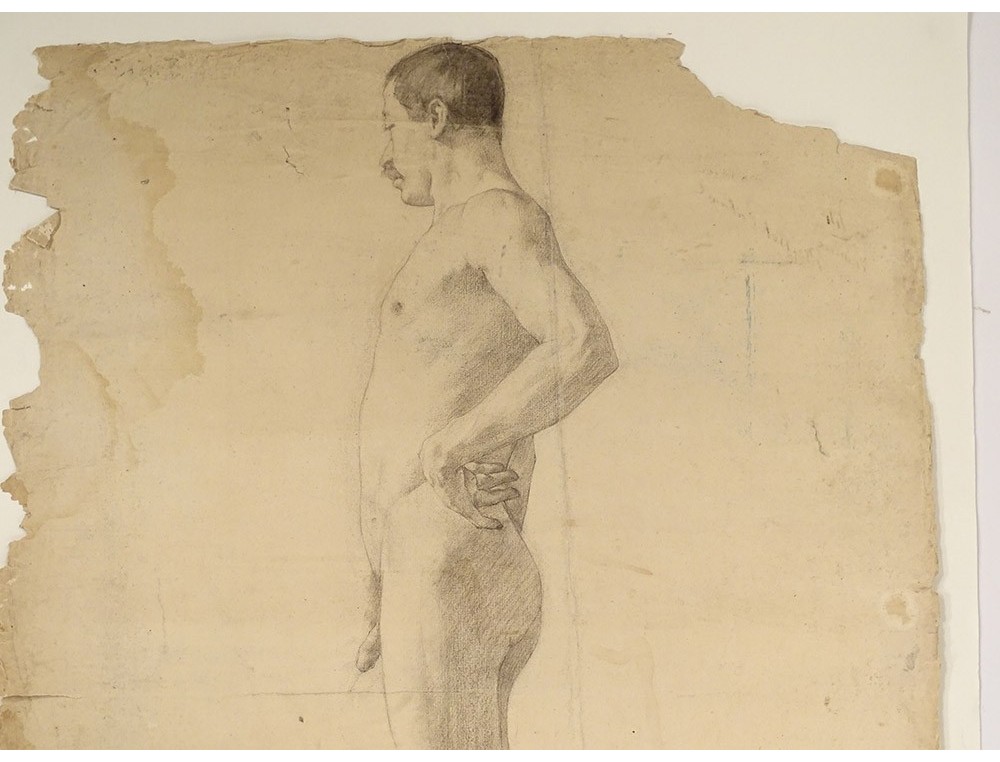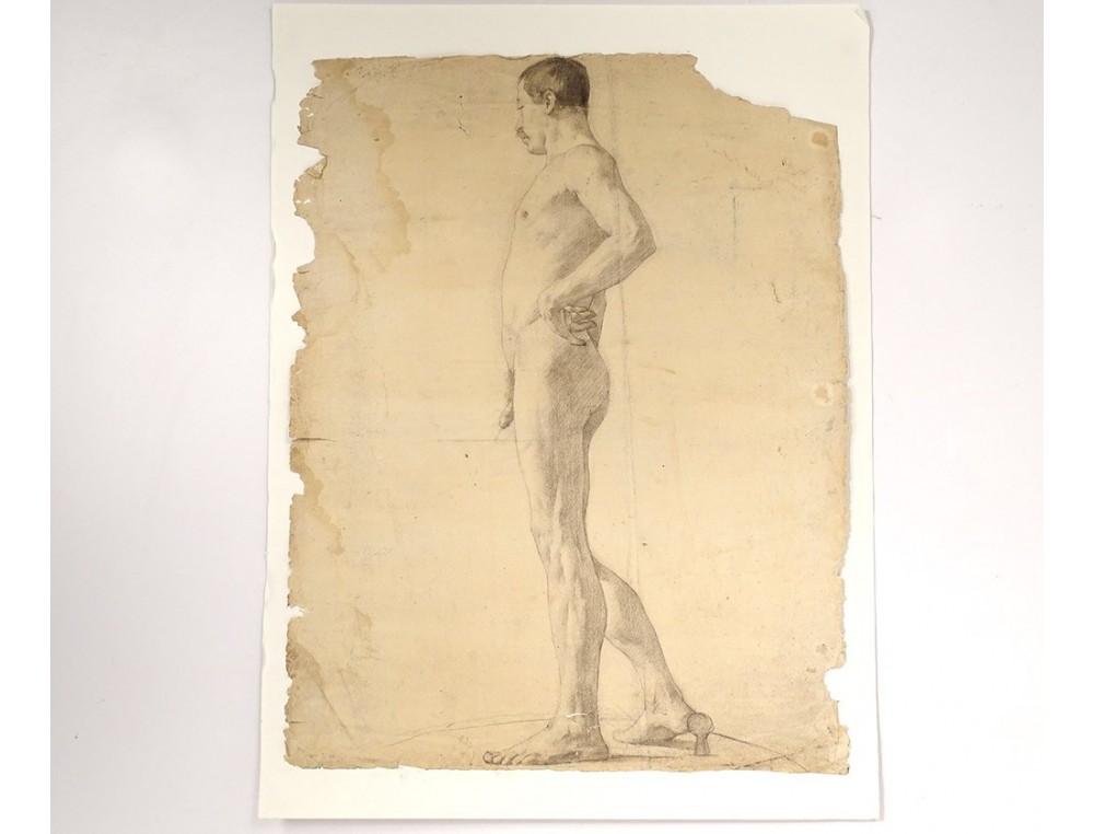 Pencil drawing representing a study of a standing naked man (called "academy"), by Romieu *, vintage late 19th century.