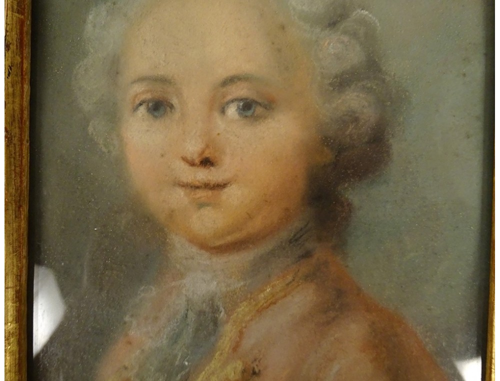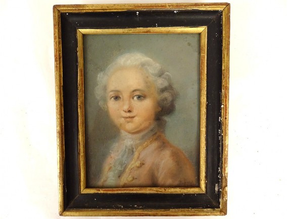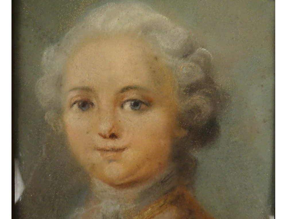 Pastel representing the portrait of a young noble boy, wearing a wig and a frock coat, signed lower right, from the 18th century.