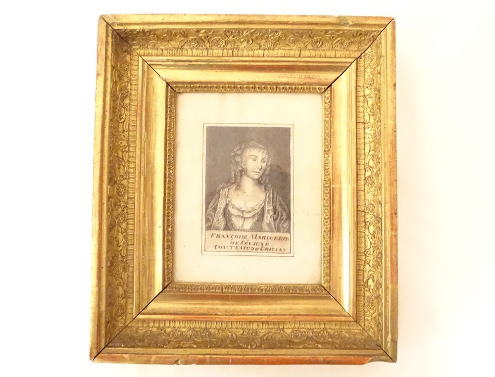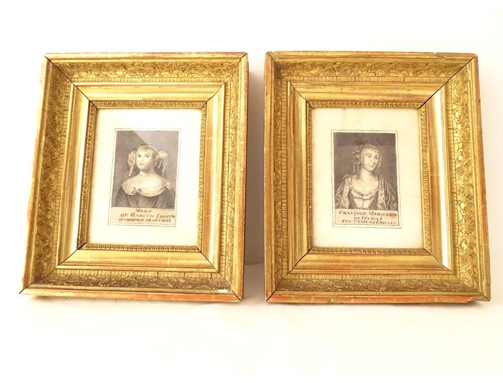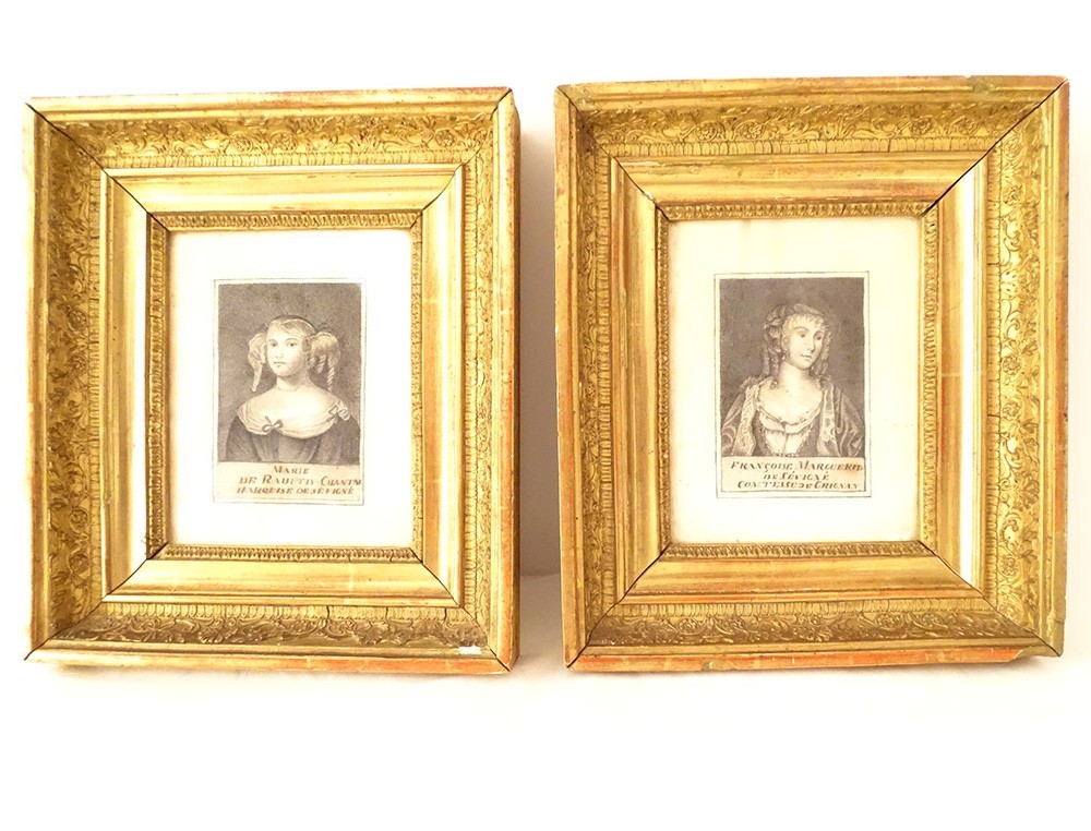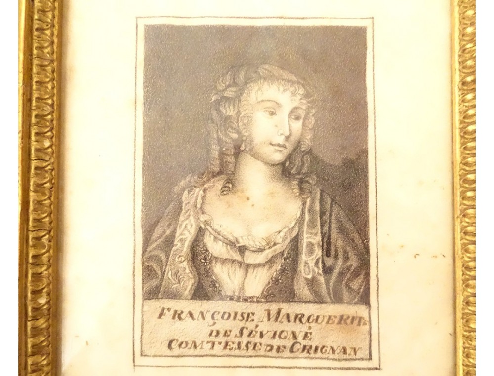 Pair of pencil drawings representing the portrait of Madame de Sévigné*, Marie de Rabutin-Chantal, Marquise de Sévigné and her daughter Françoise Marguerite de Sévigné, Countess of Grignan**, in gilded stuccoed wooden frames, from the first half of the 19th century.