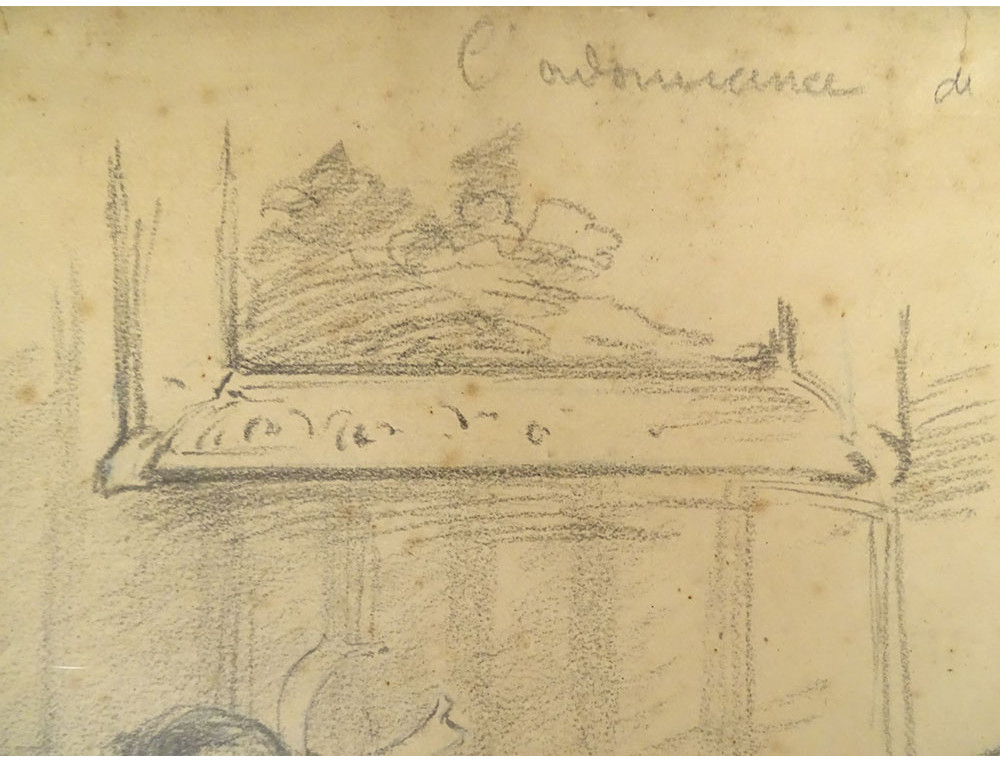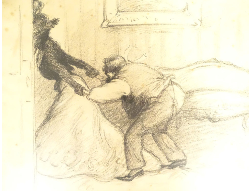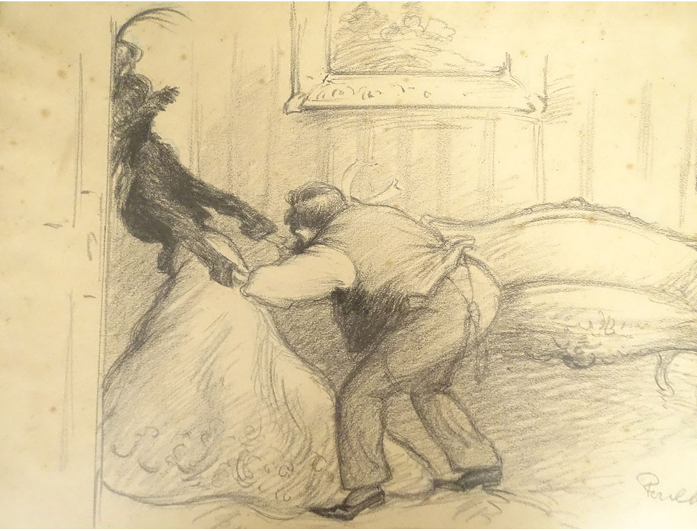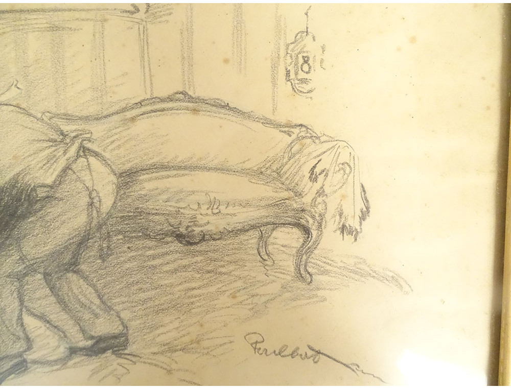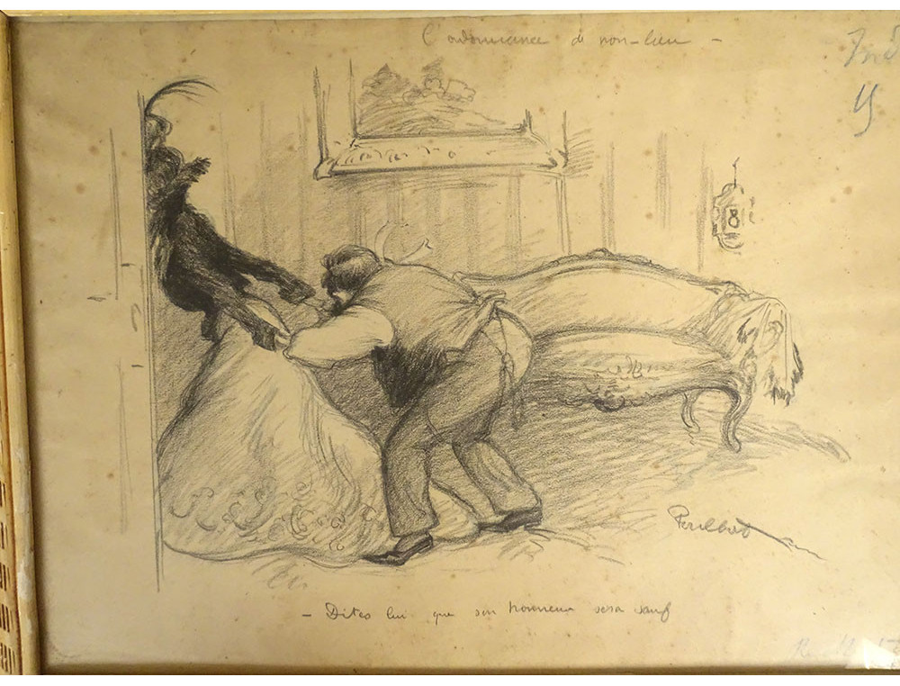 Drawing Francisque Poulbot naughty scene elegant couple bedroom humor 20th century