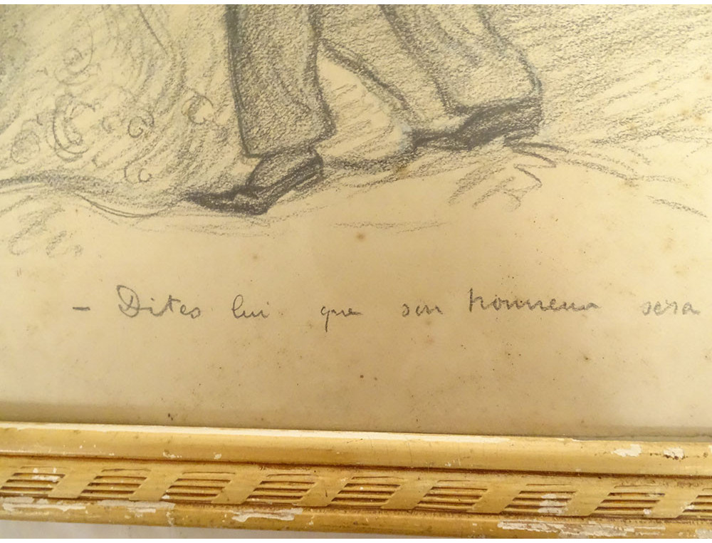 Drawing signed Poulbot* representing a humorous naughty scene, with a couple in a bedroom interior, entitled "Ordonnance de non-lieu" and at the bottom "Tell him that his honor will be safe", in a gilded frame, from the early 20th century.