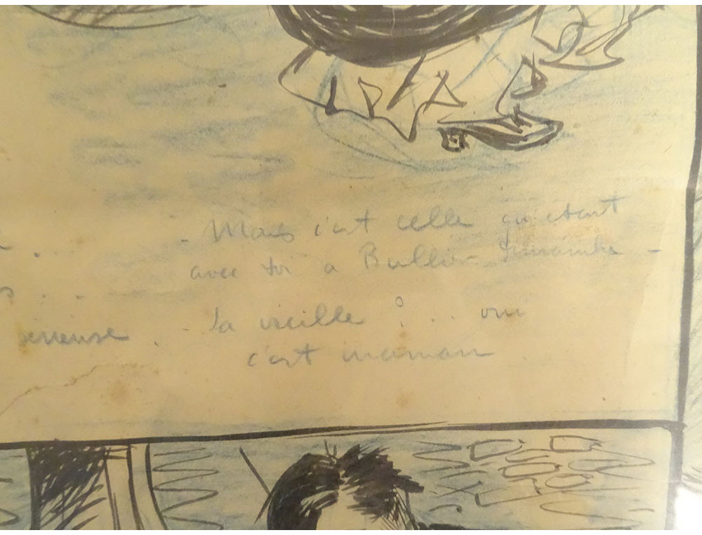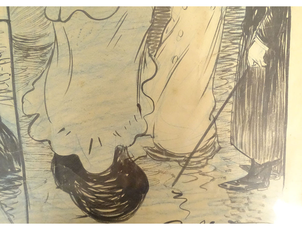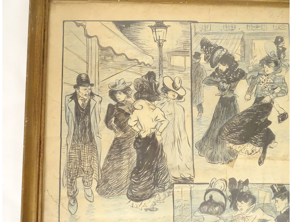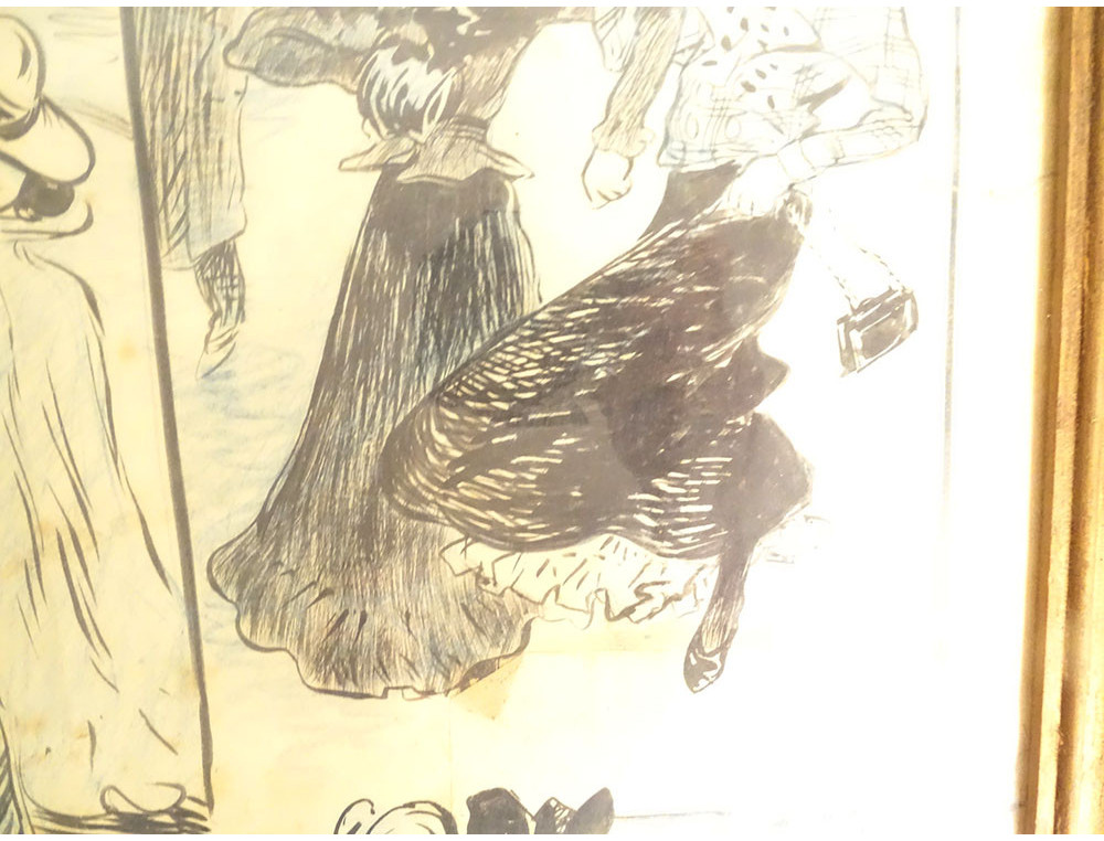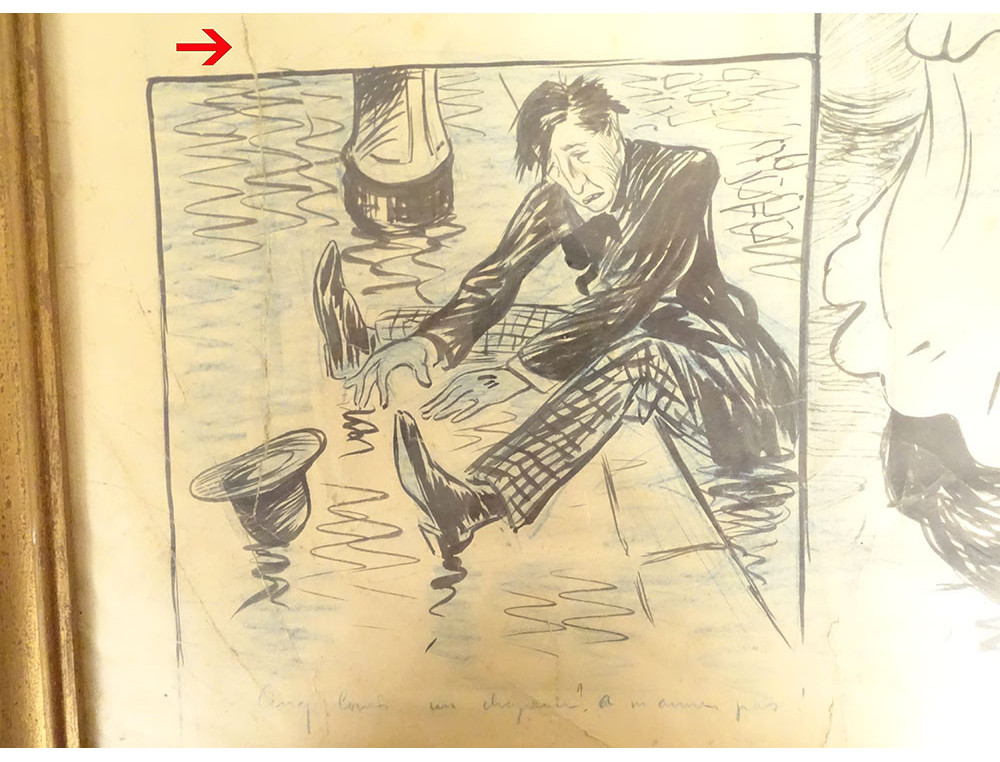 Drawing signed Poulbot* representing a humorous naughty scene, with a couple in a bedroom interior, entitled "Ordonnance de non-lieu" and at the bottom "Tell him that his honor will be safe", in a gilded frame, from the early 20th century.