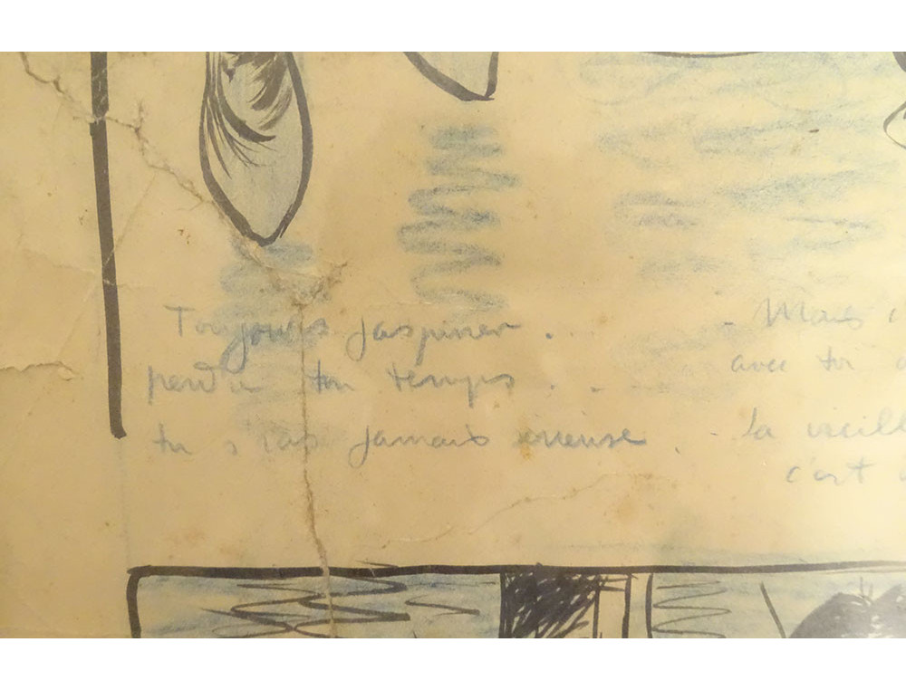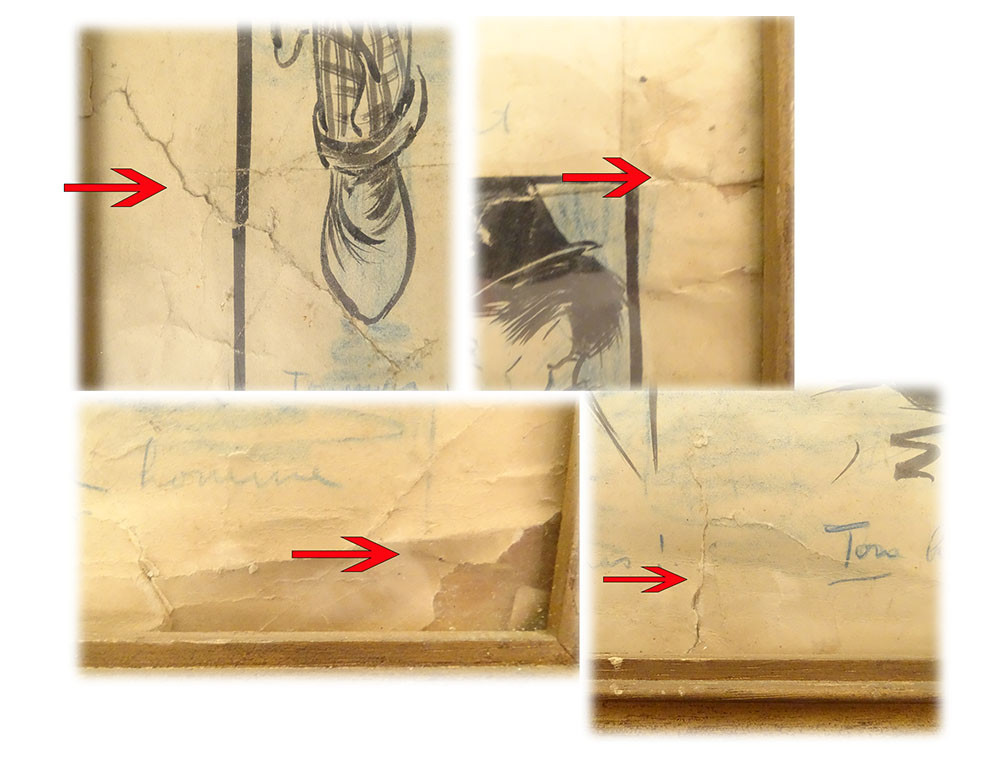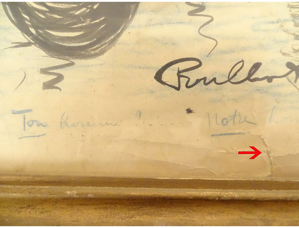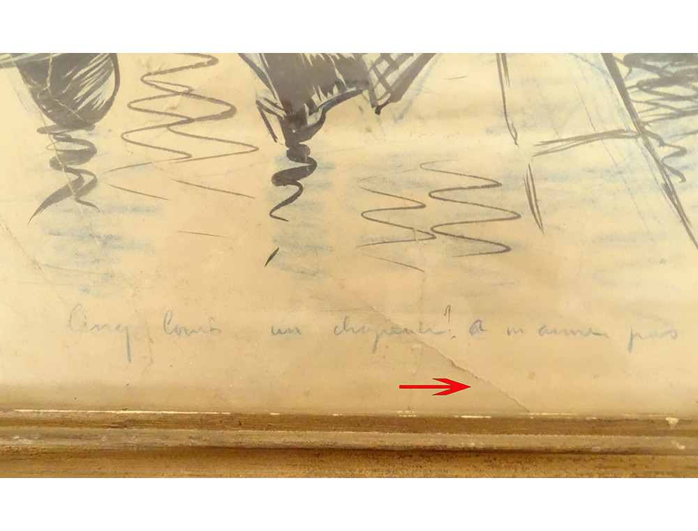 Please note: some accidents and losses on the frame, some stains and blue marks on the paper, wear and tear, see photos.