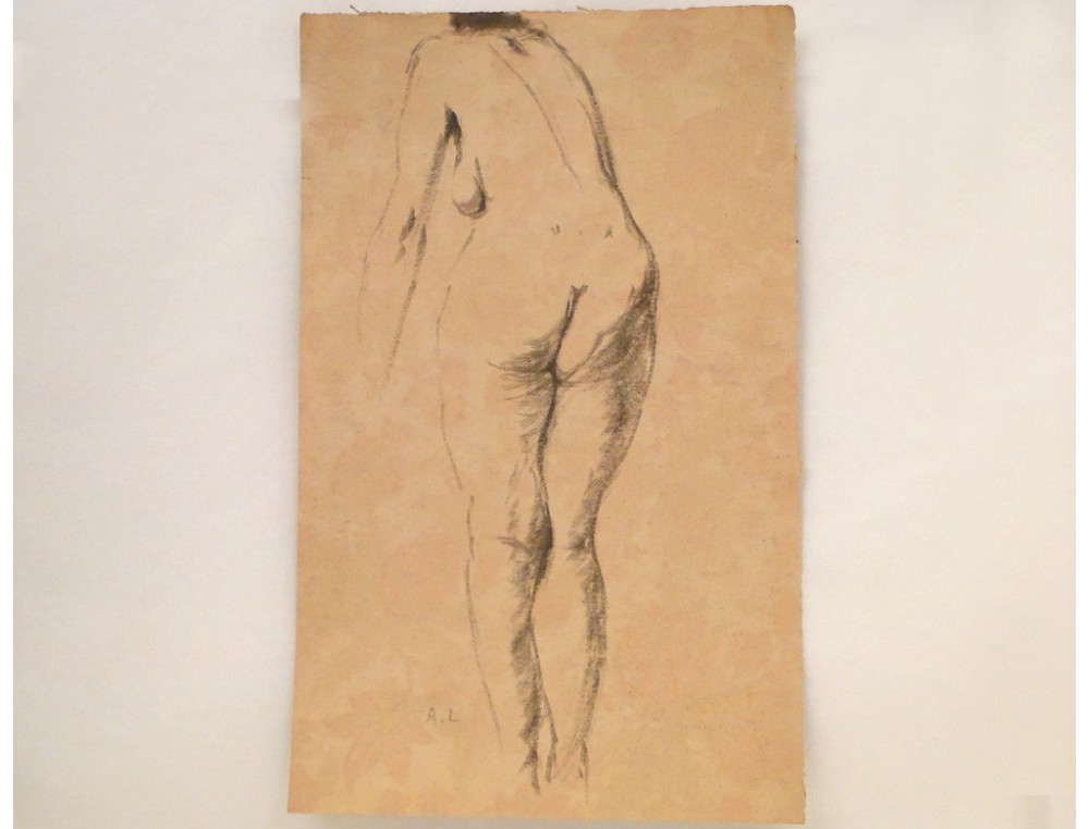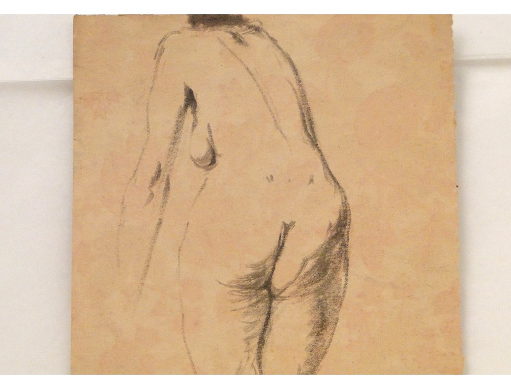 Very nice drawing Laigneau André Villeneuve * representing a study of a nude woman seen from behind, carried out on a sample of wallpaper stencil decorated and colorful flowering branches certainly the manufacture ** Paul Dumas, vintage twentieth century .
