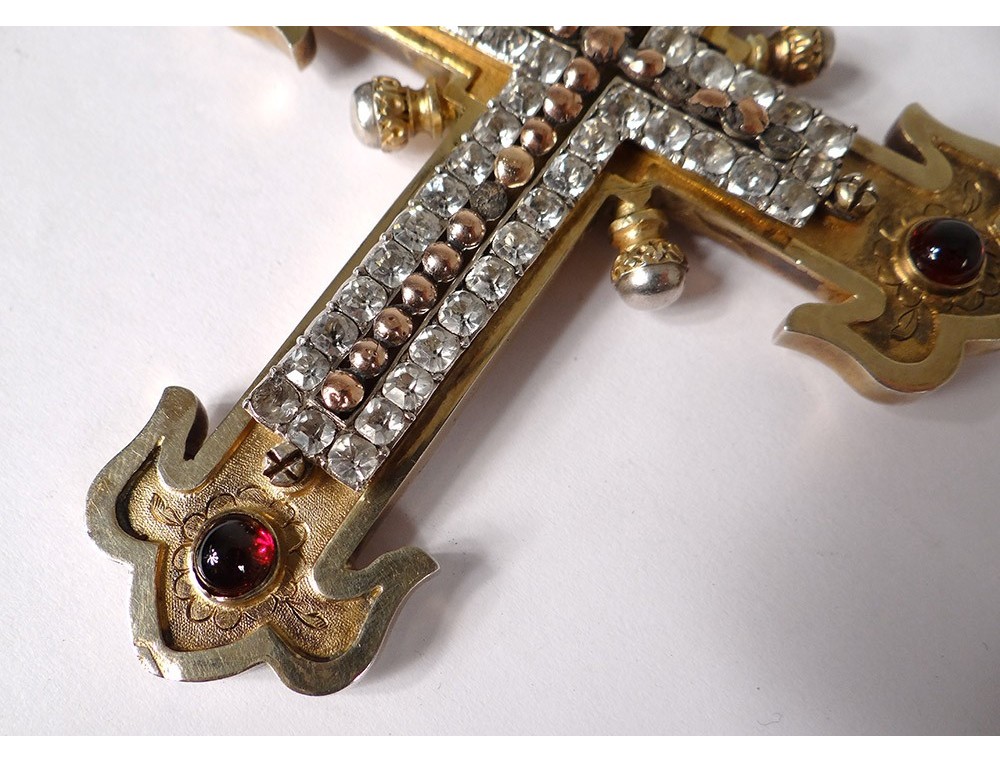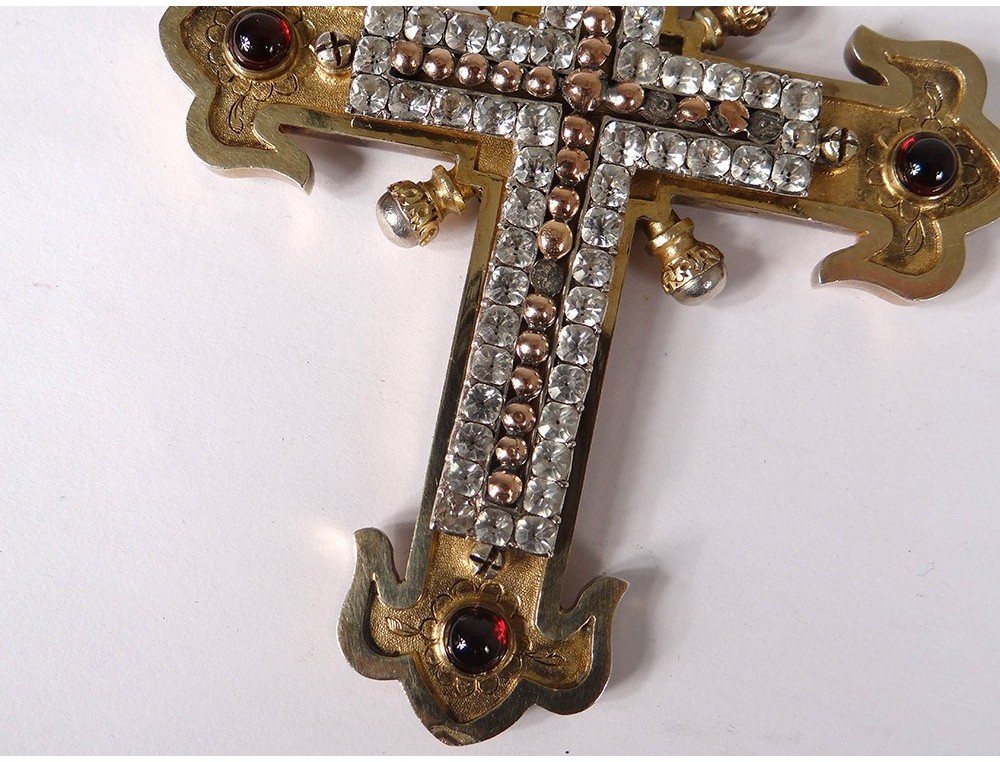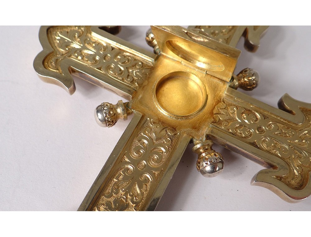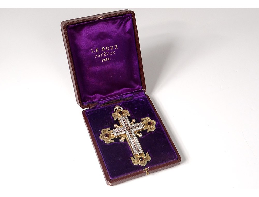 Prelatice * pectoral cross of a bishop forming a reliquary (for the True Cross) in finely chiseled silver with a floral motif decoration, ends set with garnets, in the center a smaller cross in Rhine stones, hallmarked Minerva (1st title) and hallmark goldsmith Le Roux **, in its original box, vintage late nineteenth and early twentieth centuries.