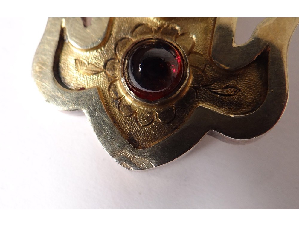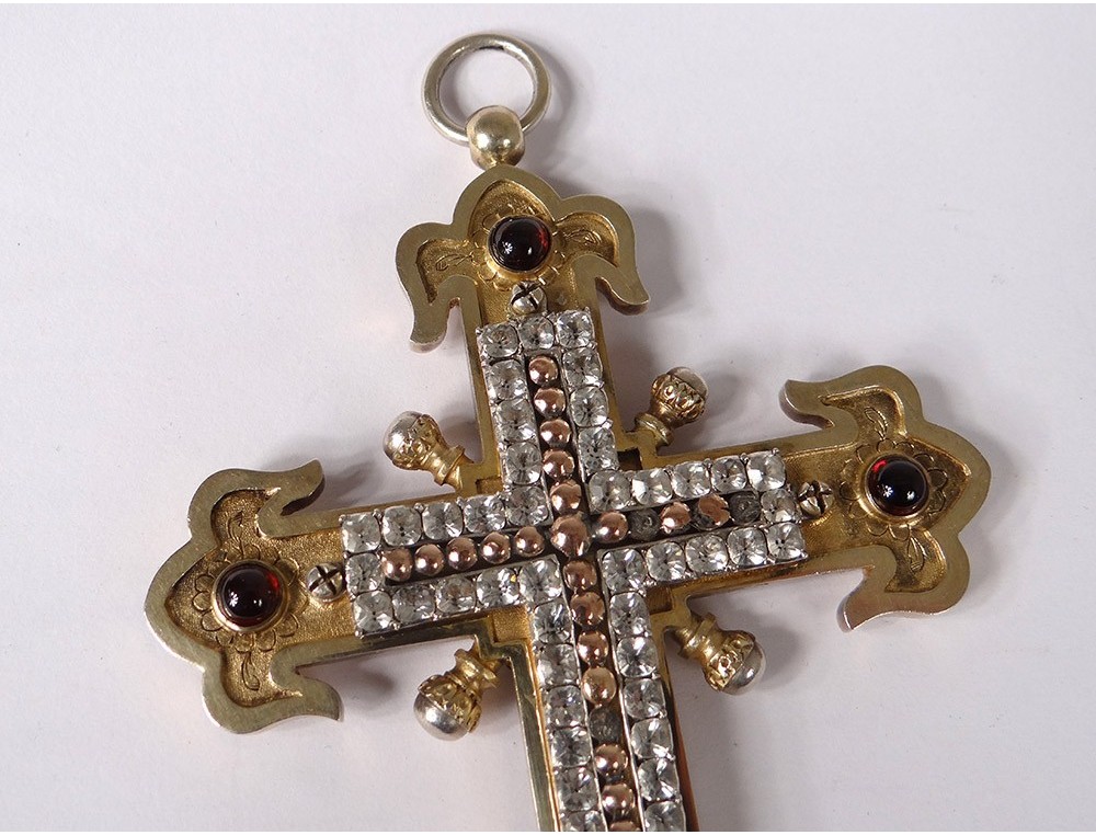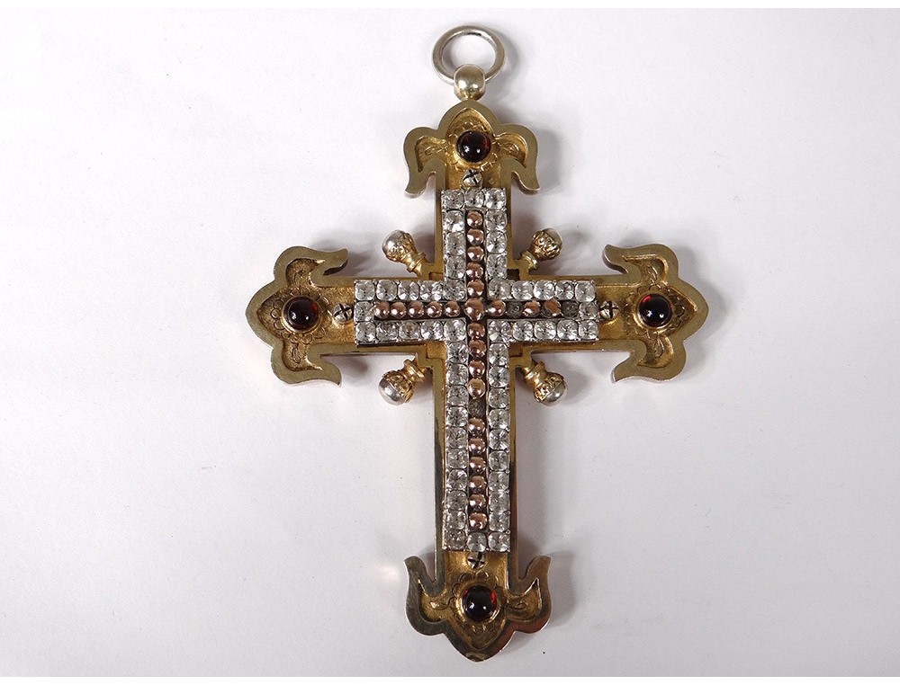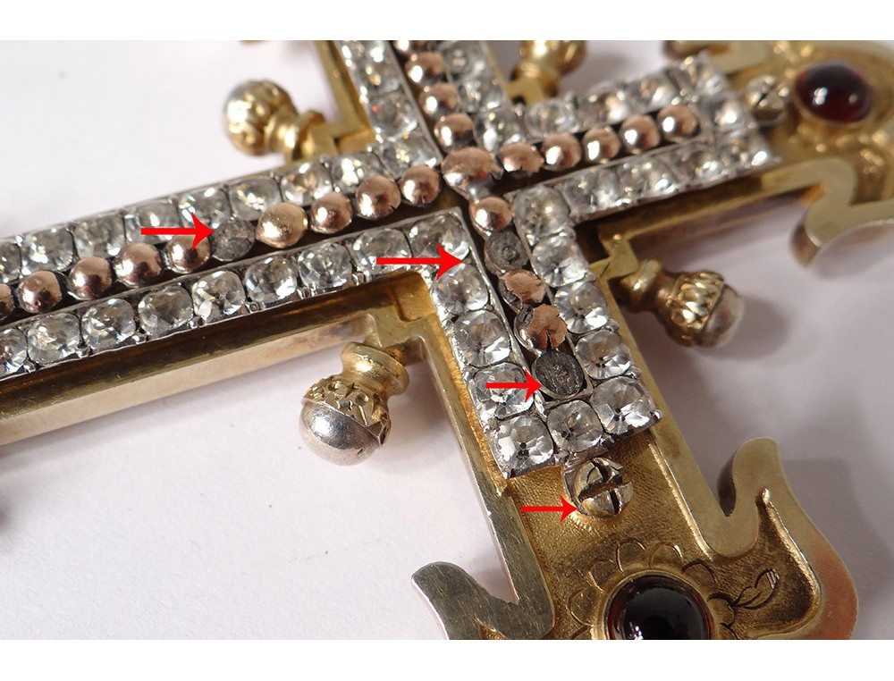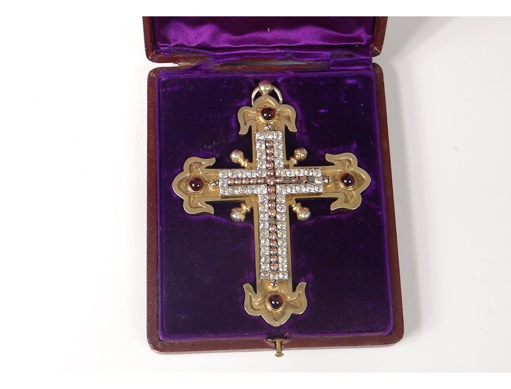 Prelatice * pectoral cross of a bishop forming a reliquary (for the True Cross) in finely chiseled silver with a floral motif decoration, ends set with garnets, in the center a smaller cross in Rhine stones, hallmarked Minerva (1st title) and hallmark goldsmith Le Roux **, in its original box, vintage late nineteenth and early twentieth centuries.