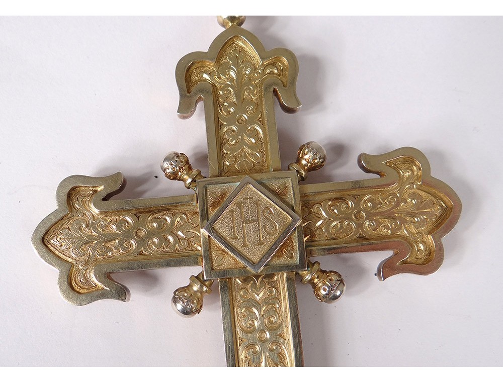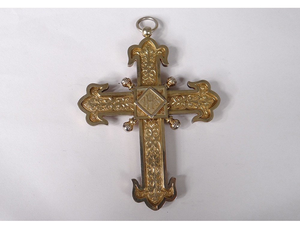 of Latin form, shaped in precious metal. Insignia of ecclesiastical dignity, it is not a sign of jurisdiction. The prelate wears it either on the town dress or with the choir dress. The cross carried during a Mass usually contains a relic of the True Cross. (Excerpt Dictionary of the Liturgical Arts of Berthod and Hardouin-Fugier).