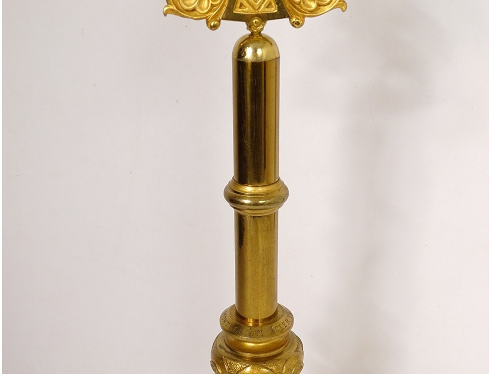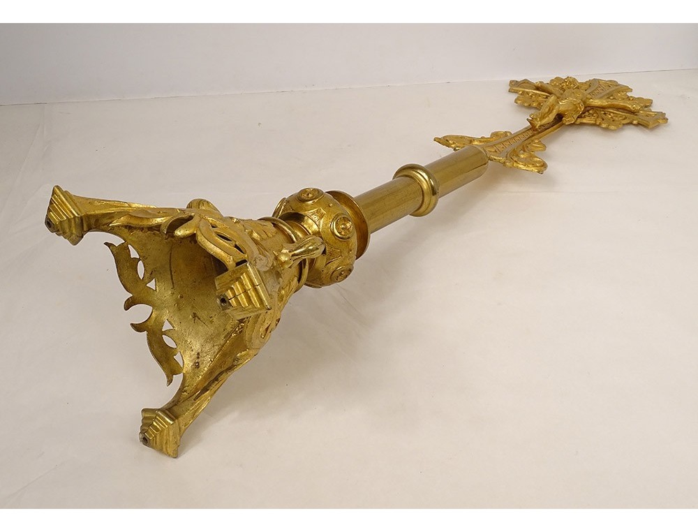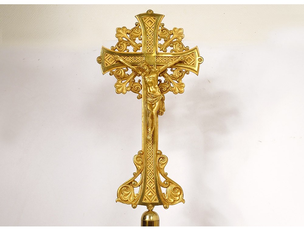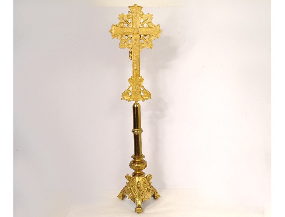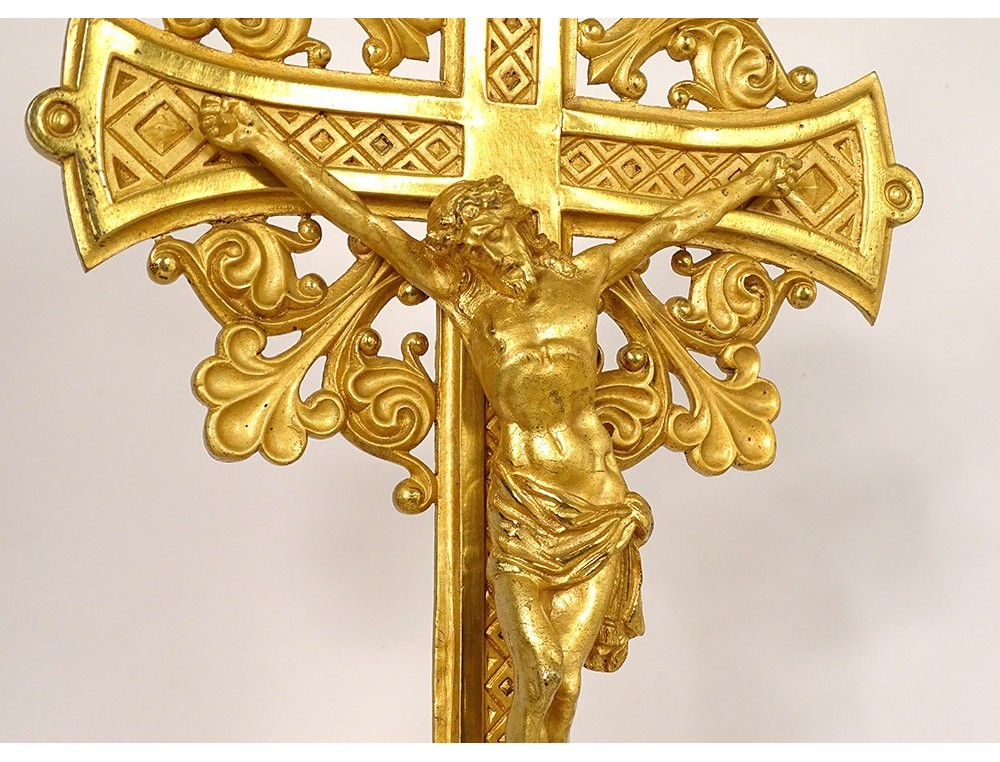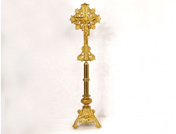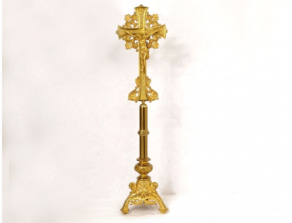 Large altar cross in finely chiseled gilded bronze, decorated with Christ crucified on a cross with a stylized motif surrounded by foliage, tripod base with plant motif, inscription Montserrat Soler Y Cabot 1 Junio 1916, vintage early twentieth century.