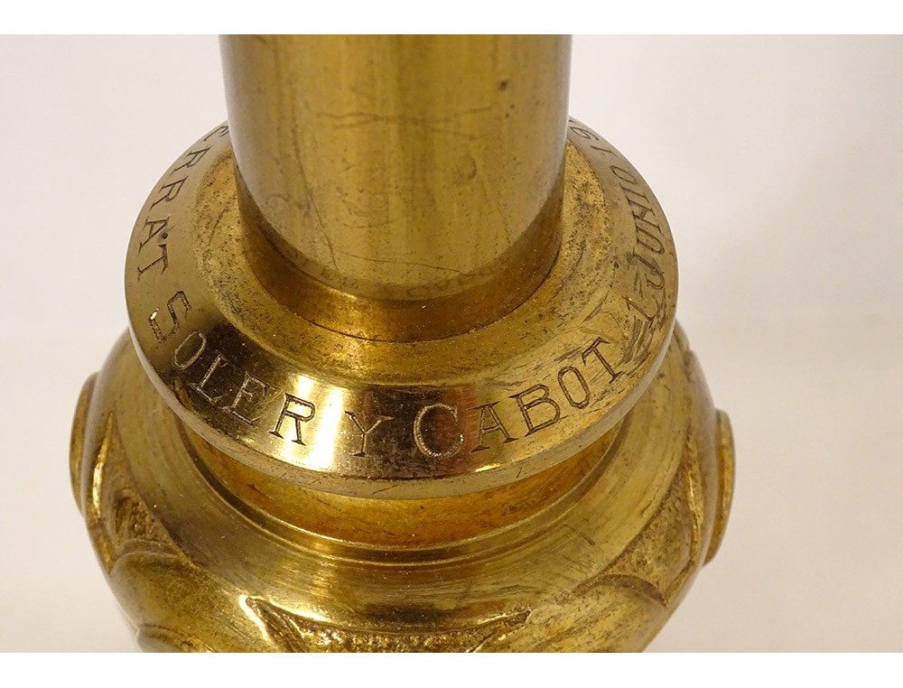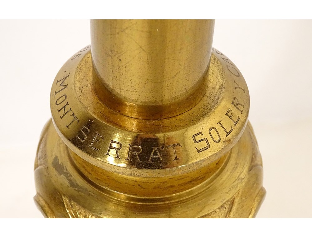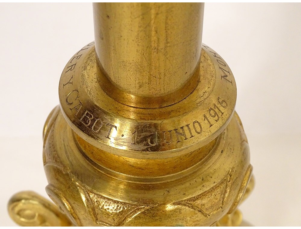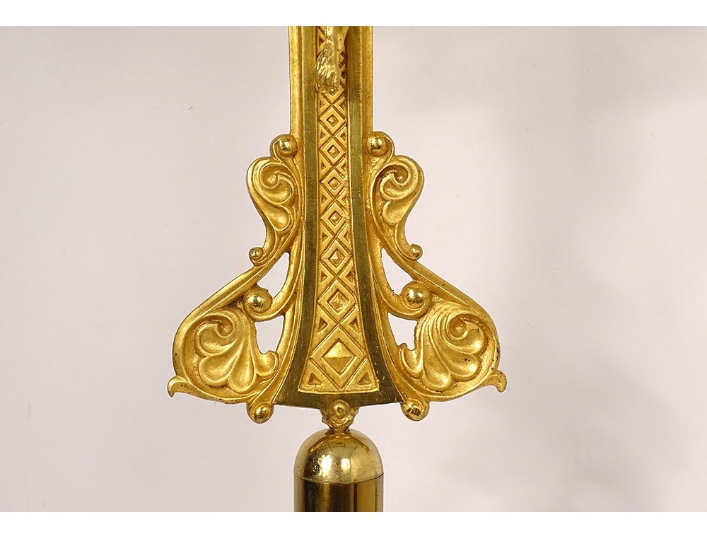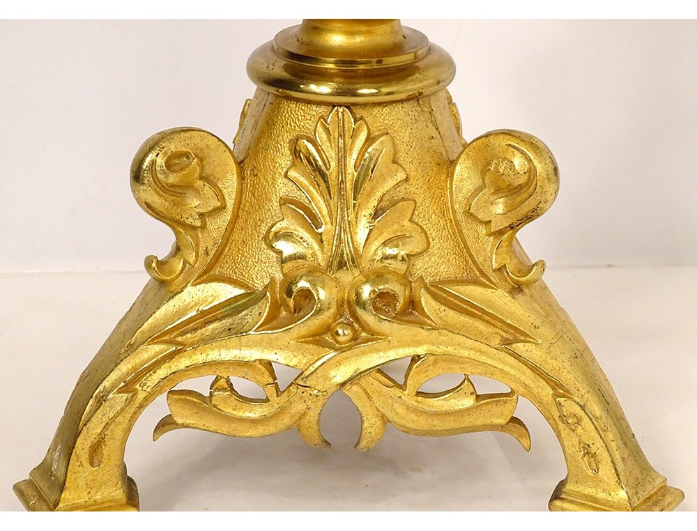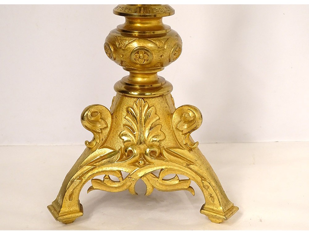 Large altar cross in finely chiseled gilded bronze, decorated with Christ crucified on a cross with a stylized motif surrounded by foliage, tripod base with plant motif, inscription Montserrat Soler Y Cabot 1 Junio 1916, vintage early twentieth century.