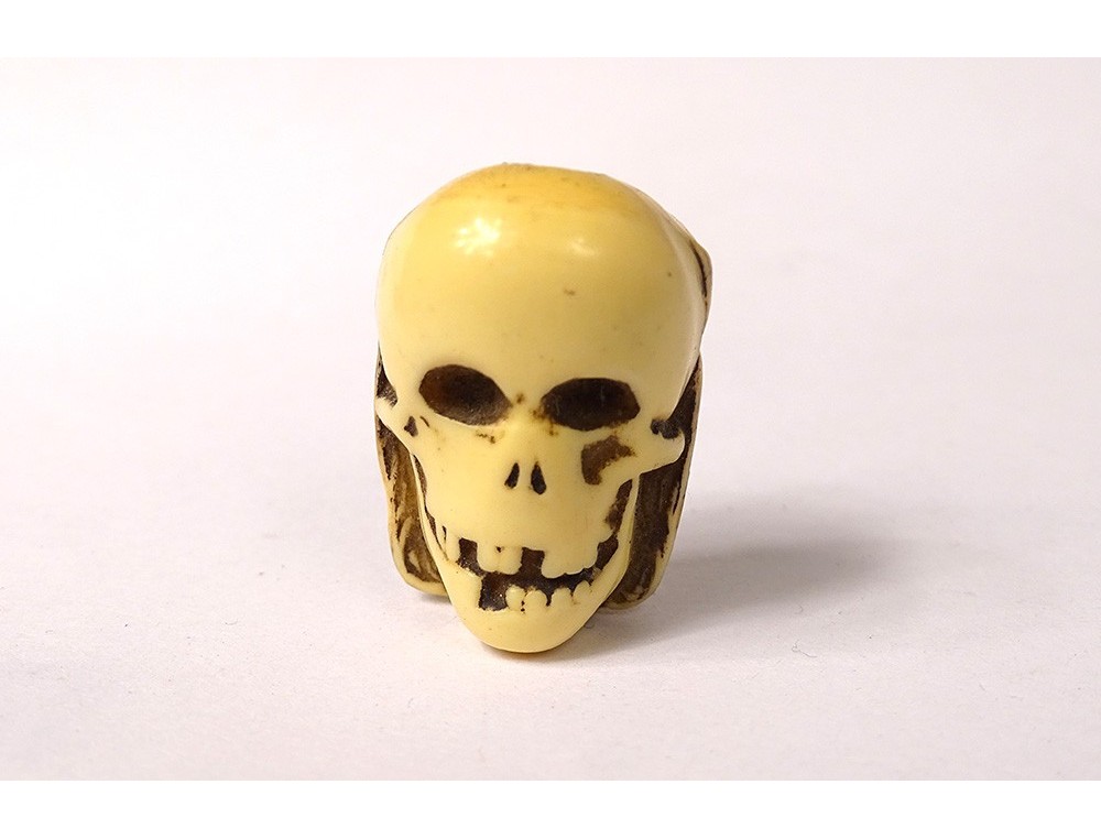 Finely carved bone (beef) rosary grain representing a head of Christ and a Vanity, from the 19th century.