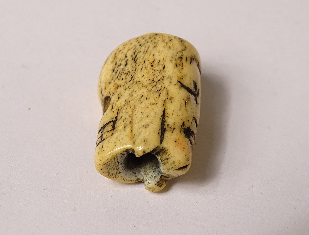 Finely carved bone (beef) rosary grain representing a head of Christ and a Vanity, from the 19th century.