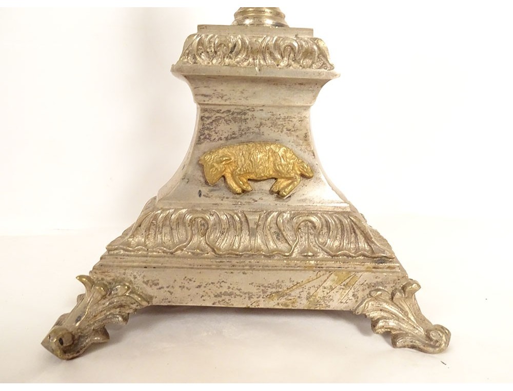 Gilded and silvered bronze altar crucifix, decorated with Christ radiating on the cross, above him an angel holds an INRI headband, ends of the cross decorated with bunches of grapes and vine leaves, on the foot the Pascal Lamb, leafy base, from the 19th century.